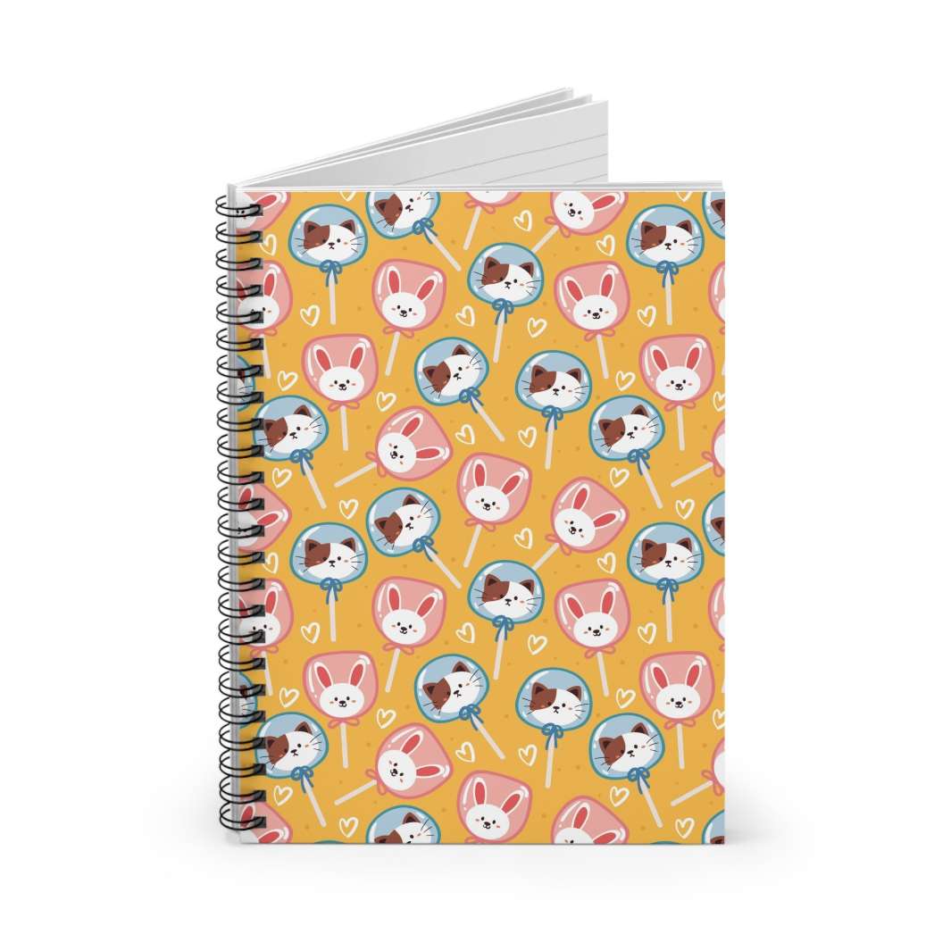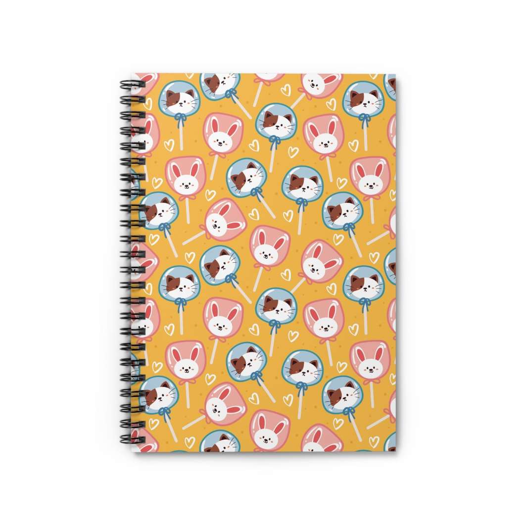 Indulge in a deliciously sweet and irresistibly cute accessory with our Candy Cat Spiral Notebook! This purr-fectly adorable notebook will whisk you away to a world of whimsy and charm with its dark yellow background adorned with little white hearts. But that's not all - prepare for a delightful surprise as you feast your eyes on the brown and white cartoon cat head nestled inside a blue lollipop! And if that wasn't enough to melt your heart, a white rabbit head peeks out of a pink lollipop to greet you.