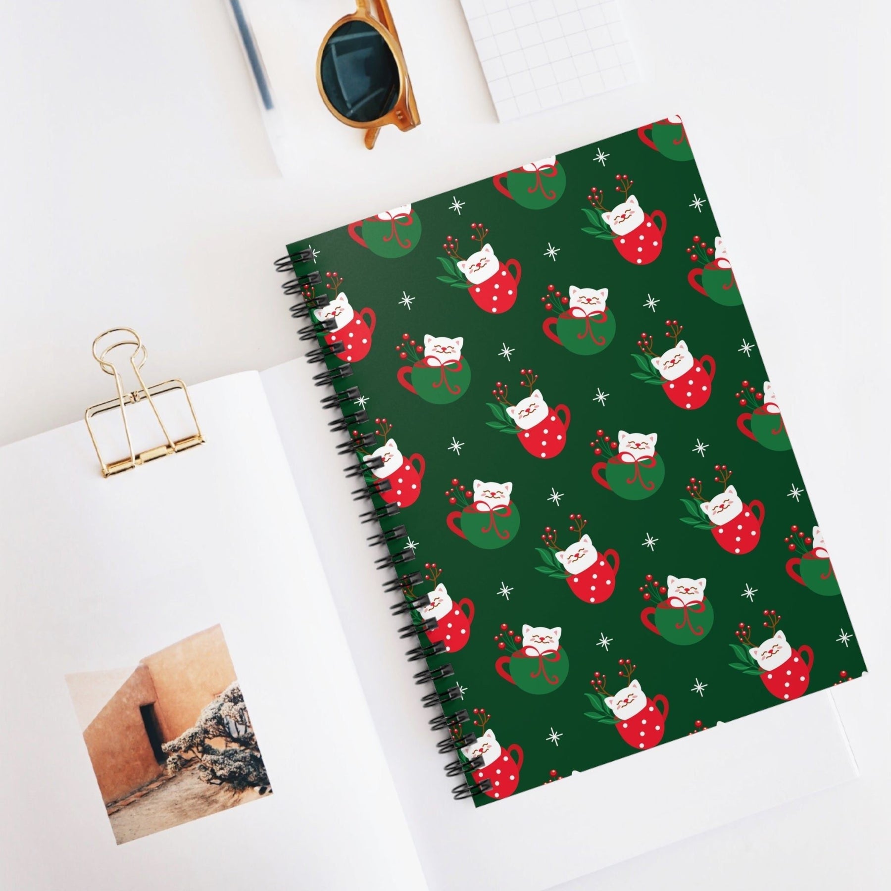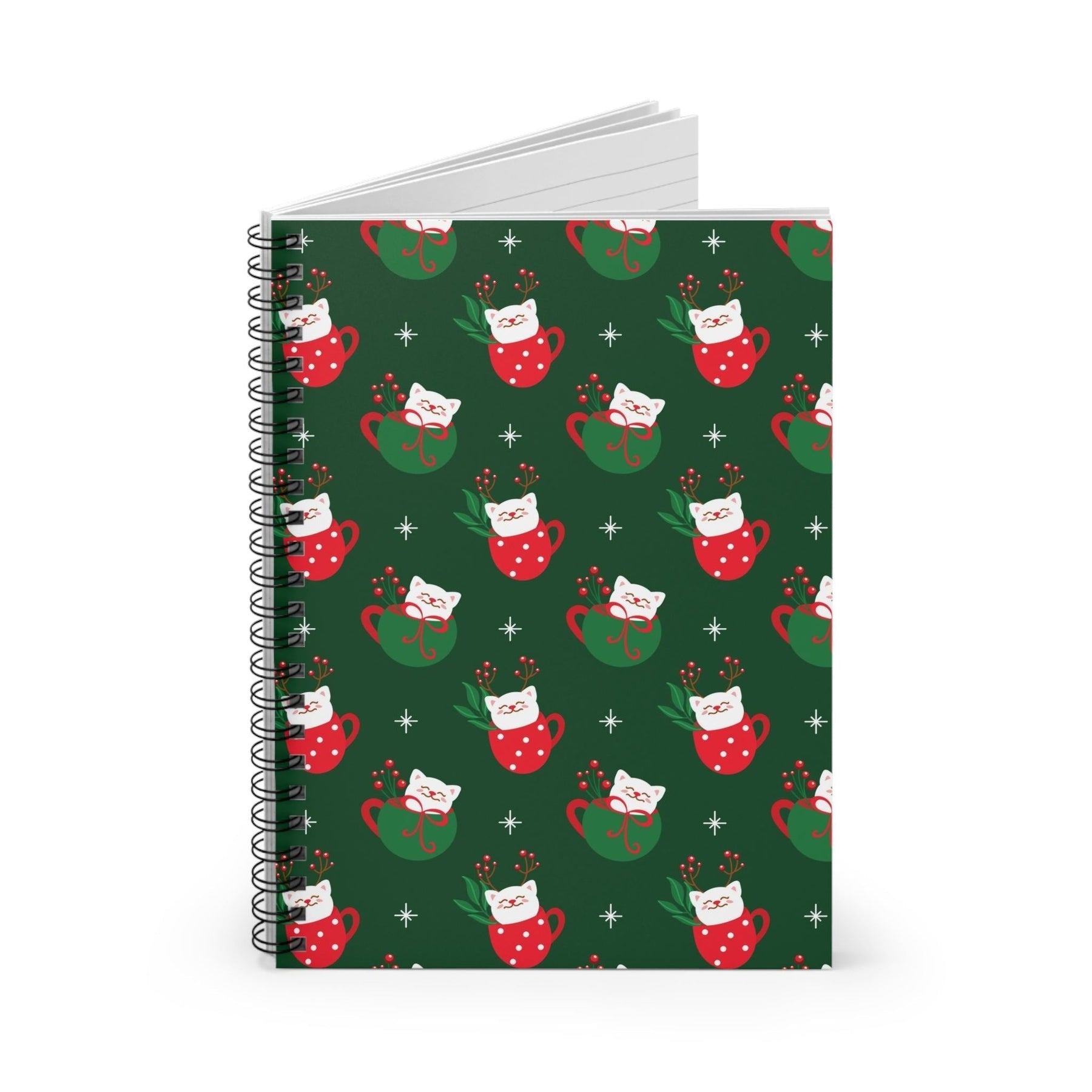 Now, let's talk about the design. Picture this: a vibrant, dark green backdrop just like the lush Christmas tree in your living room. Adorned all over are whimsical white cartoon cats, each cozily cuddled up in their very own green and red coffee cups, complete with adorable little paws peeking out. All we can say is, "Meow-gnificent!" This playful and festive imagery is bound to bring a smile to your face every time you crack open this notebook.
