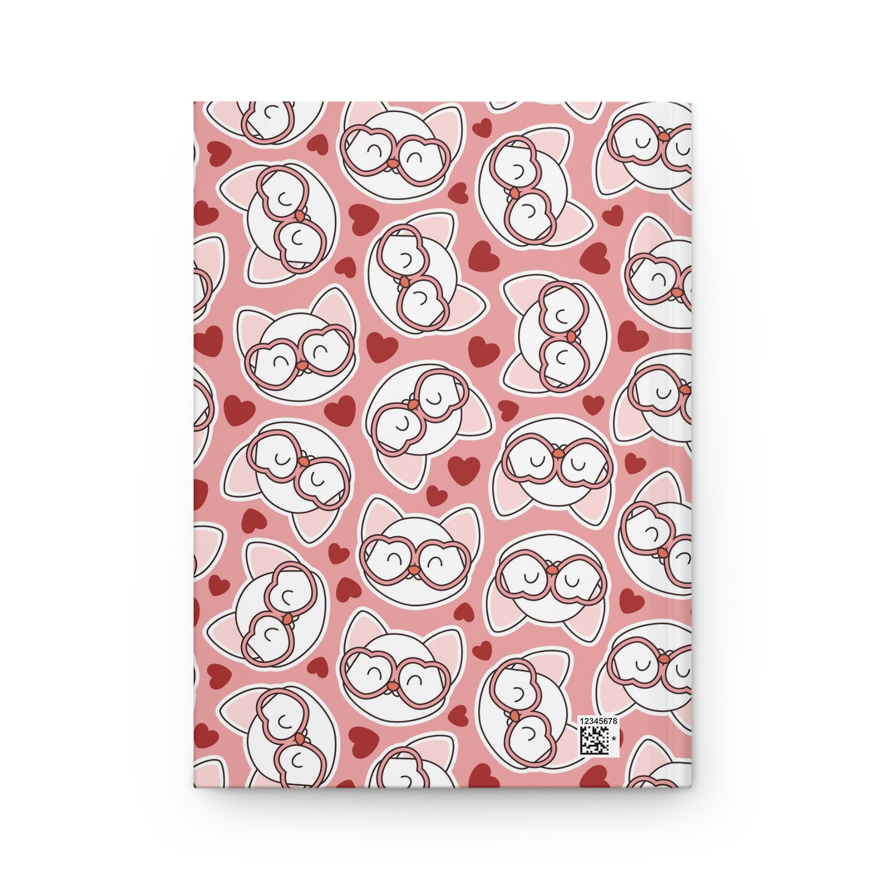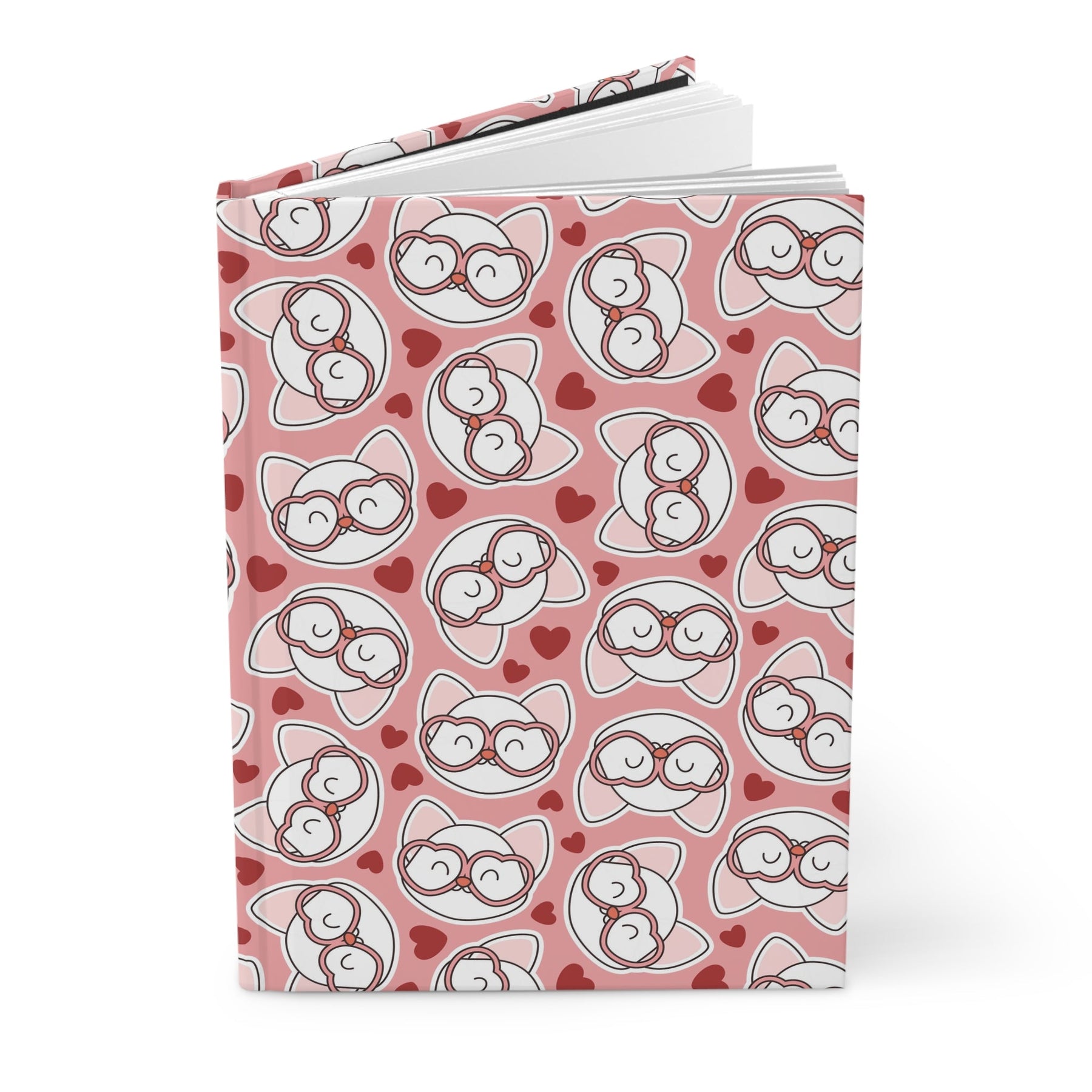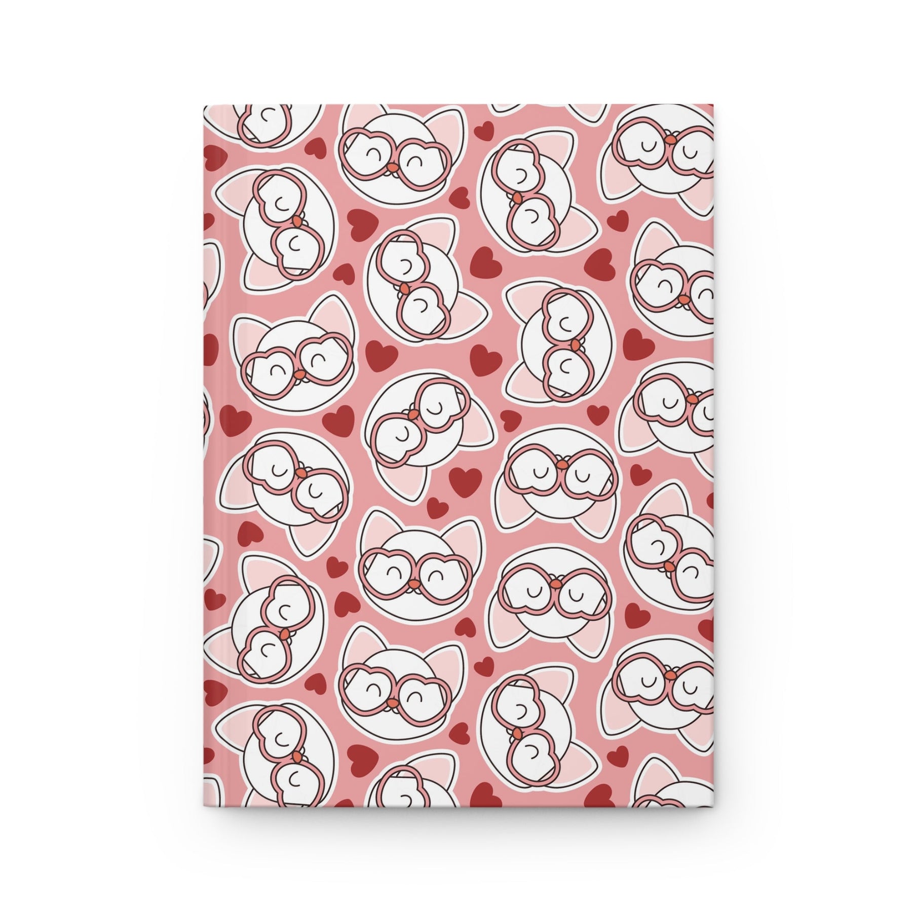 Introducing the purrfect companion for all your thoughts and musings, the Cat in Heart Glasses Hardcover Journal! This charming journal features a vibrant pink background adorned with adorable white cartoon cat heads, each sporting a pair of chic pink heart glasses. And as if that wasn't cute enough, the cover is sprinkled with tiny, love-filled red hearts, adding an extra dose of charm to your writing experience.