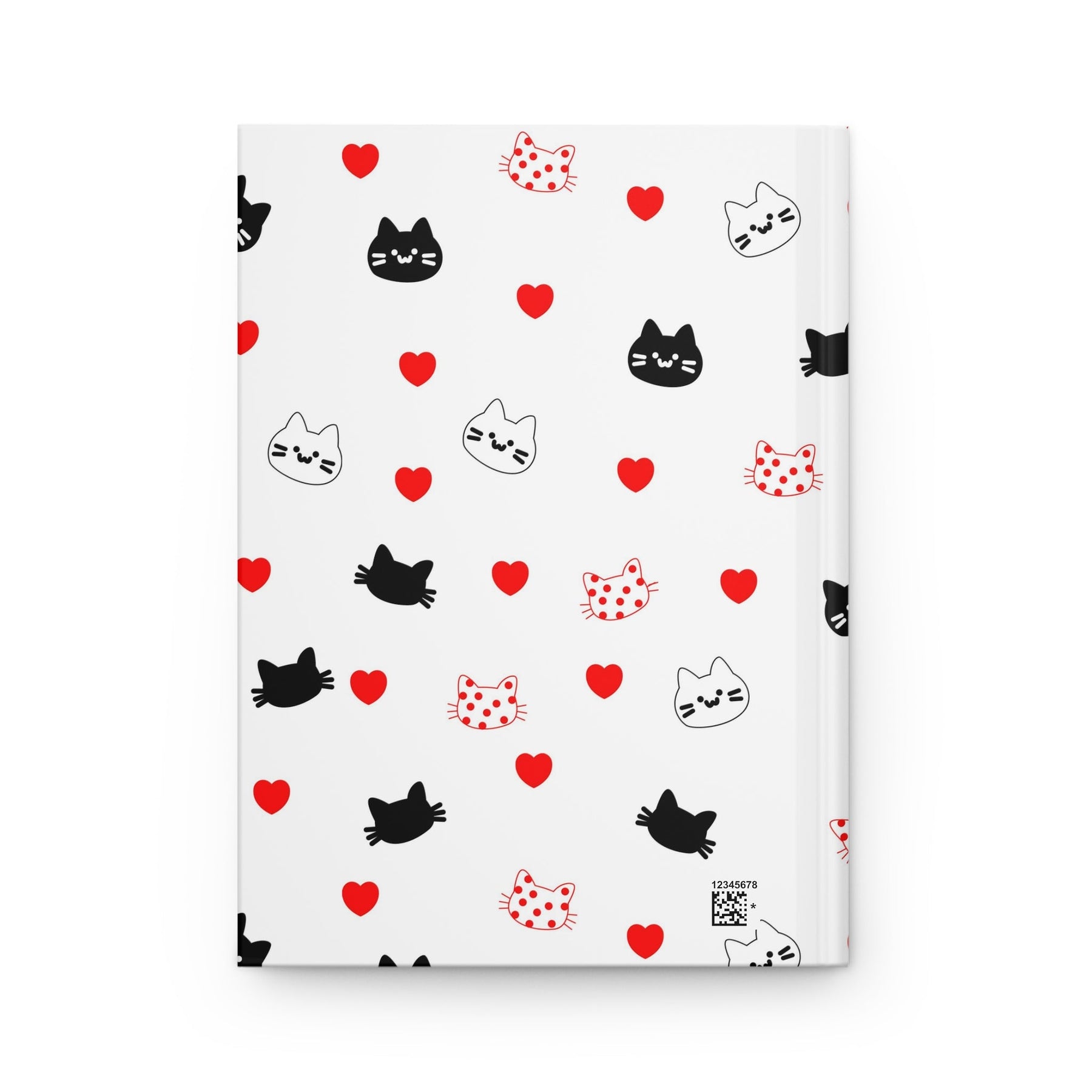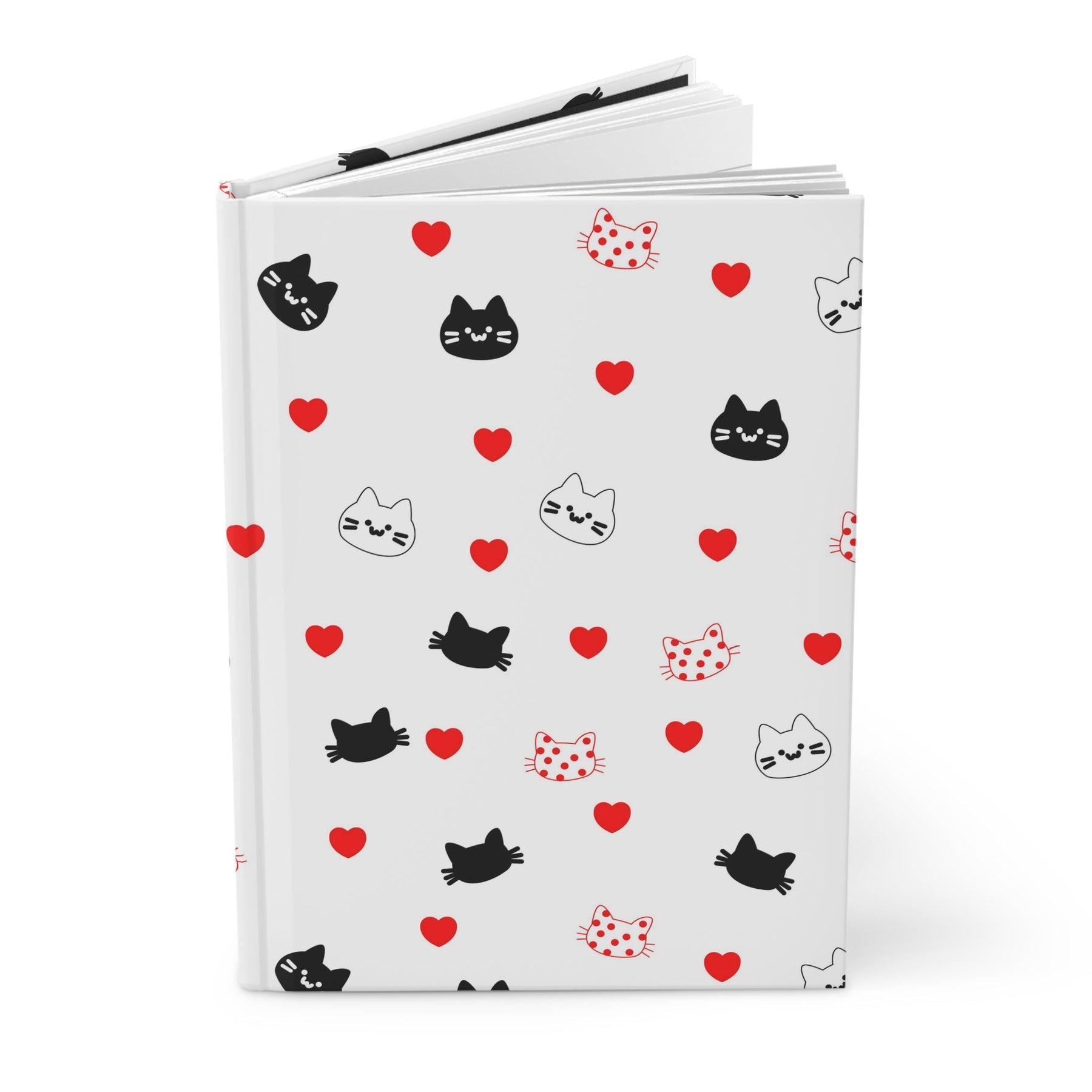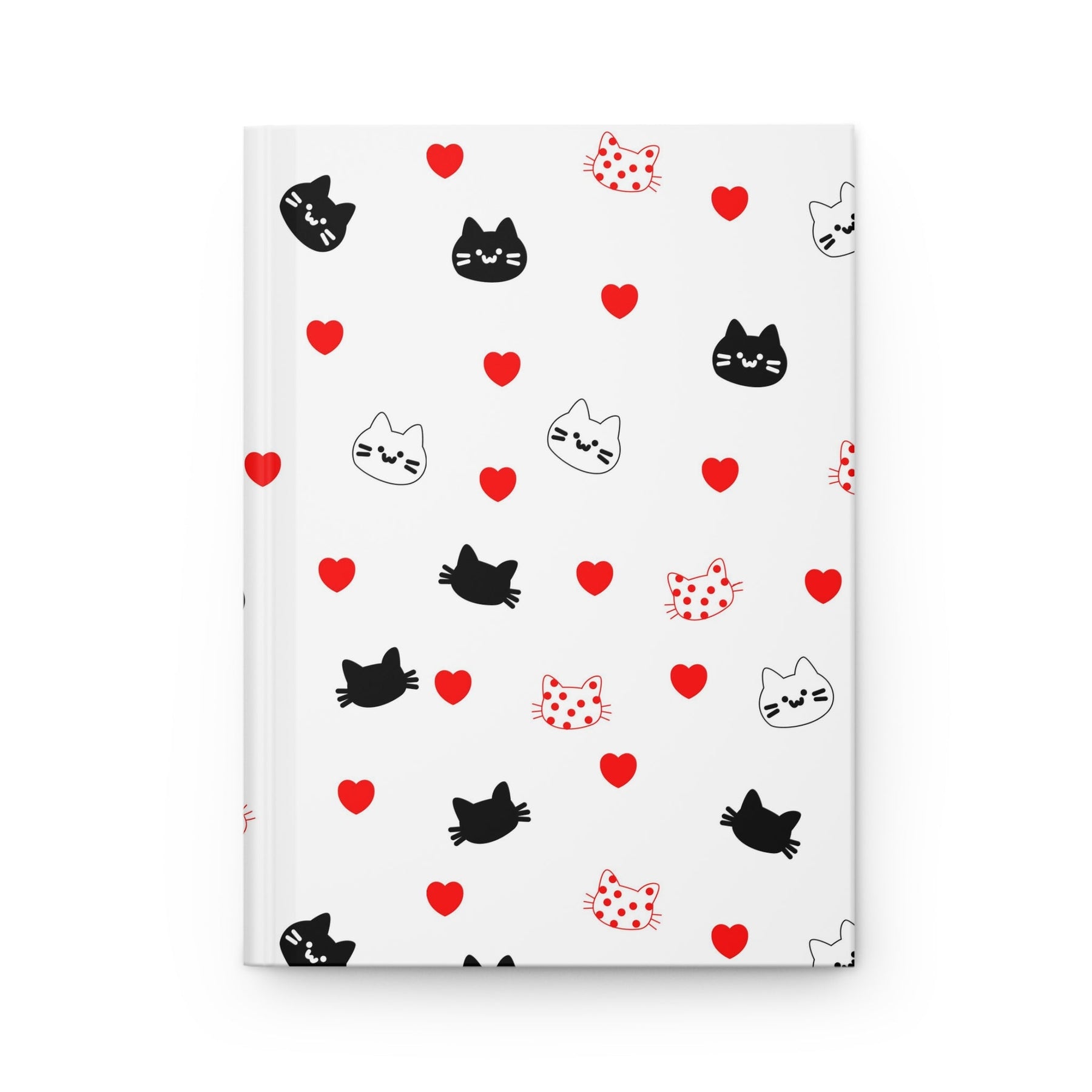 Blending elegance with whimsy, the Cat Lover Hardcover Journal boasts a clean white background adorned with adorable red hearts. But that's not all! Sprinkled across the cover are black and red patterned kitty cartoon faces that will melt your heart and make you feel like you're surrounded by a whole litter of mischievous feline friends.