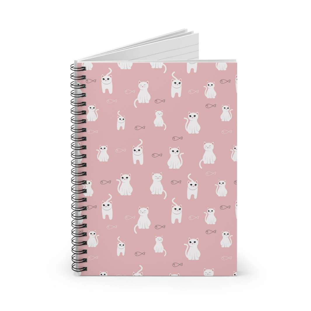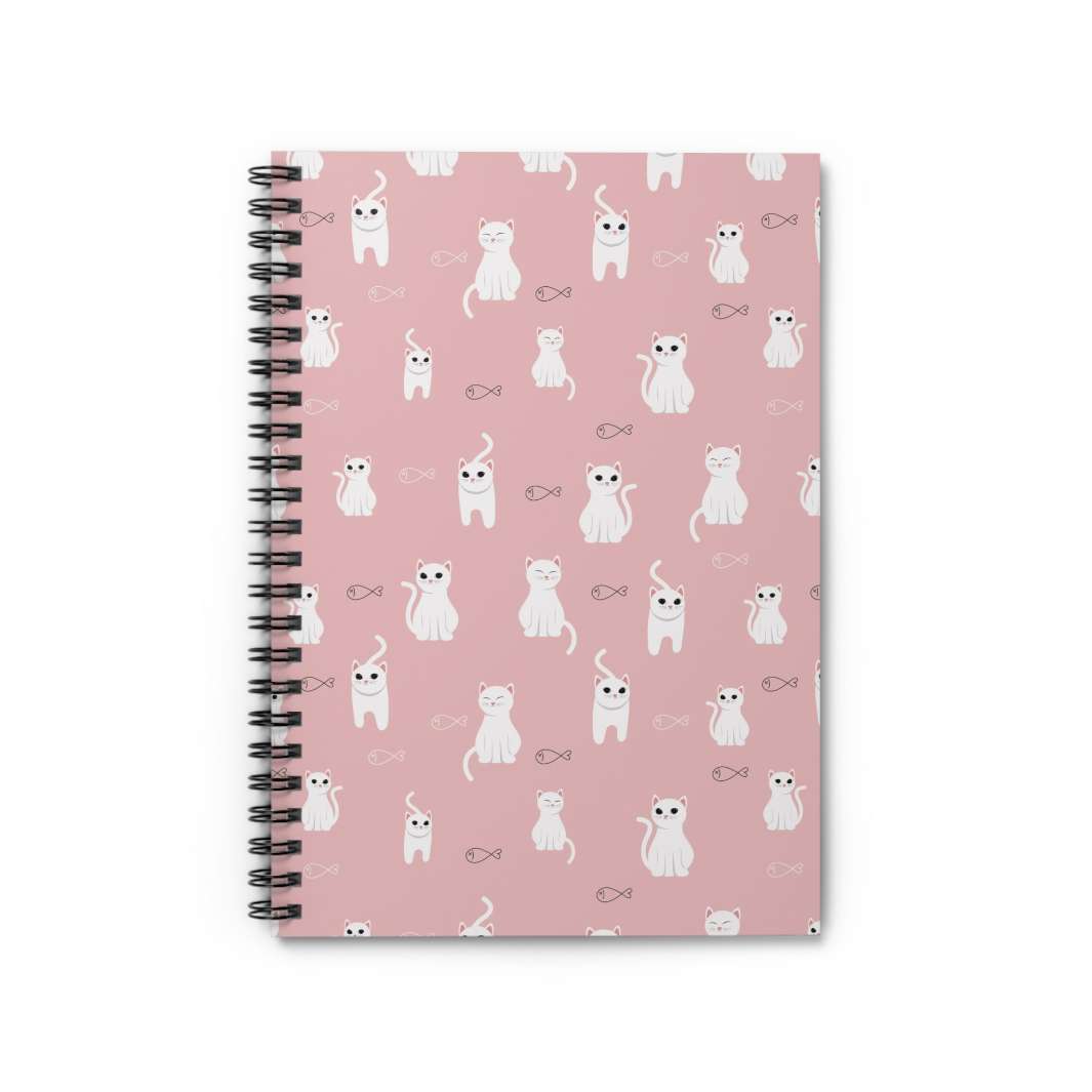 But wait, there's more! Our Cats and Fish Spiral Notebook is designed with a sleek dark grey back cover, providing a backdrop that perfectly complements the vivaciousness of the notebook's design. The contrast between the playful pink background and the adorable white cartoon cats and fish creates an eye-catching masterpiece that is sure to make you the talk of every litter-mate gathering.