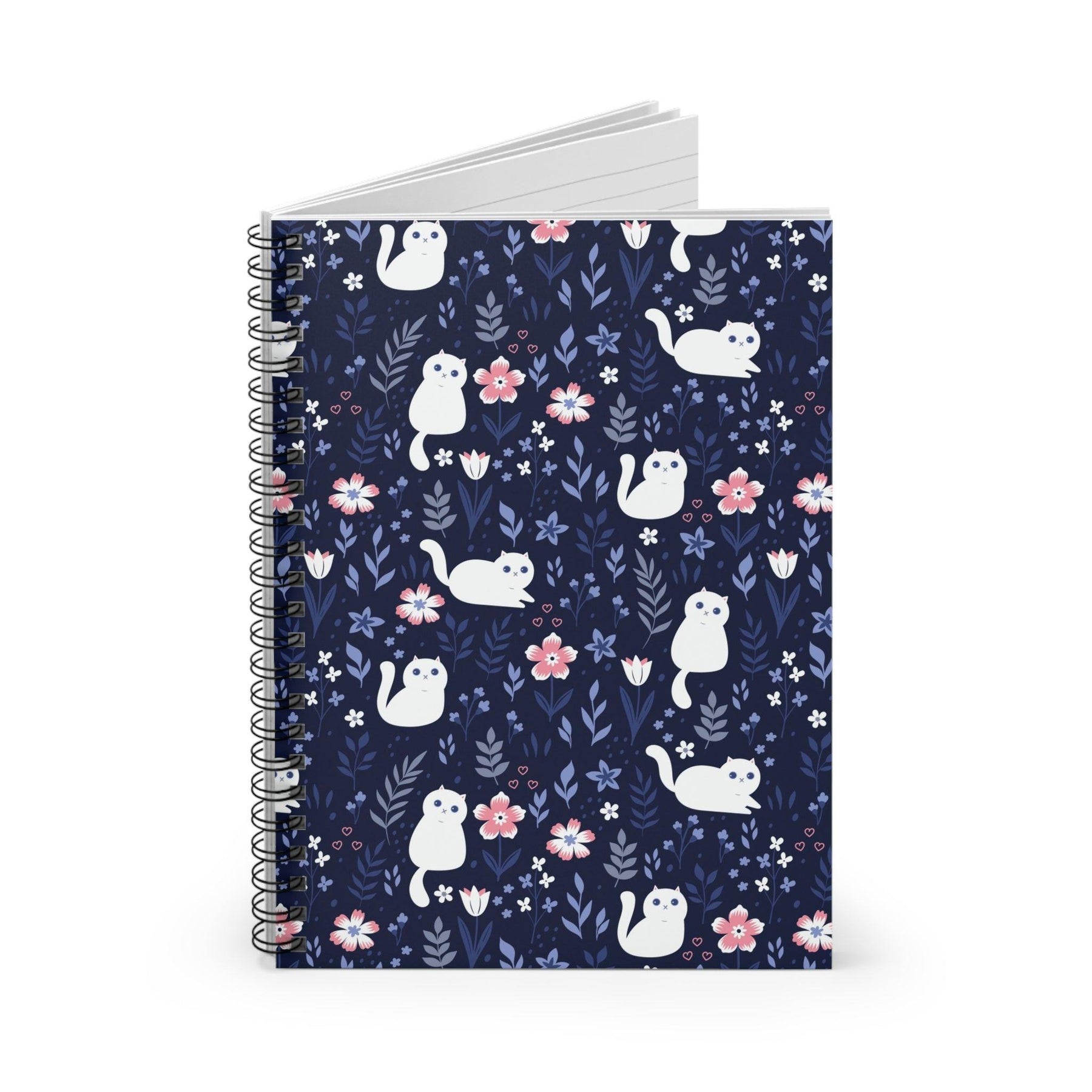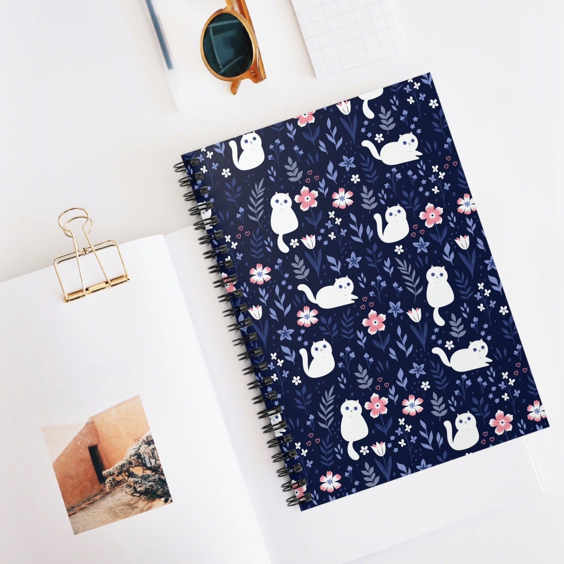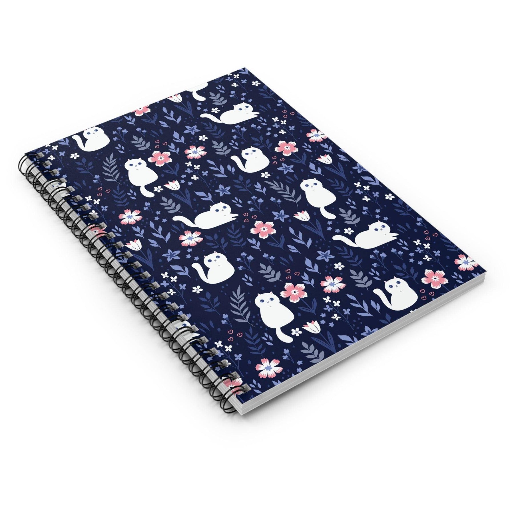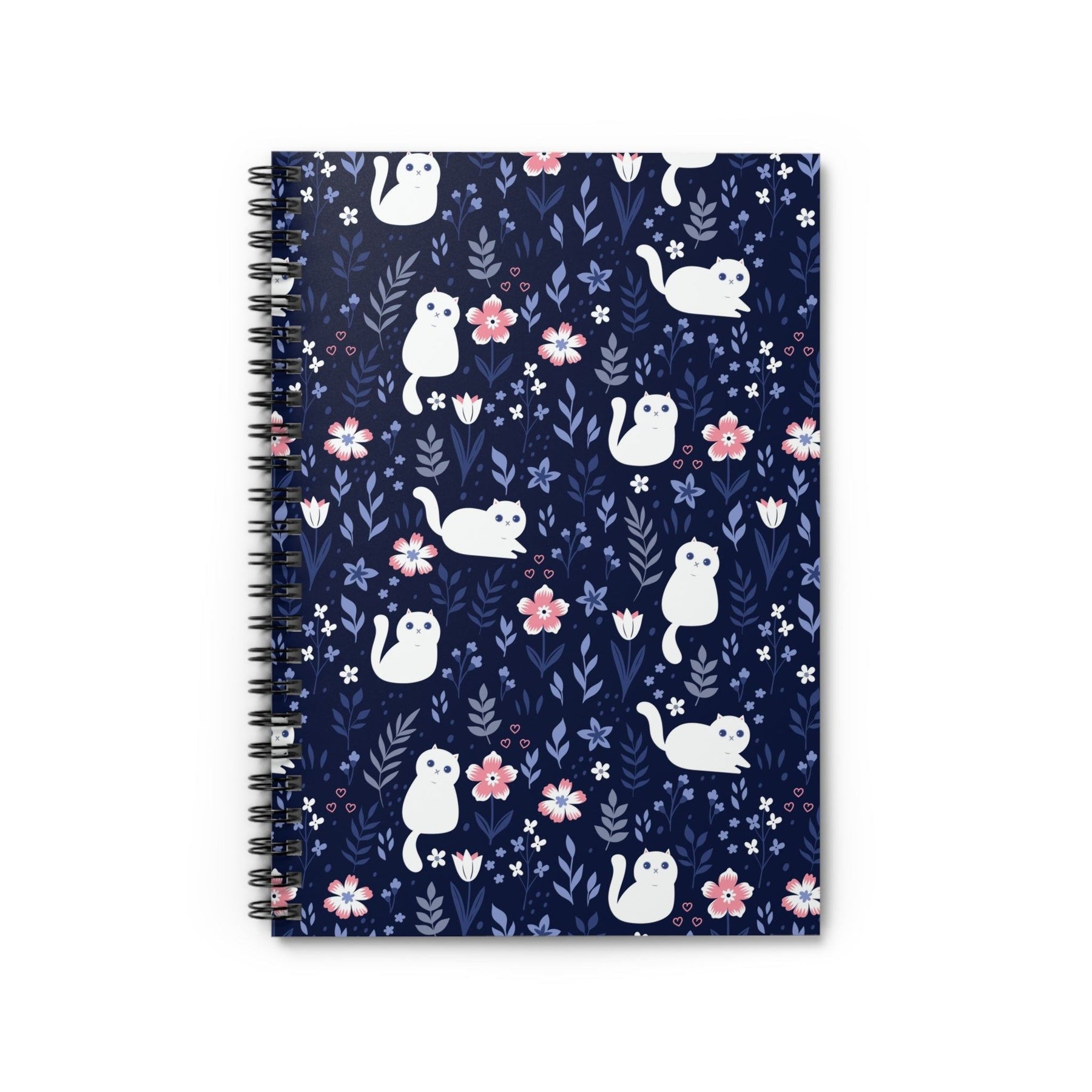Picture this: a navy blue background that's as serene as a starry night sky. Now, add in a sprinkle of folk art charm and what do you get? A notebook that will make your heart purr with delight! But wait, there's more! Our Folk Art Kitty Spiral Notebook features the sweetest white cats, dancing and prancing across its pages.