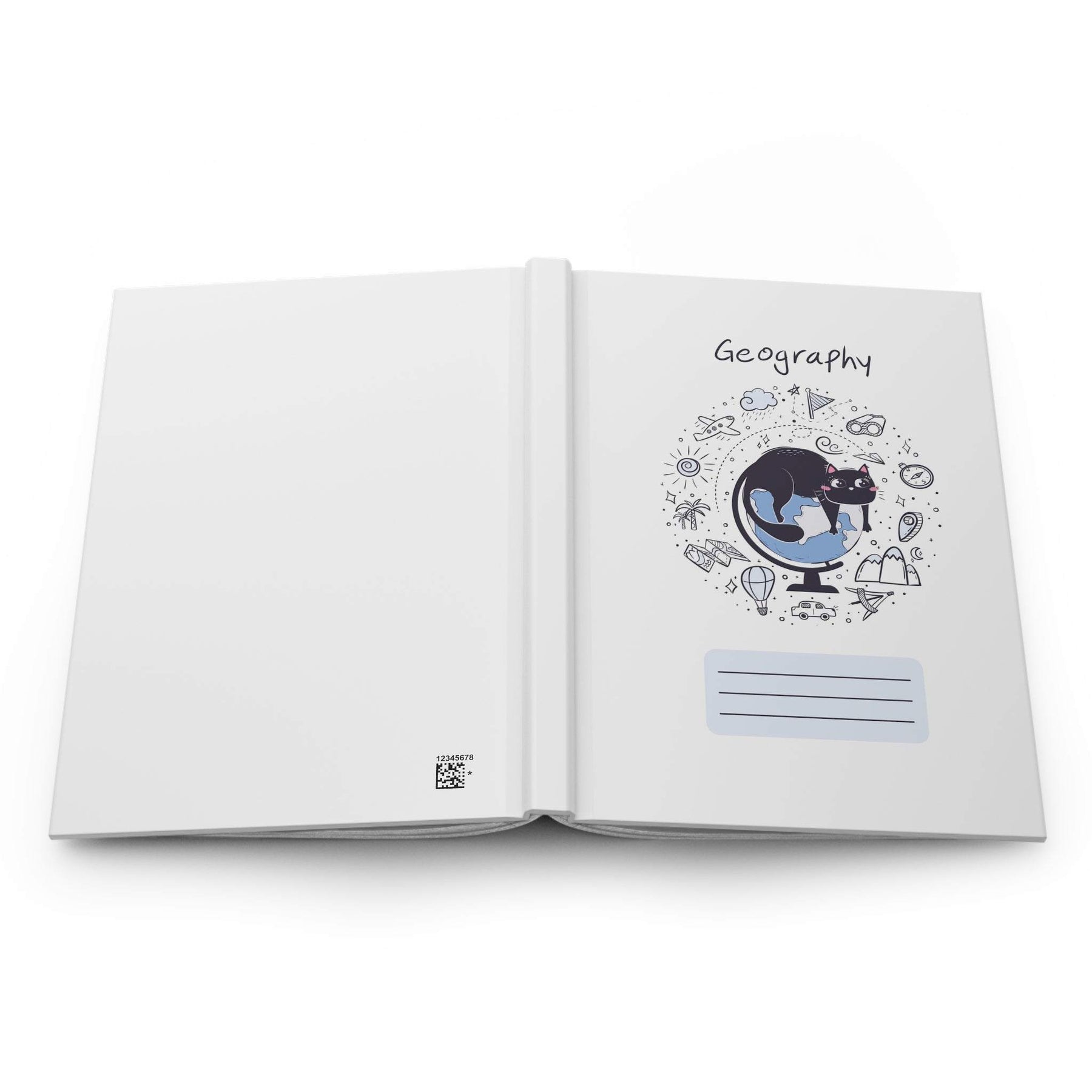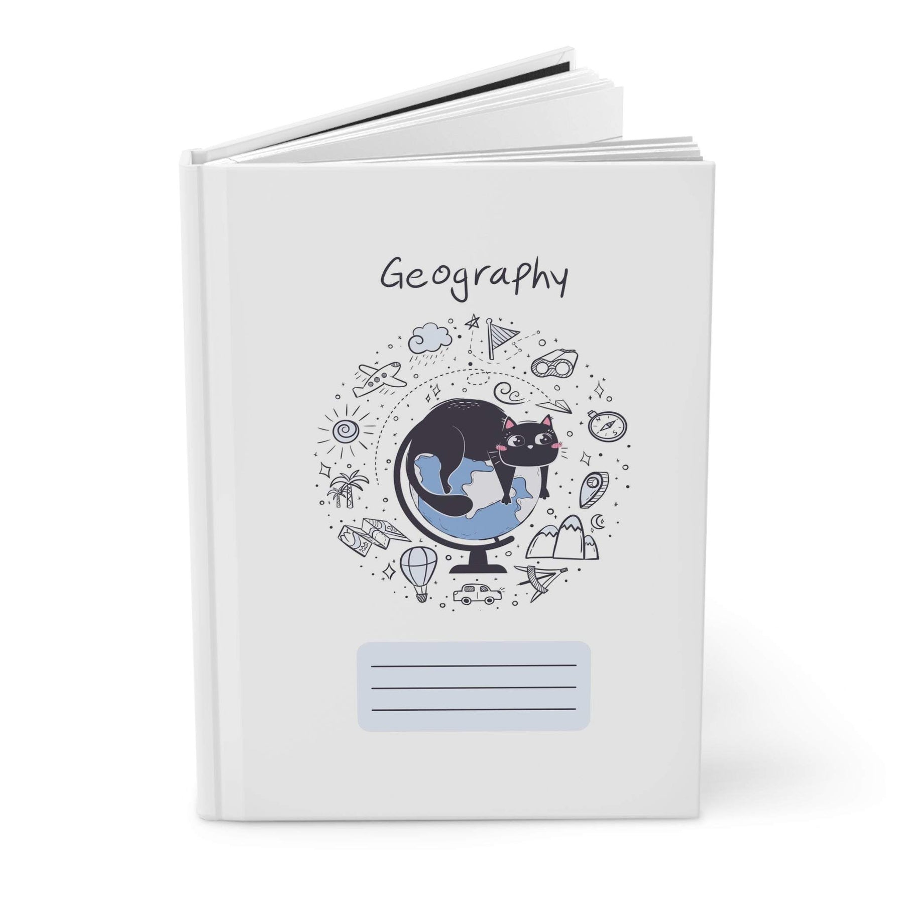 This journal has a fun white background with an adorable black cartoon cat laying on a large blue globe surrounded - letting you carry your dreams of travelling the world wherever you go. At the top it reads "Geography" so everyone knows what kind of traveler you are, and at the bottom there is a light blue box where you can write your name so it's always known who owns this awesome journal.