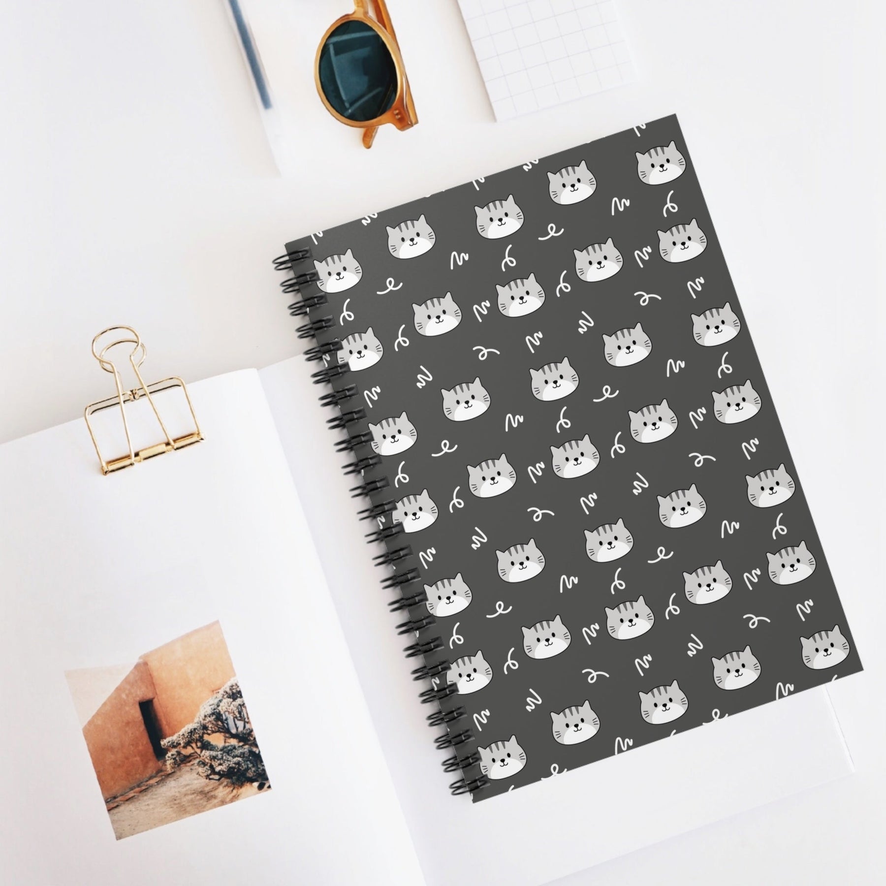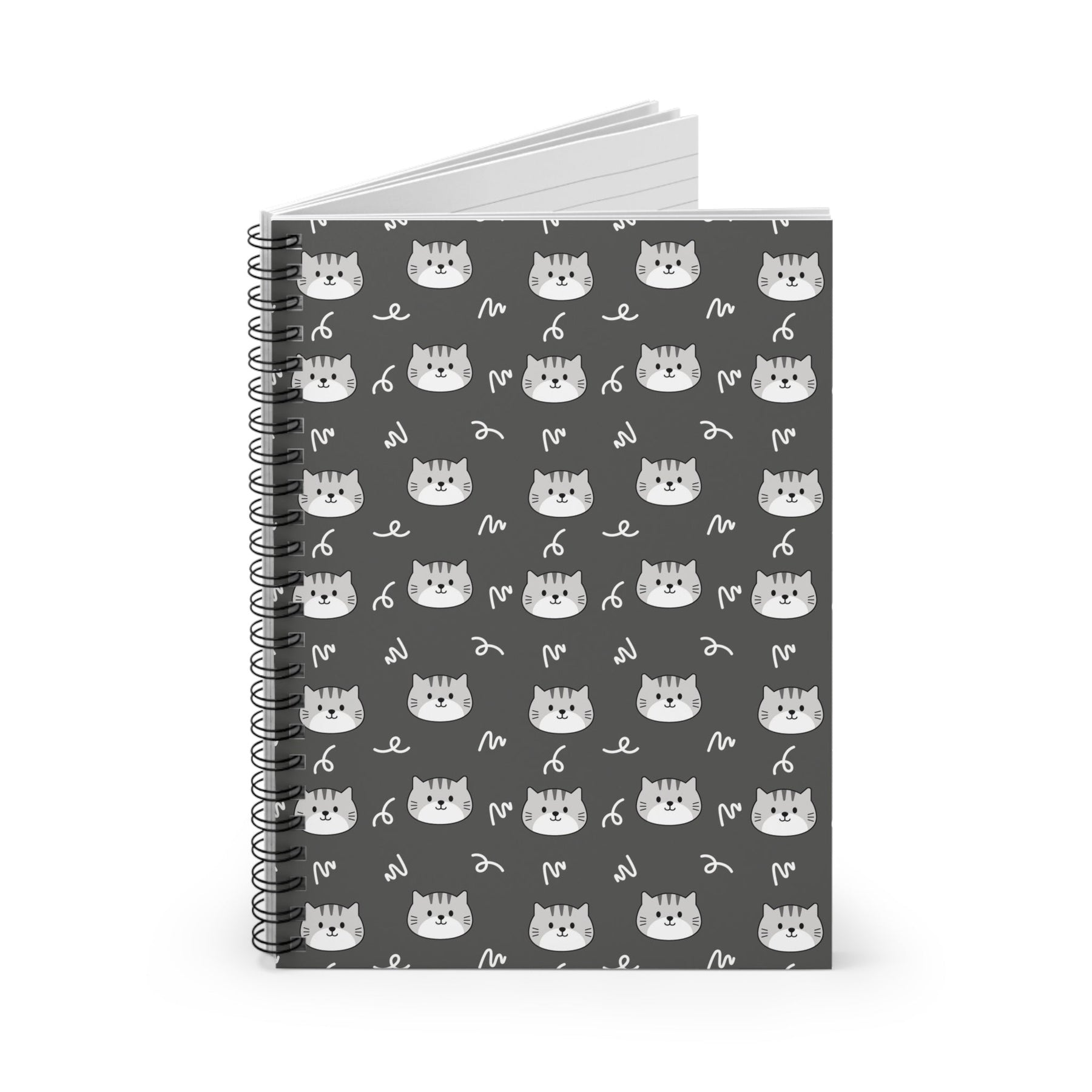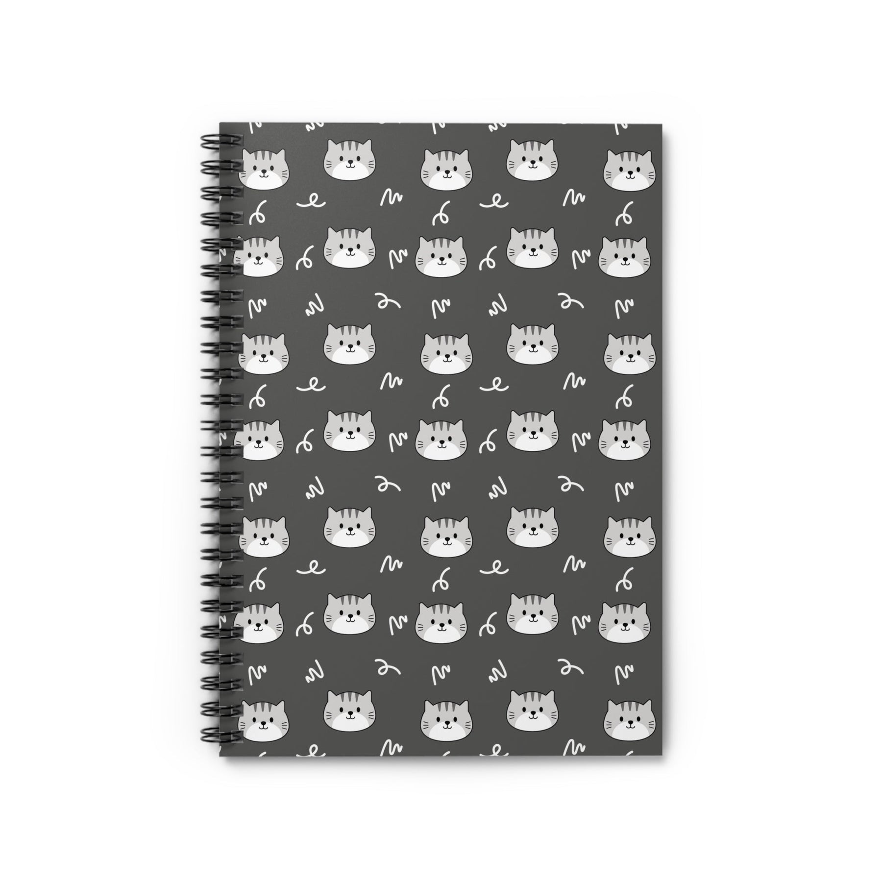 Introducing the Gray Tabby Spiral Notebook - a delightfully charming addition to your stationery collection that will have you hooked from the very first page! With its dark gray background and adorable smiling gray and white tabby cartoon cat heads, this notebook is the epitome of cuteness and functionality.
