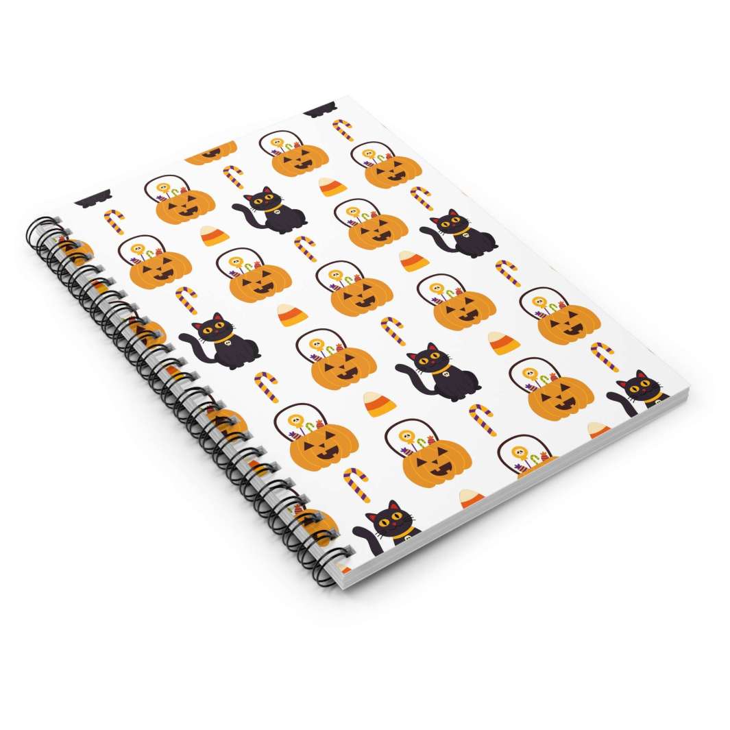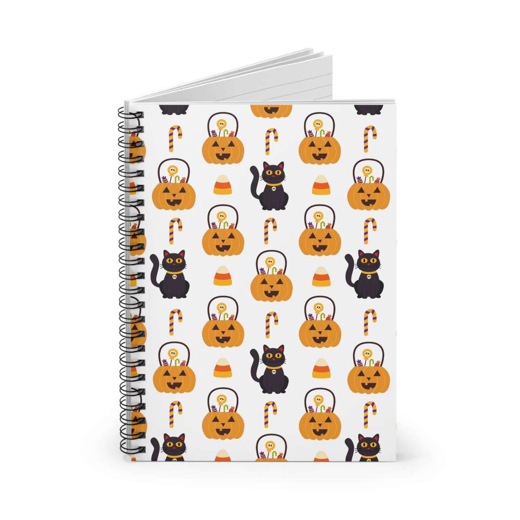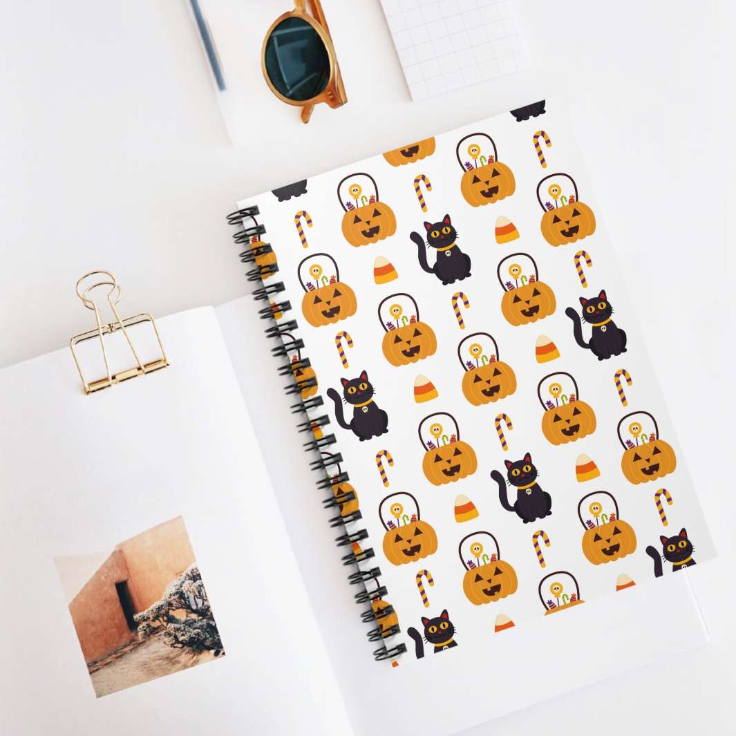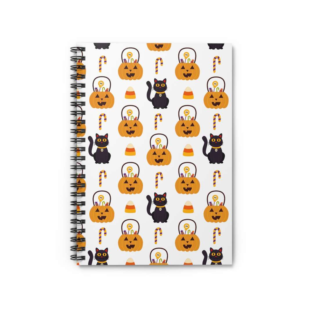 Let's dive into the bewitching details, shall we? First off, this spiral notebook is designed with adorable black cartoon cats, each one exuding their own mischievous charm. They're surrounded by a hauntingly delightful scene of jack o lanterns and candy, creating a mesmerizing repeating pattern that adds a touch of spooky magic. And let's not forget the white background, allowing the captivating Halloween elements to truly pop and bewitch your imagination!