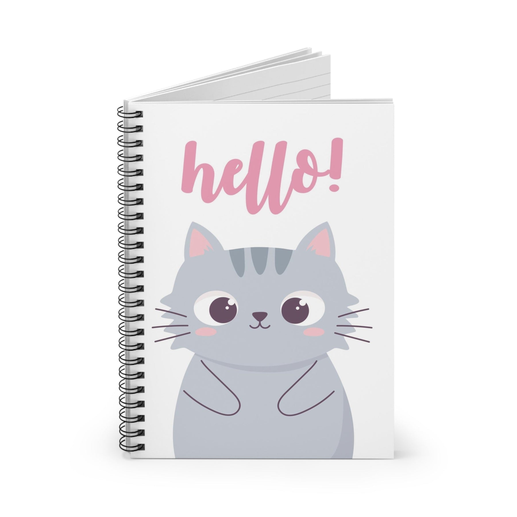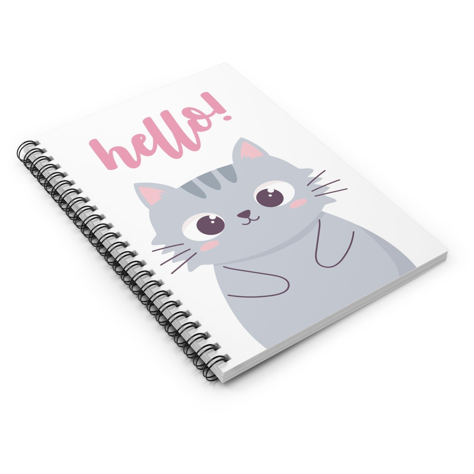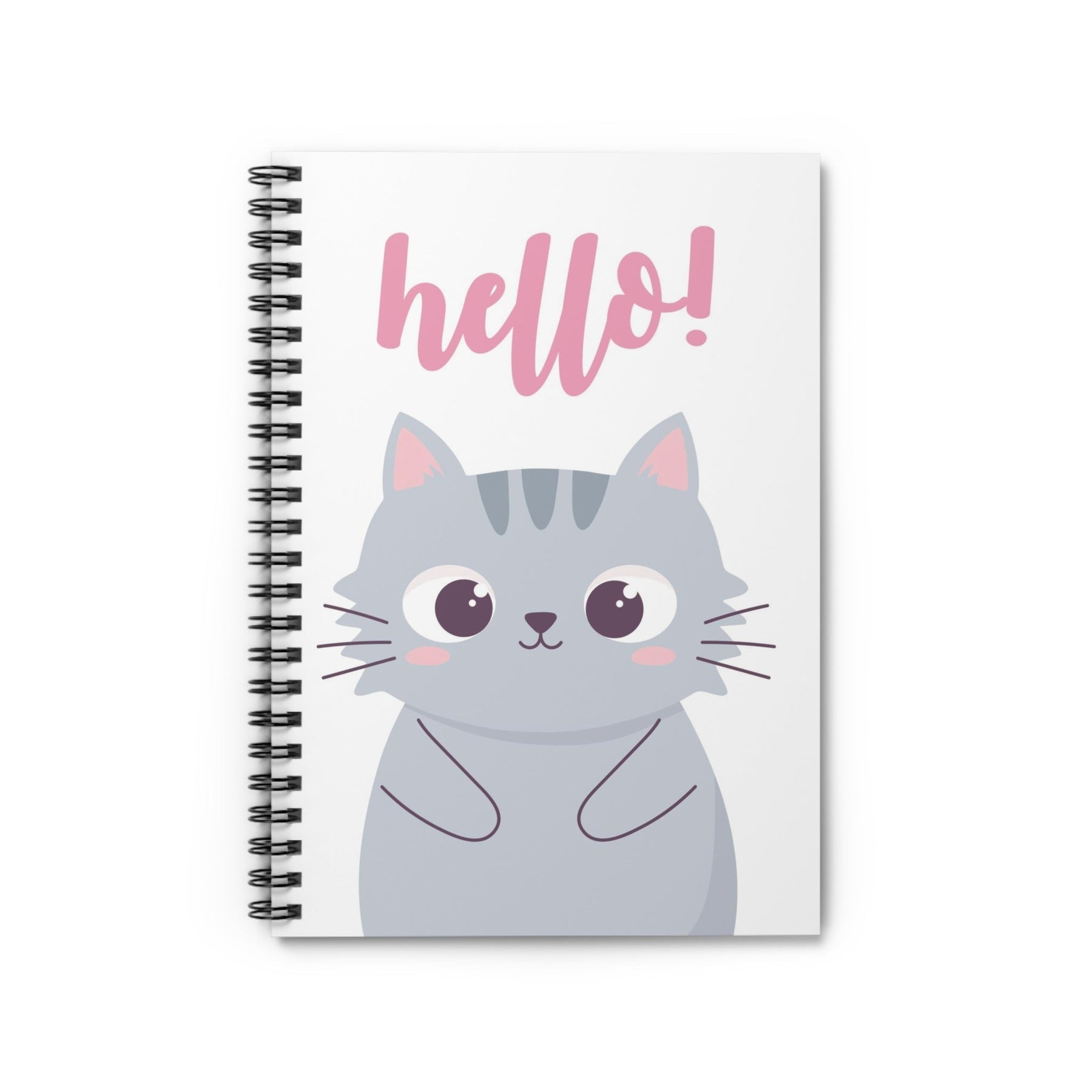 Let the world know you're a proud cat enthusiast as you showcase this notebook's white background and a captivating gray cartoon cat, who greets you with a friendly "hello!" in radiant pink over the top.