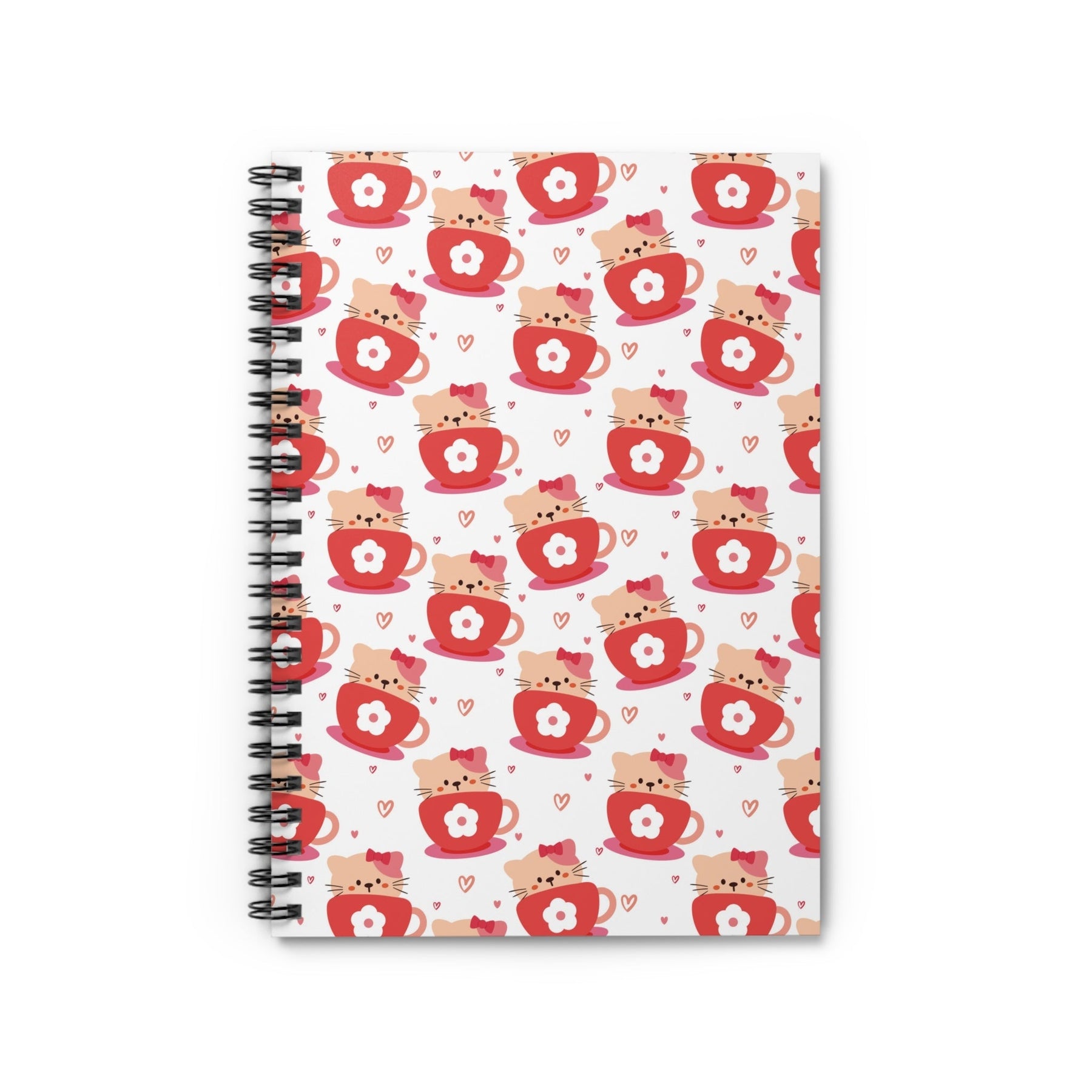 Are you looking for an adorable notebook to keep your office space looking stylish and organized? Then look no further! The Java Cat Spiral Notebook is the perfect addition to any desk or workspace. Featuring an endearing cartoon cat wearing a red hairbow and a picking a cup of coffee with a white flower on the front, surrounded by little red hearts, all against a white background, this notebook is sure to put a smile on your face every time you use it.
