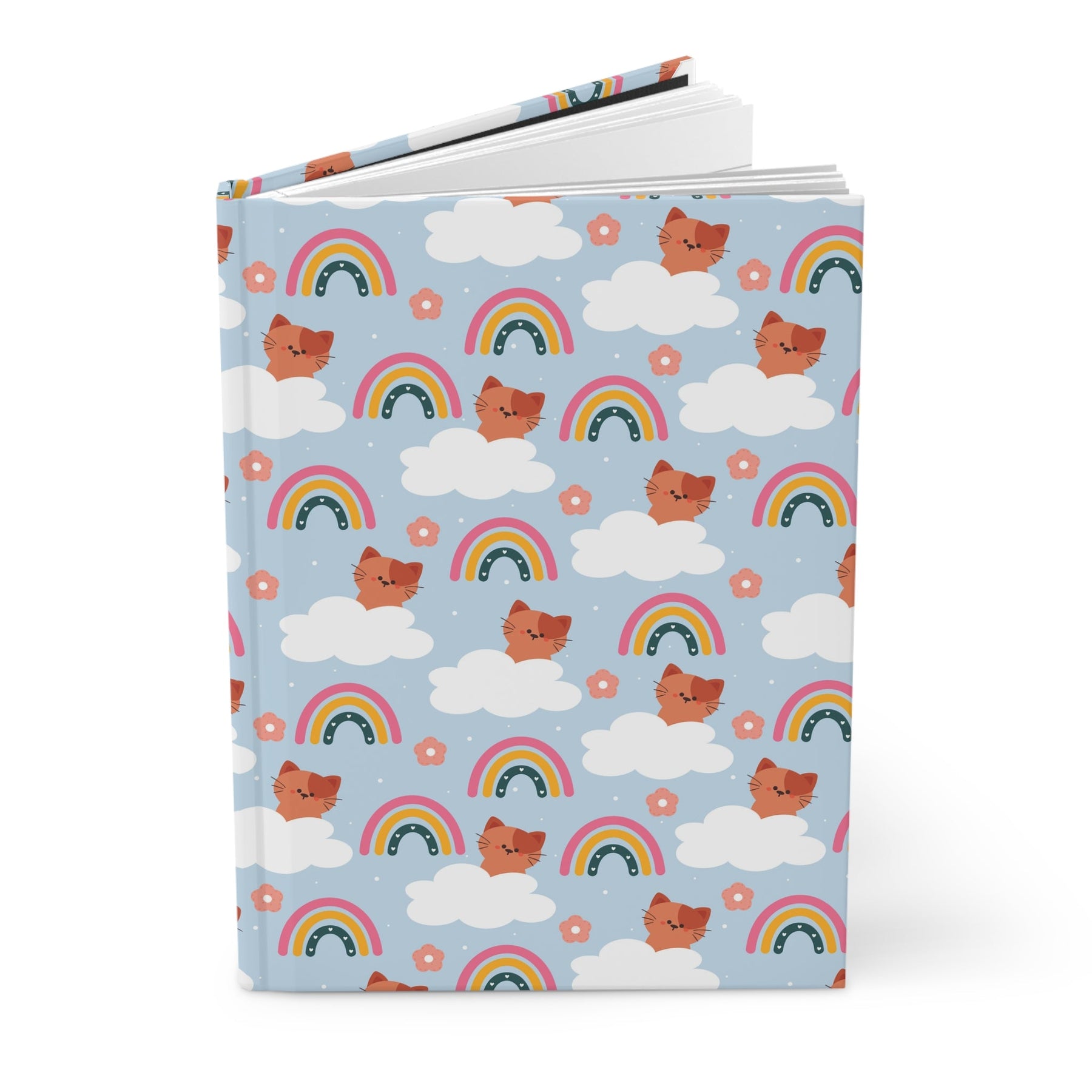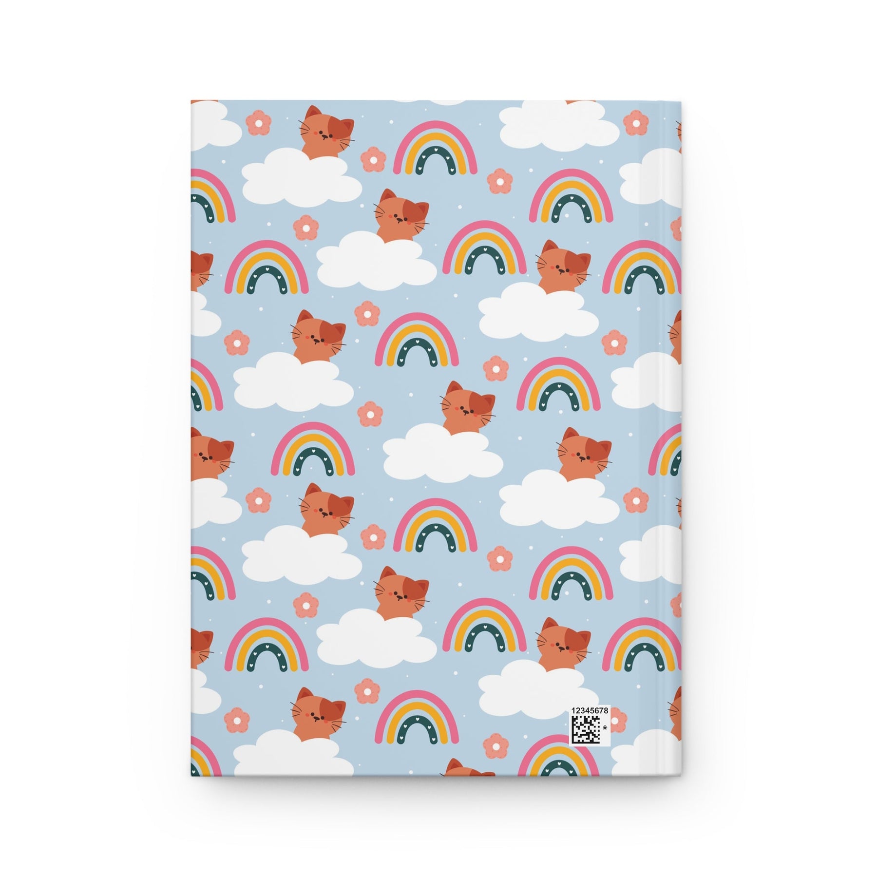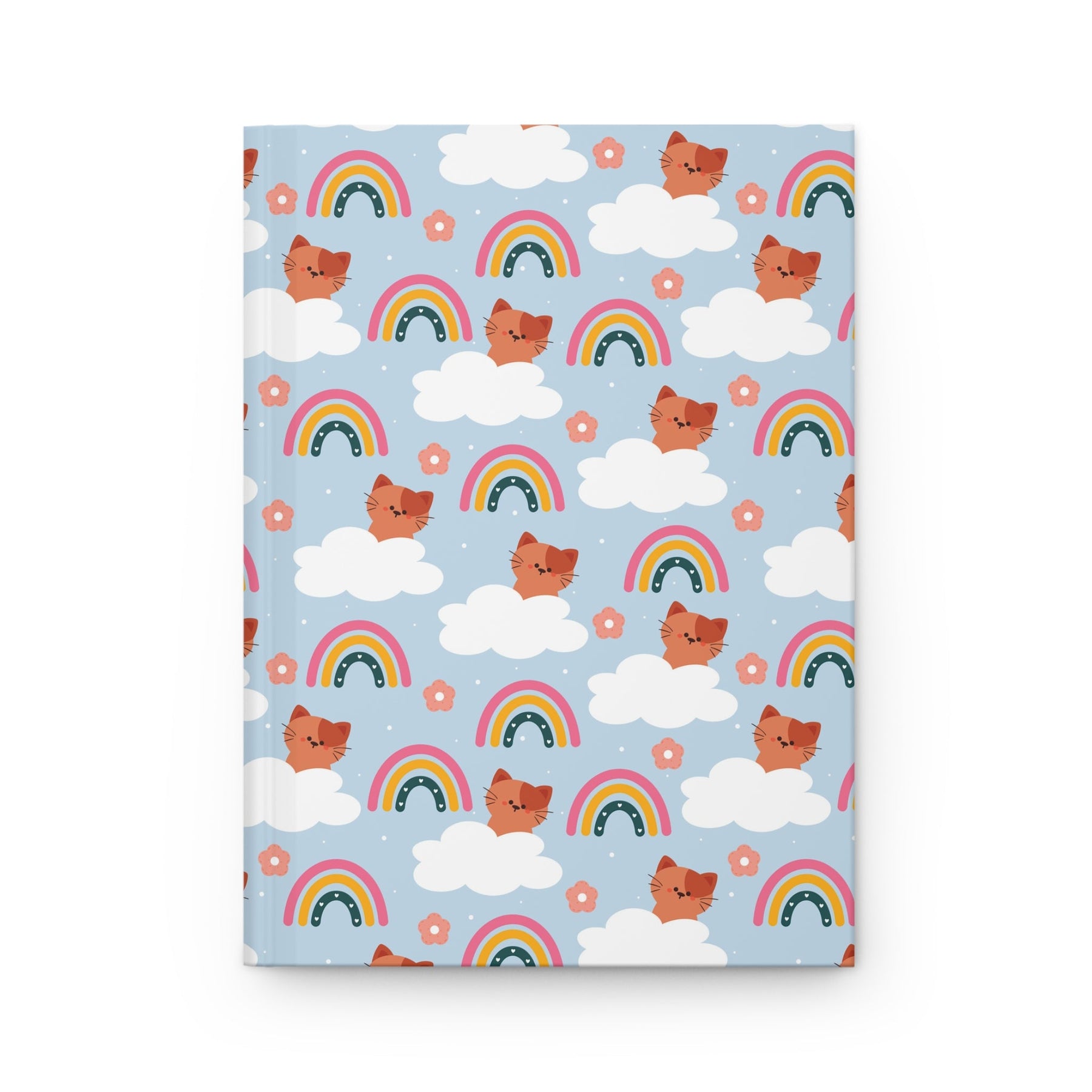 With its light blue background, the Kitties in the Clouds Hardcover Journal is a tranquil haven that will transport you to the realms of tranquility every time you open its pages. Inspired by the boundless nature of the sky, this delightful journal is adorned with the adorable cartoon cat head peering behind a fluffy white cloud, accompanied by playful rainbows and dainty flowers. It's a visual feast for cat lovers and dreamers alike!