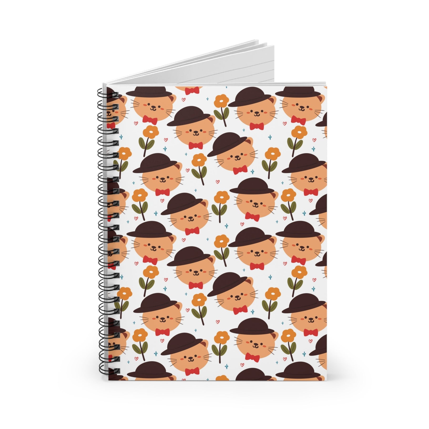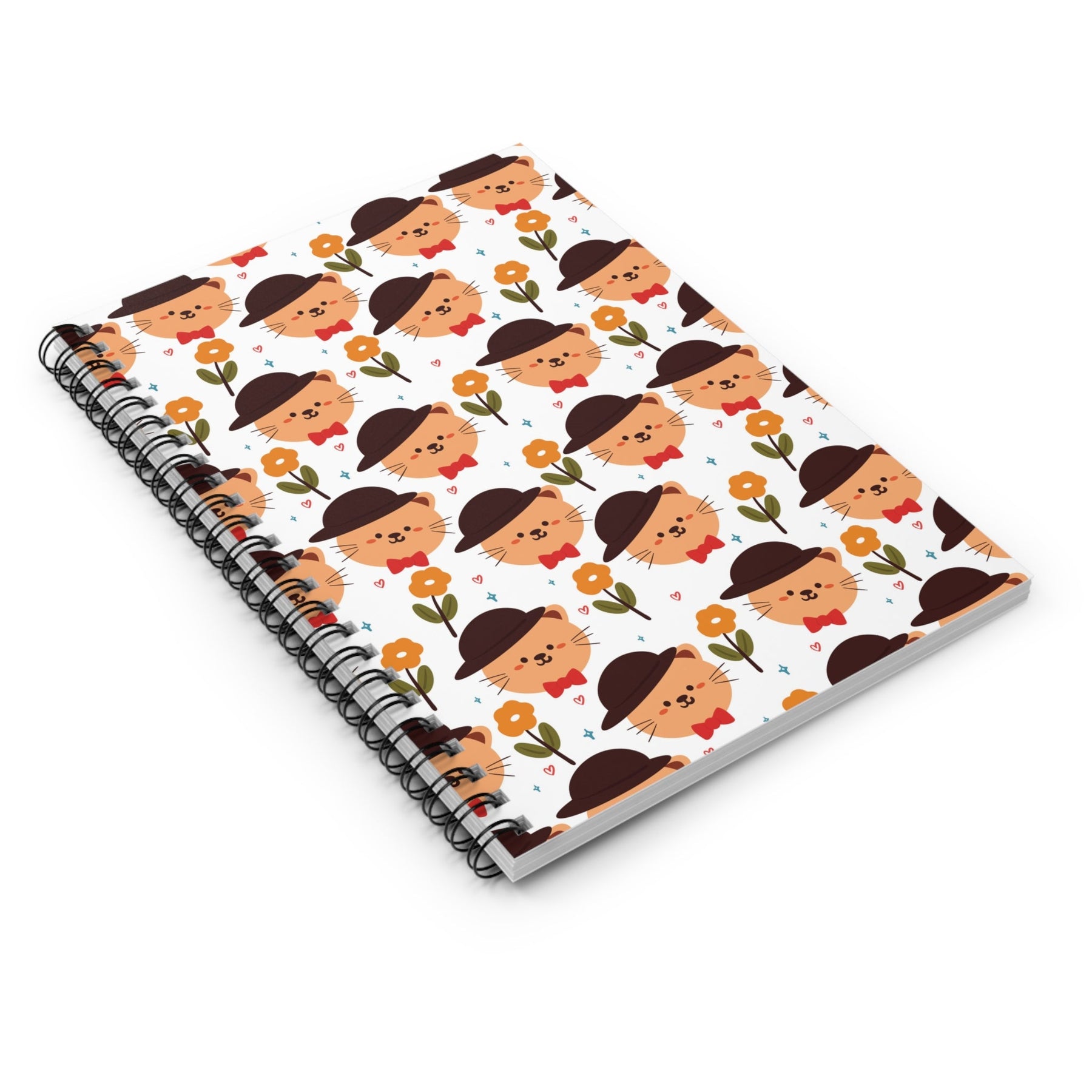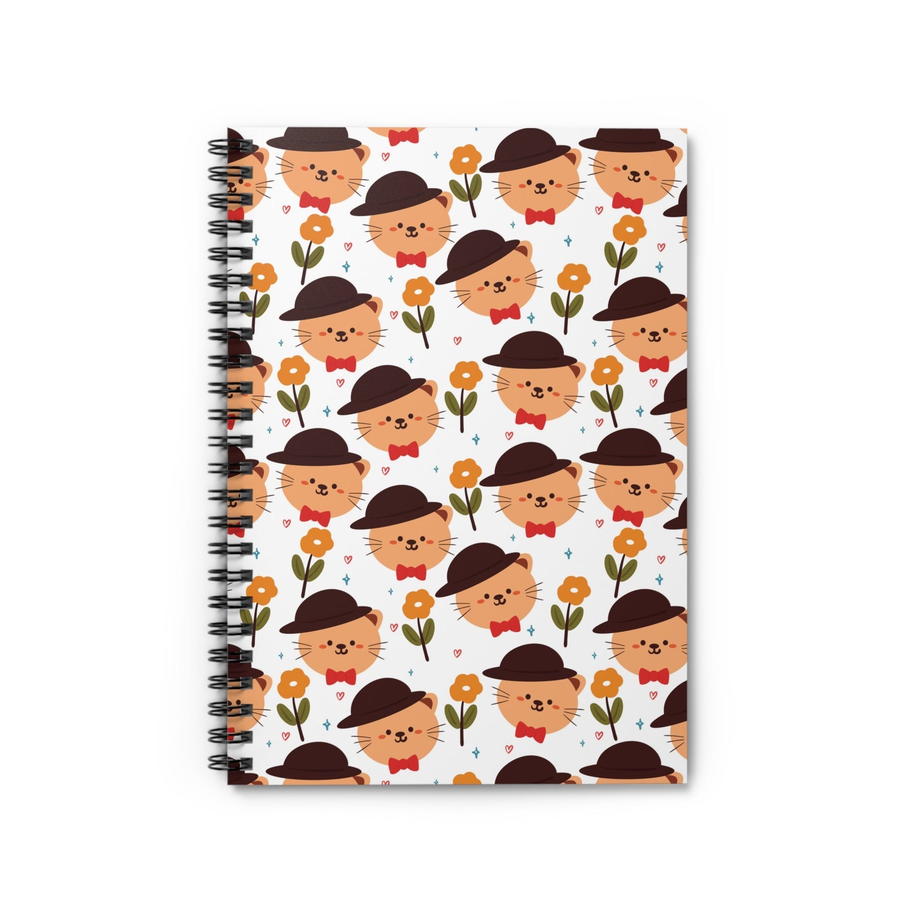 With the Posh Cat Spiral Notebook, your writing will be elevated to a whole new level of sophistication. This charming notebook features a crisp white background adorned with a smiling orange cartoon cat head in a dapper dark brown bowler hat and a playful red bow tie. Surrounding the charming feline are tiny hearts and stars, as well as delicate orange flowers, adding a touch of whimsy to its sophisticated design.