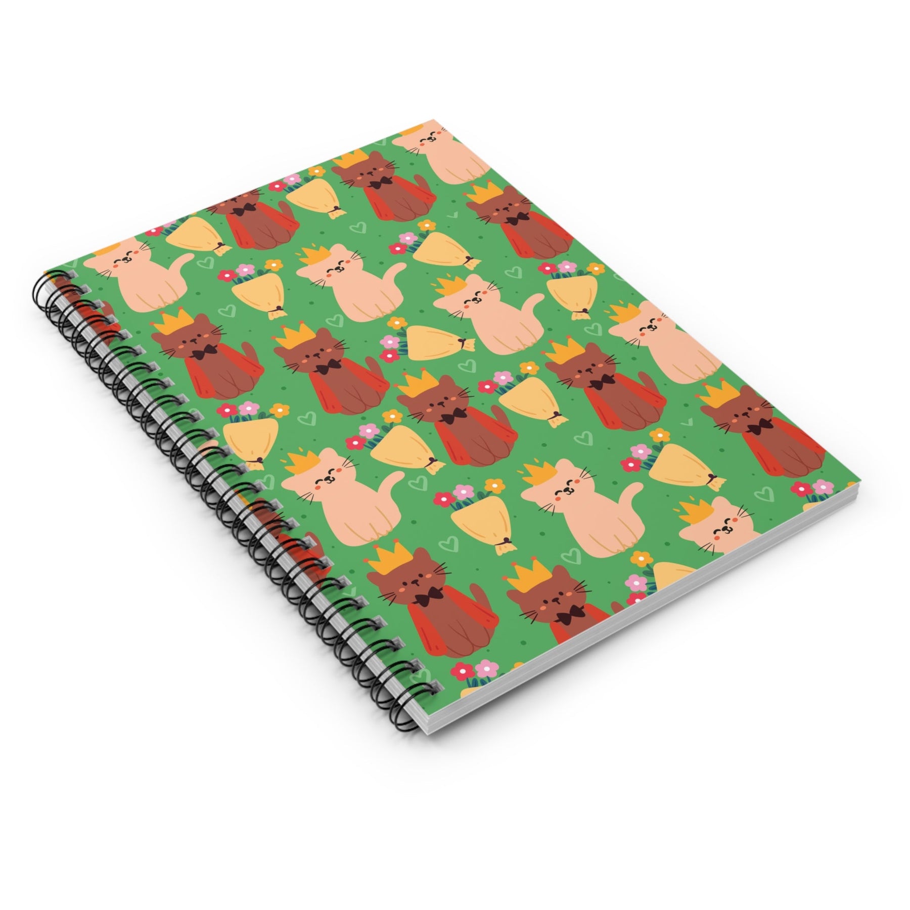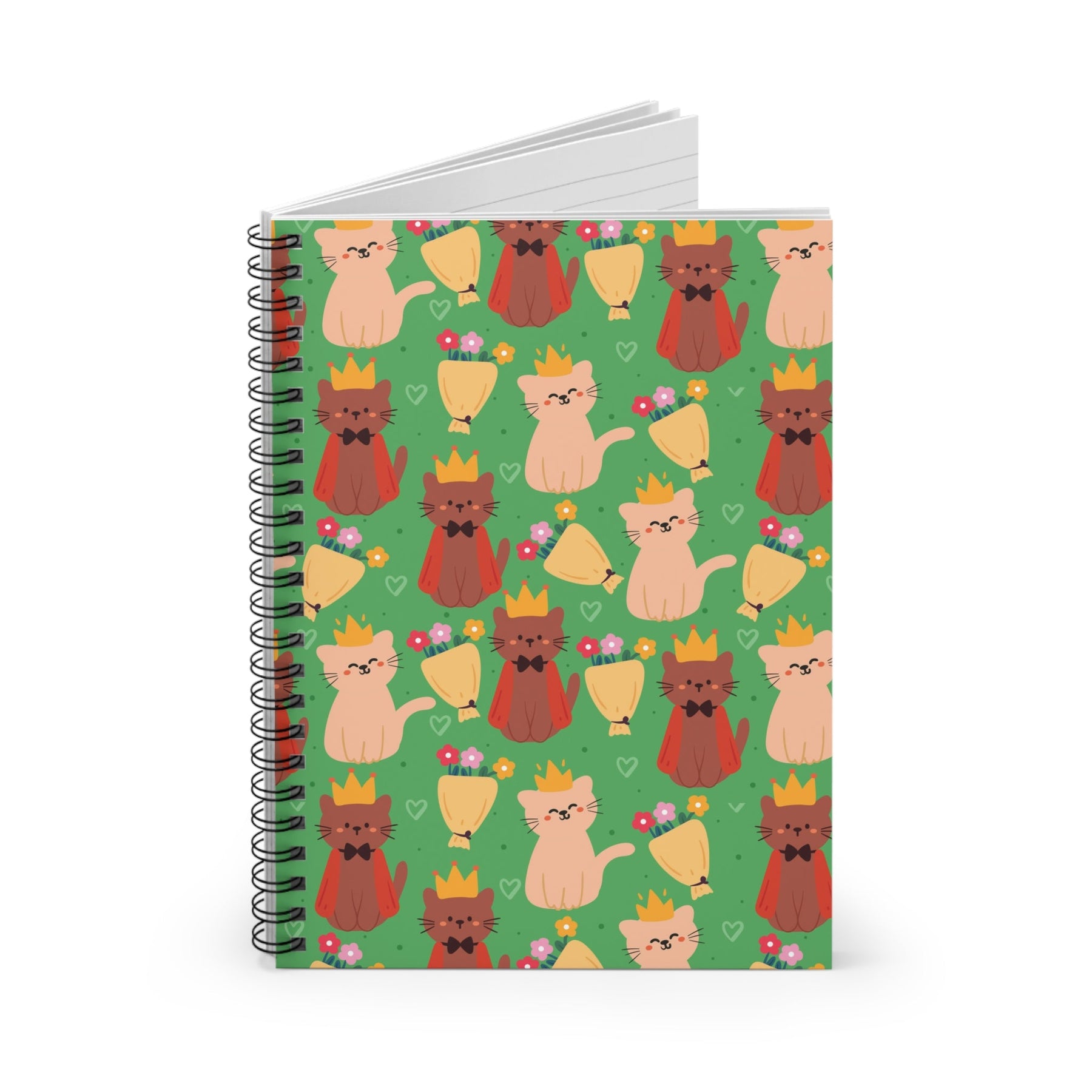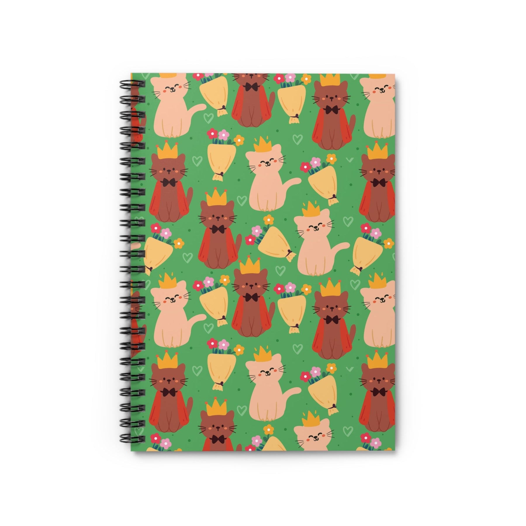 The front cover features an adorable cartoon cat wearing a crown, black bowtie, and royal robe over a background of soft green shades. The accompanying cartoon girl cat is donning her own crown and a sweet pair of little hearts and bouquets of delicate paper-wrapped flowers completes the look. And while our royal cats are worth their weight in gold, our spiral notebook is surprisingly affordable!