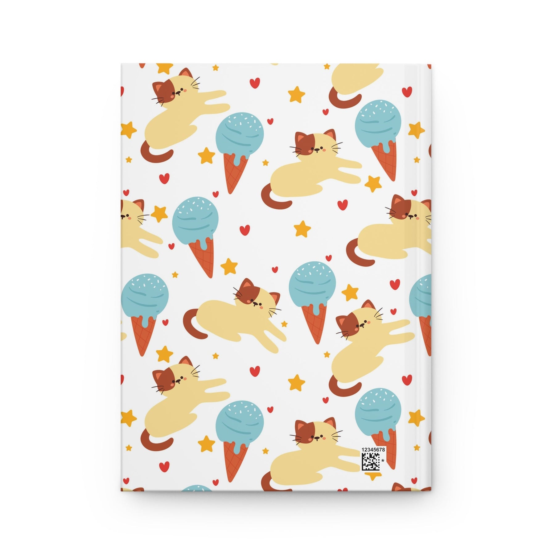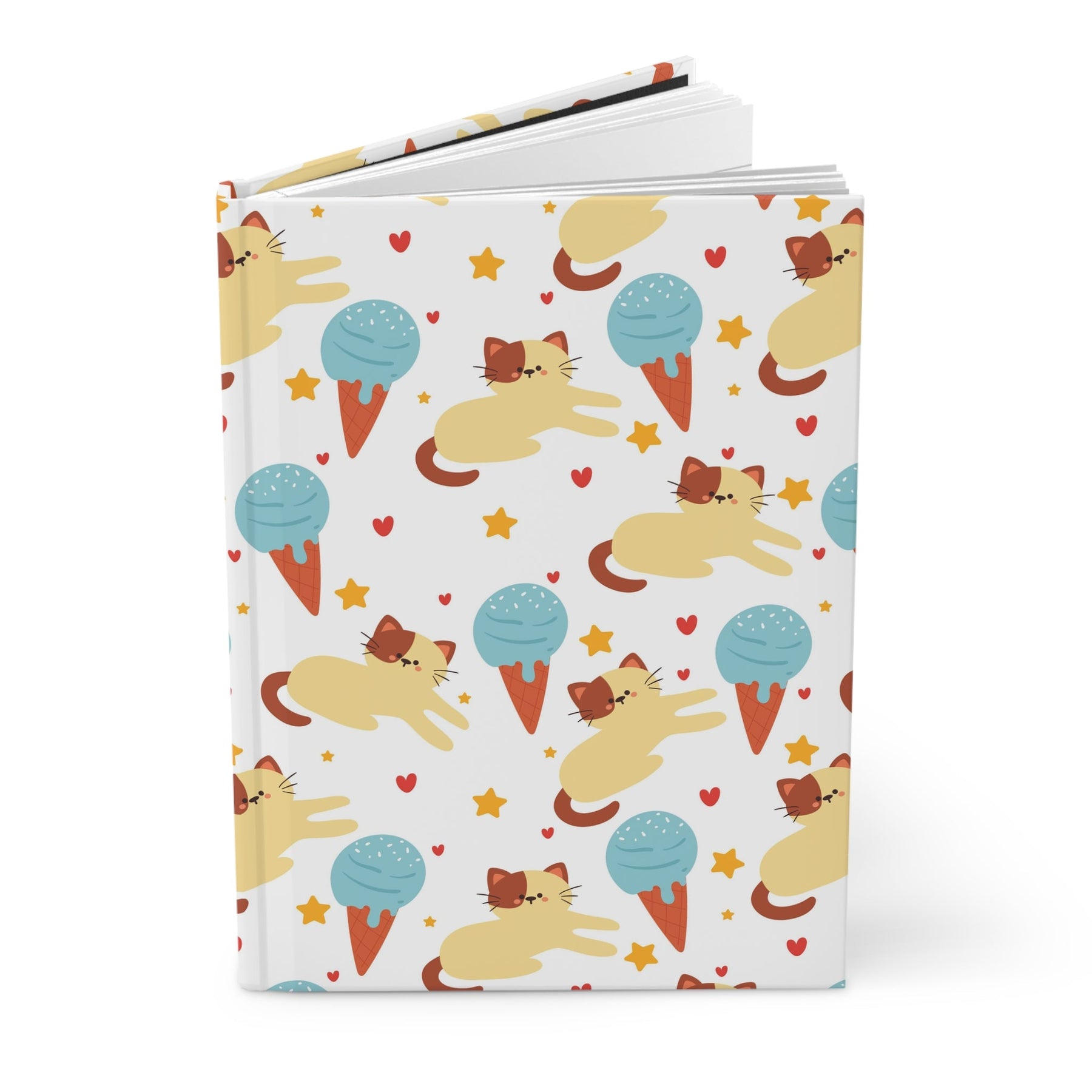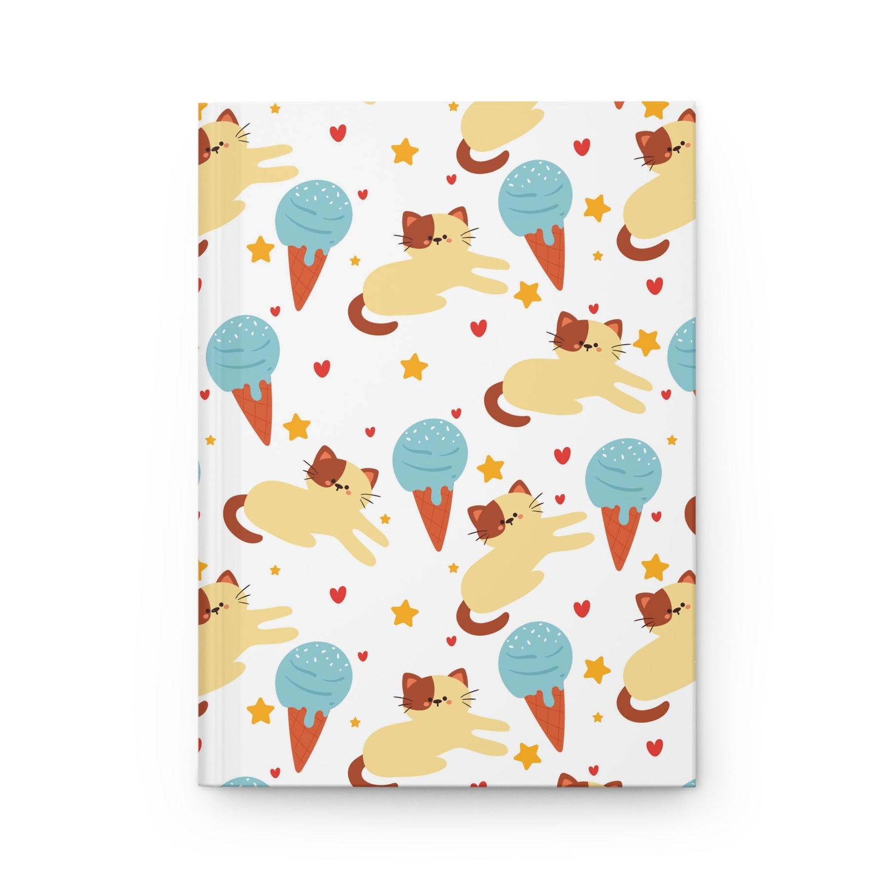 Indulge in the purr-fect writing experience with our Sweet Treat Kitty Hardcover Journal. This delightful journal is like a whimsical playground for your words, featuring cream and brown cartoon cats frolicking amidst ice cream cones with luscious blue ice cream, little yellow stars twinkling in the sky, and tiny red hearts sprinkled throughout. Against a pristine white background, this journal is a canvas for your creativity and imagination to run wild.