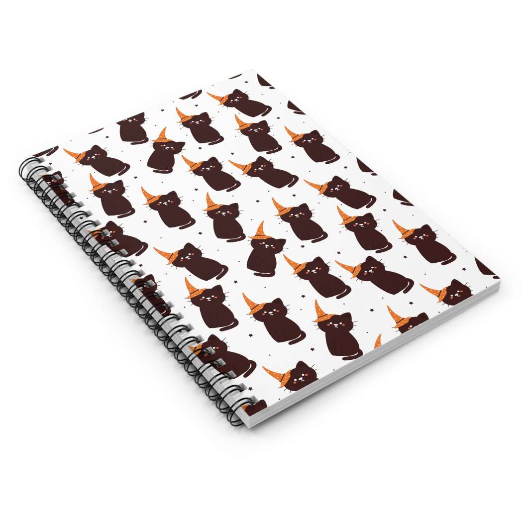 This spellbinding notebook features a playful parade of charming cartoon cats, each donning a bewitching orange witch hat adorned with white polka dots. Against the backdrop of a pristine white background, these feline enchantresses exude an aura of mystery, drawing you into a world where the boundaries of reality and fantasy blur.