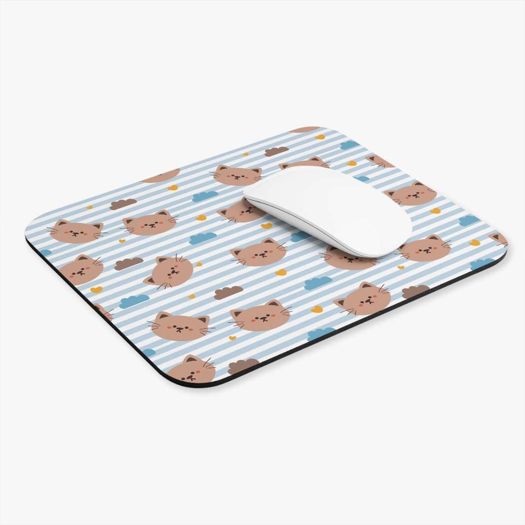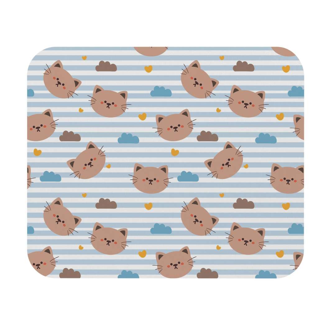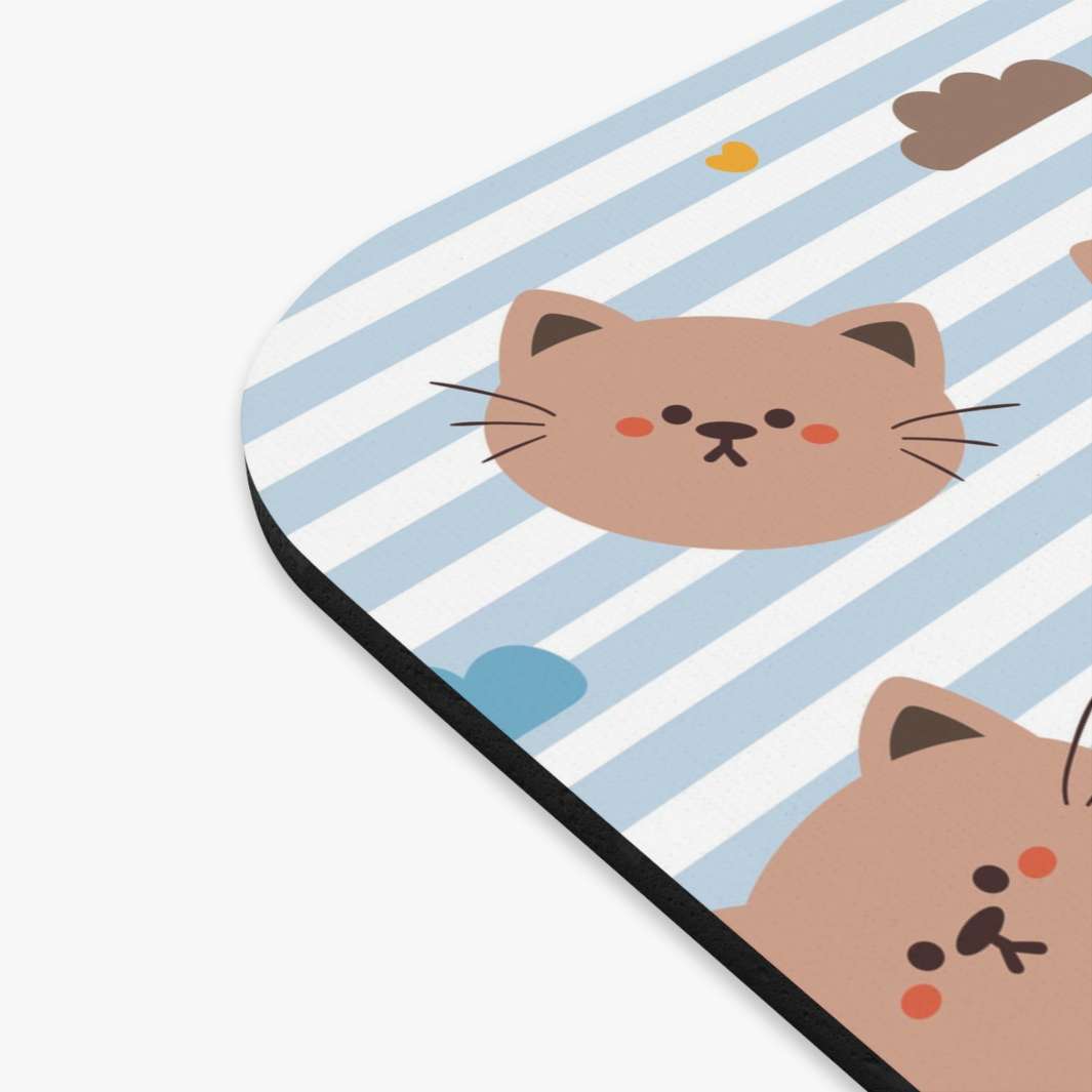 Let's dive into the enchanting features that make this mouse pad stand out from the rest. Picture a serene blue and white striped background, like a canvas of calmness awaiting your artistic brilliance. But wait, that's not all! Sprinkled among the soothing stripes are charming brown cartoon cat heads, giving every glance at your pad a delightful surprise.