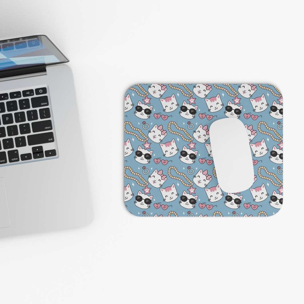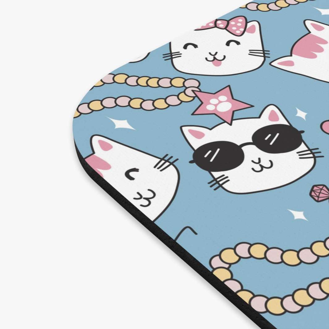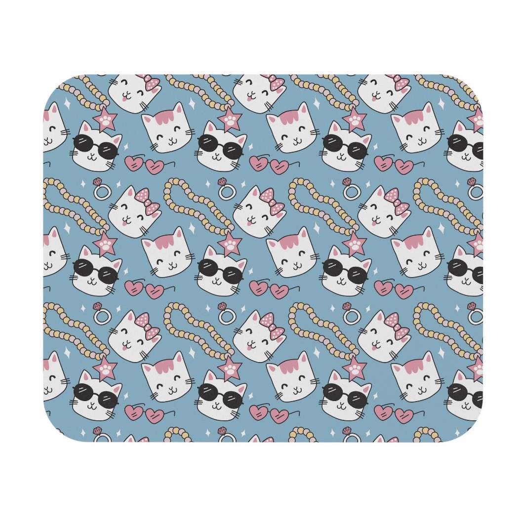This sleek and stylish mouse pad features a bright blue background with super-cute cartoon cat heads, pearl necklaces, sunglasses, stars with paw prints, and diamond rings. It's the perfect piece to give your work or gaming station a fun and playful look that won't quit.