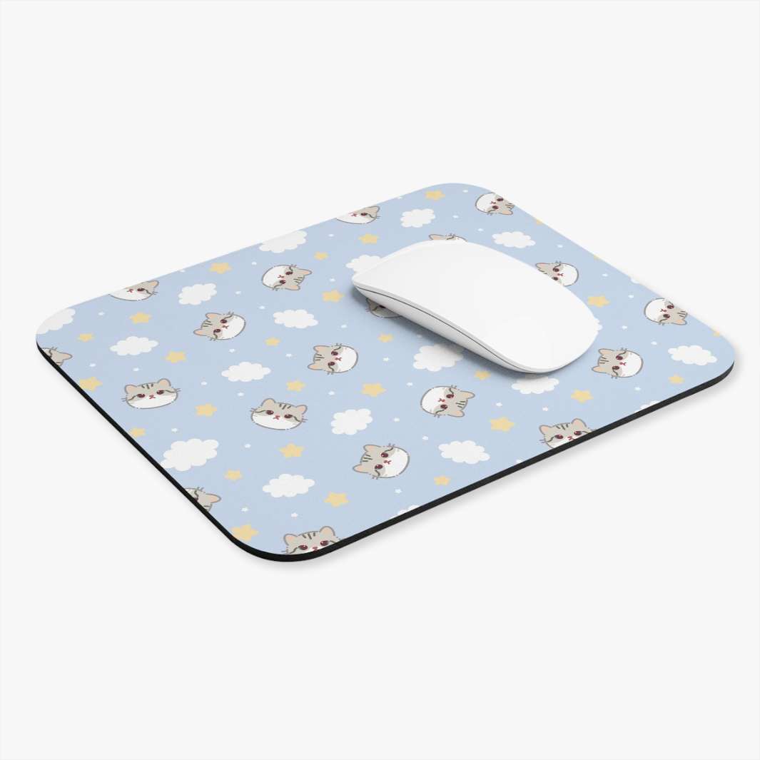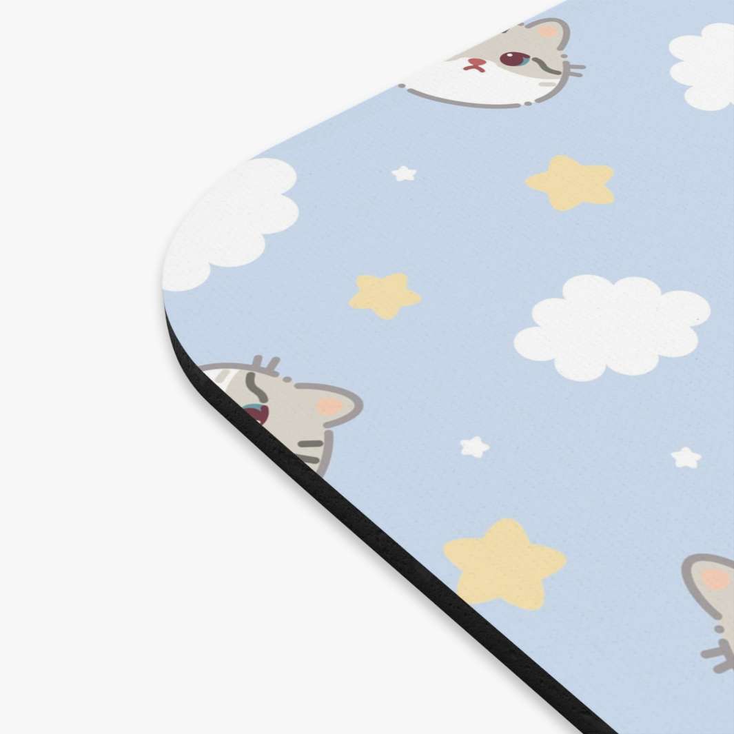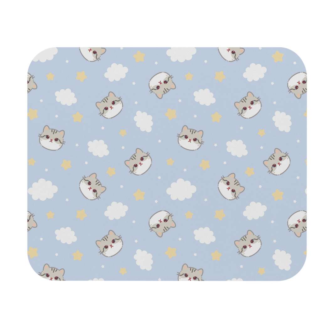 Bring a little of the sky down to earth with the Gray Cat and Clouds Mouse Pad! This delightful mouse pad features an enchanting light blue background, peppered with adorable little gray cartoon cat heads, gentle white puffy clouds, and even tiny yellow stars that add a finishing touch of whimsy to this charming design.