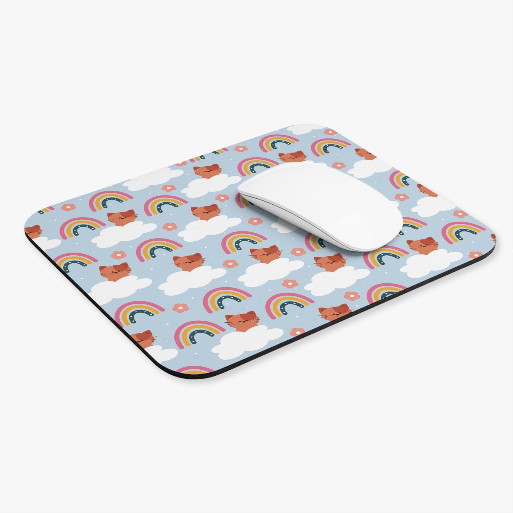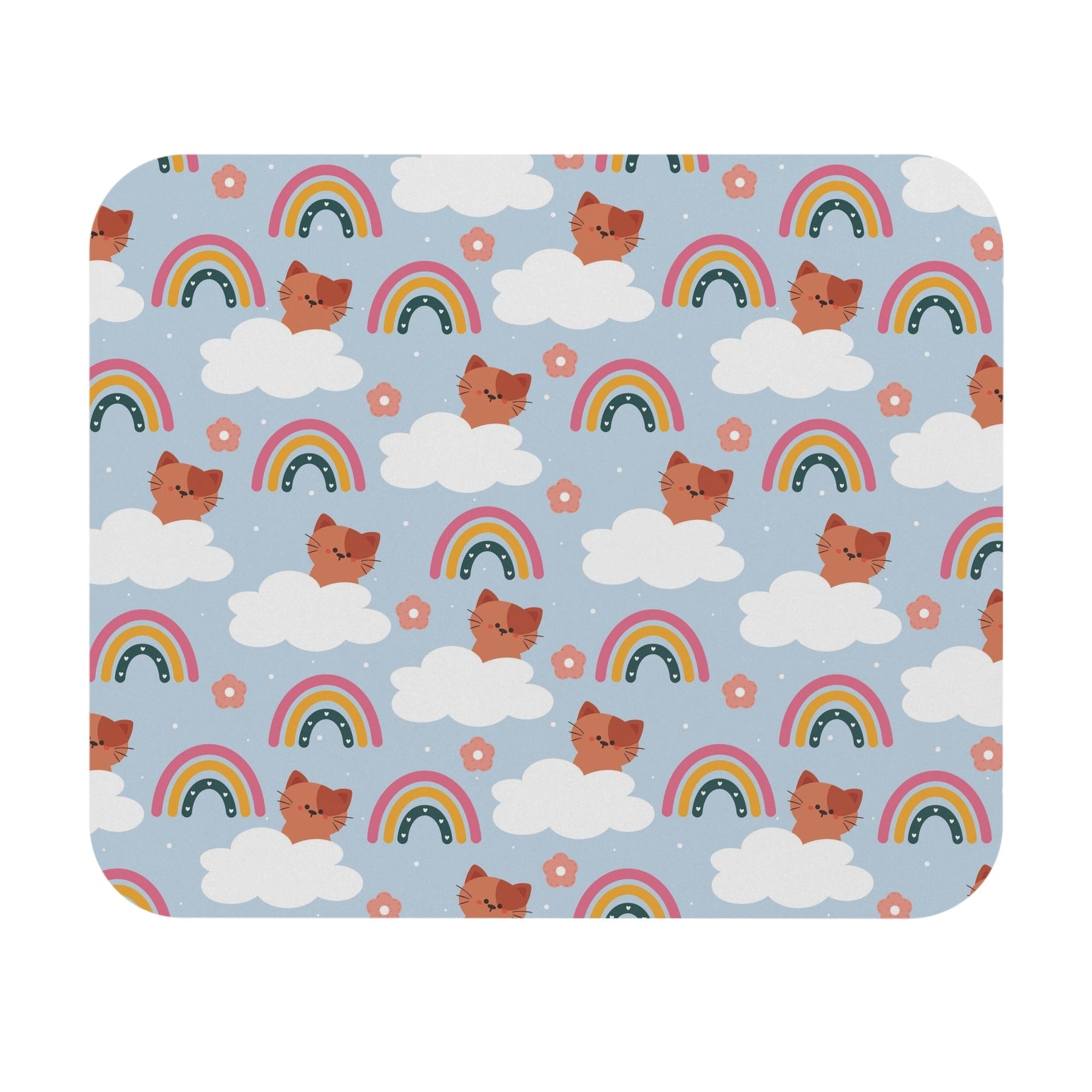 With its light blue background that showcases a brown cartoon cat head peeking out behind a fluffy white cloud, this mouse pad is a delightful and enchanting addition to any desk. But that's not all! Our designers have added little rainbows and dainty flowers, transforming this mouse pad into a miniature garden in the sky.