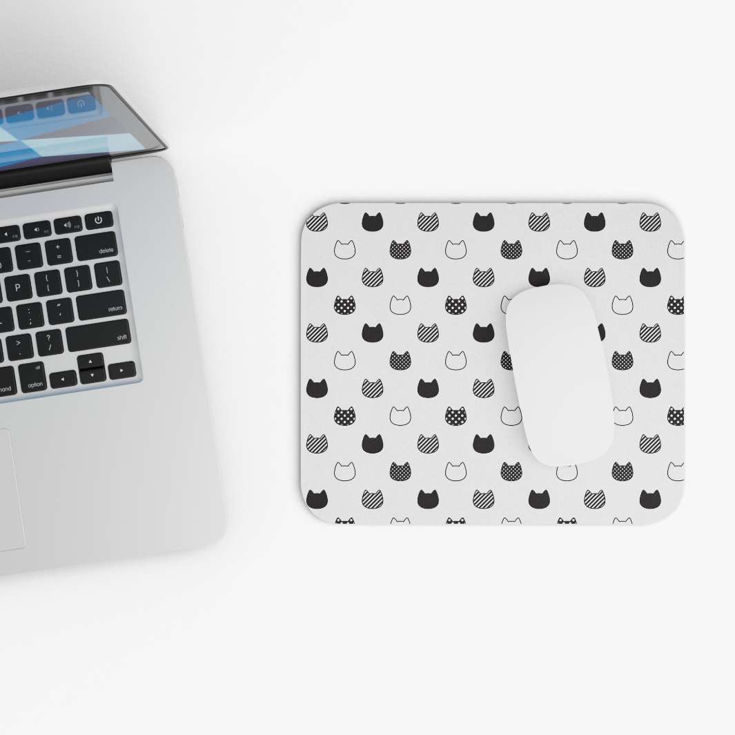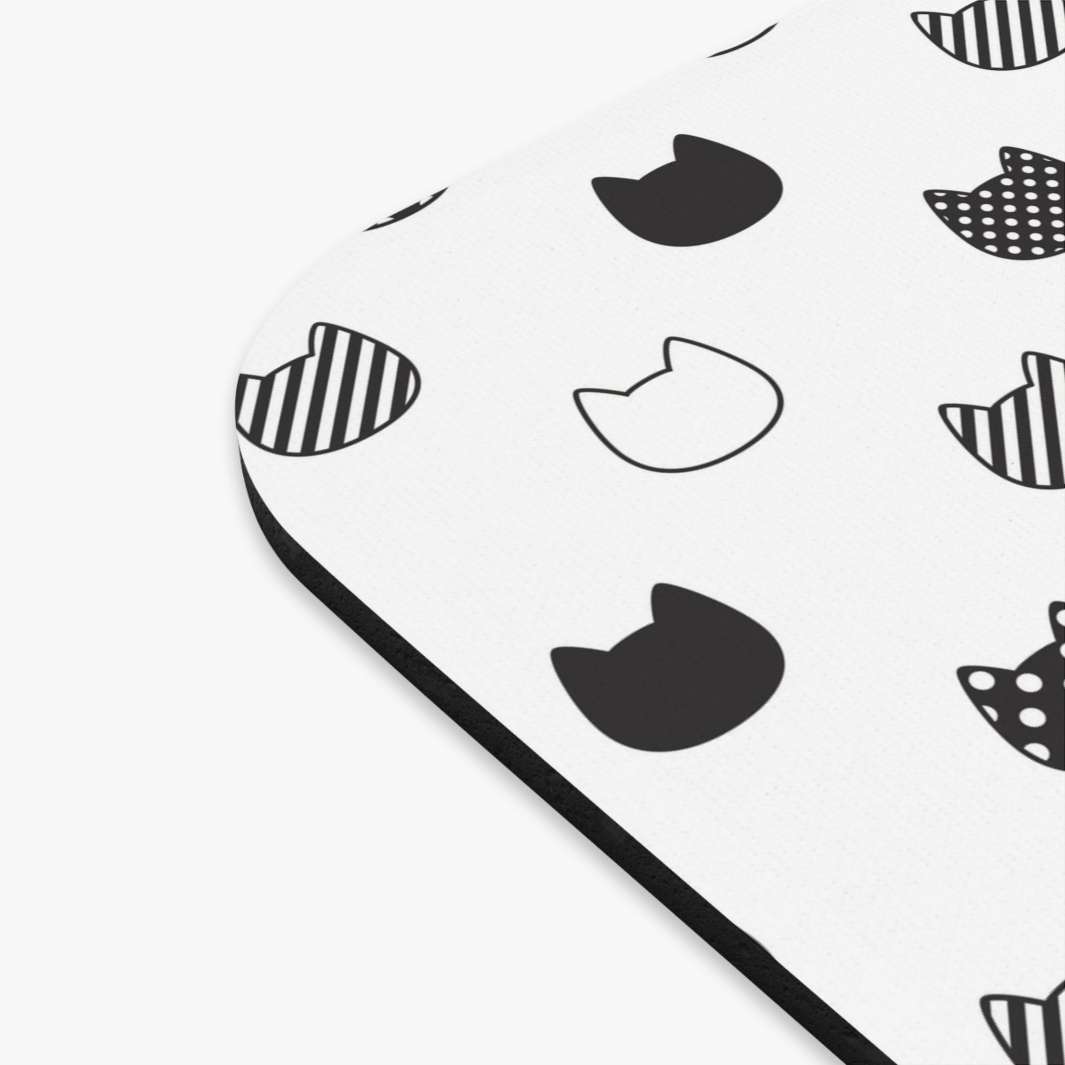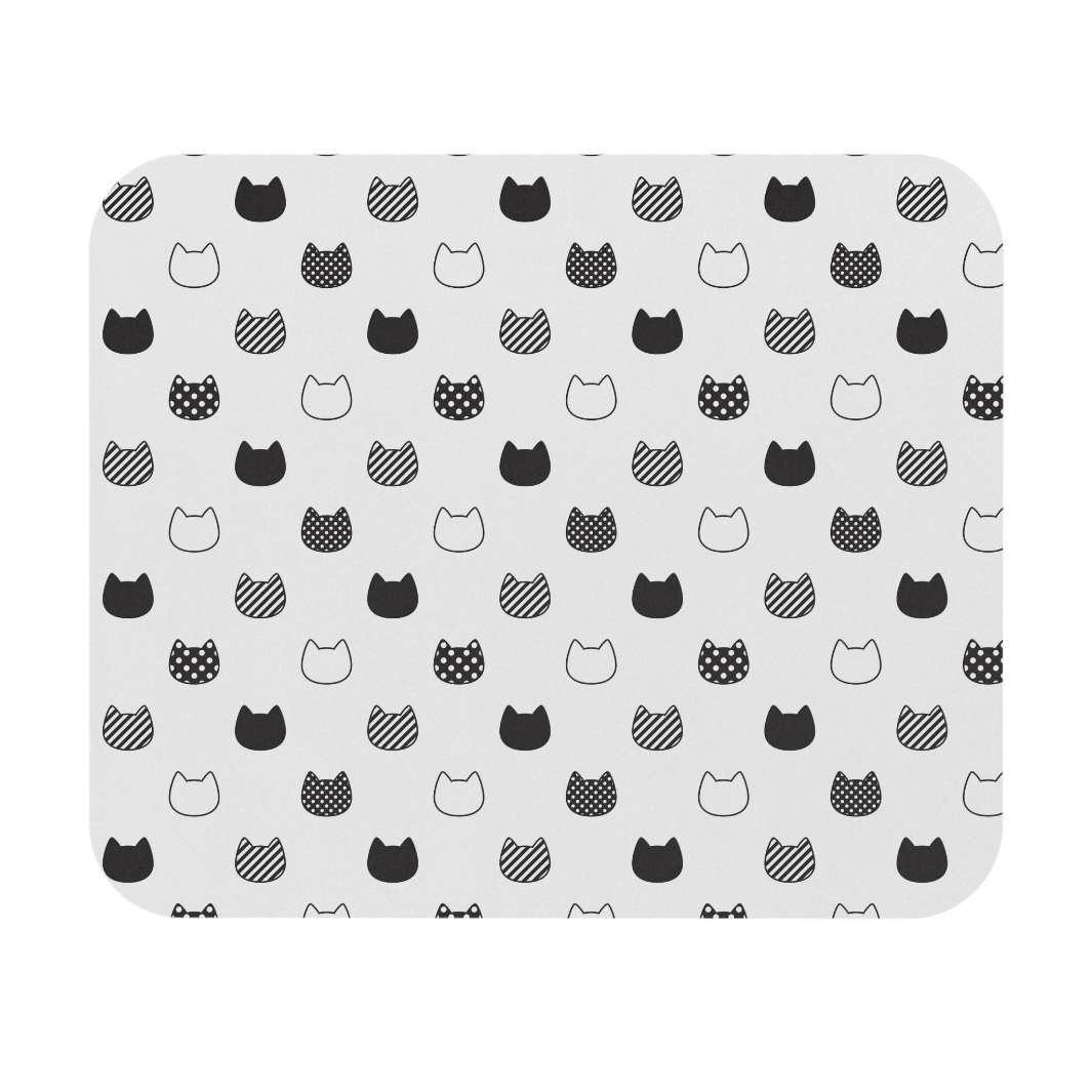 The mouse pad features a white background dotted with rows of patterned black and white cat heads, Full of color and positivity, it's sure to make the days spent at work just a bit more fun.