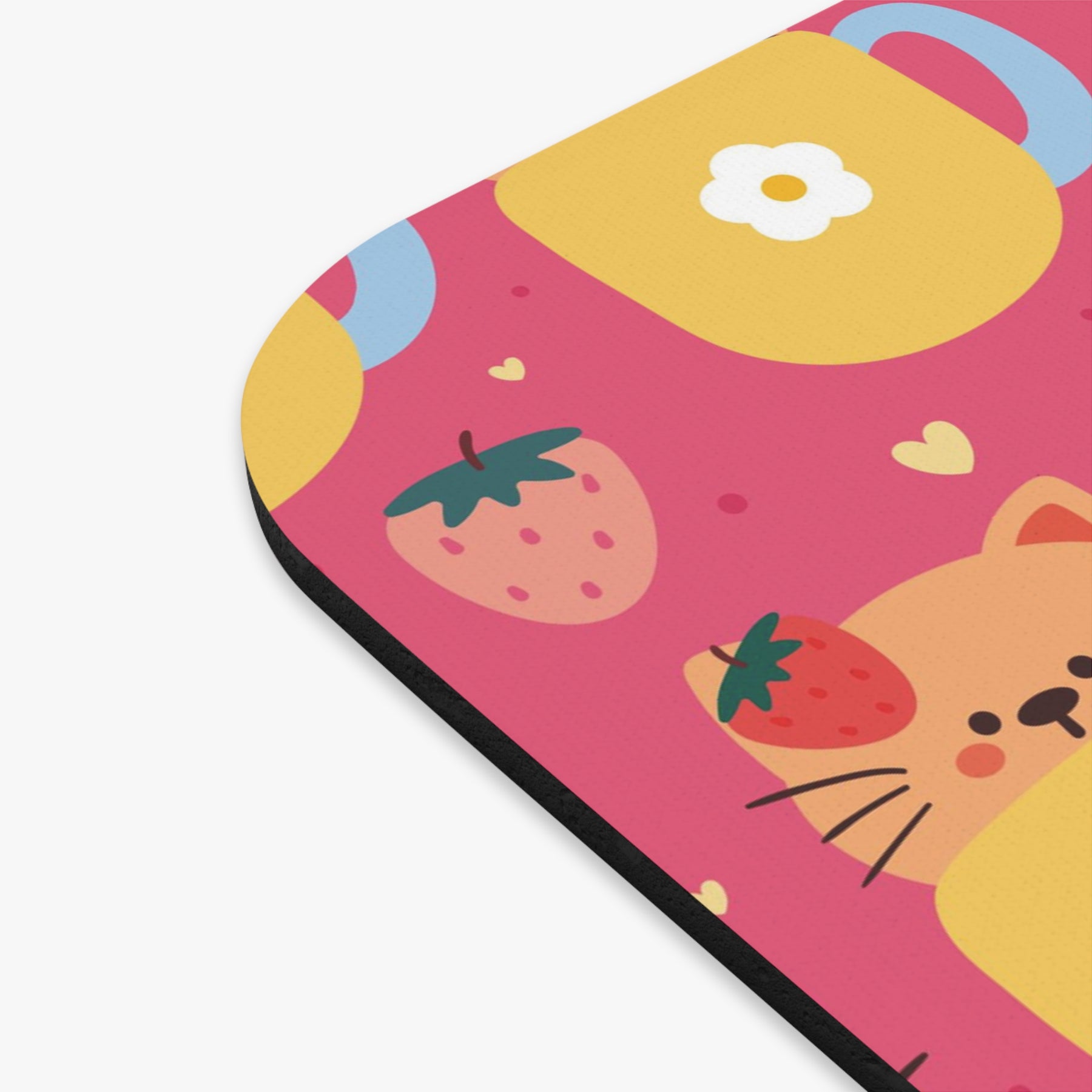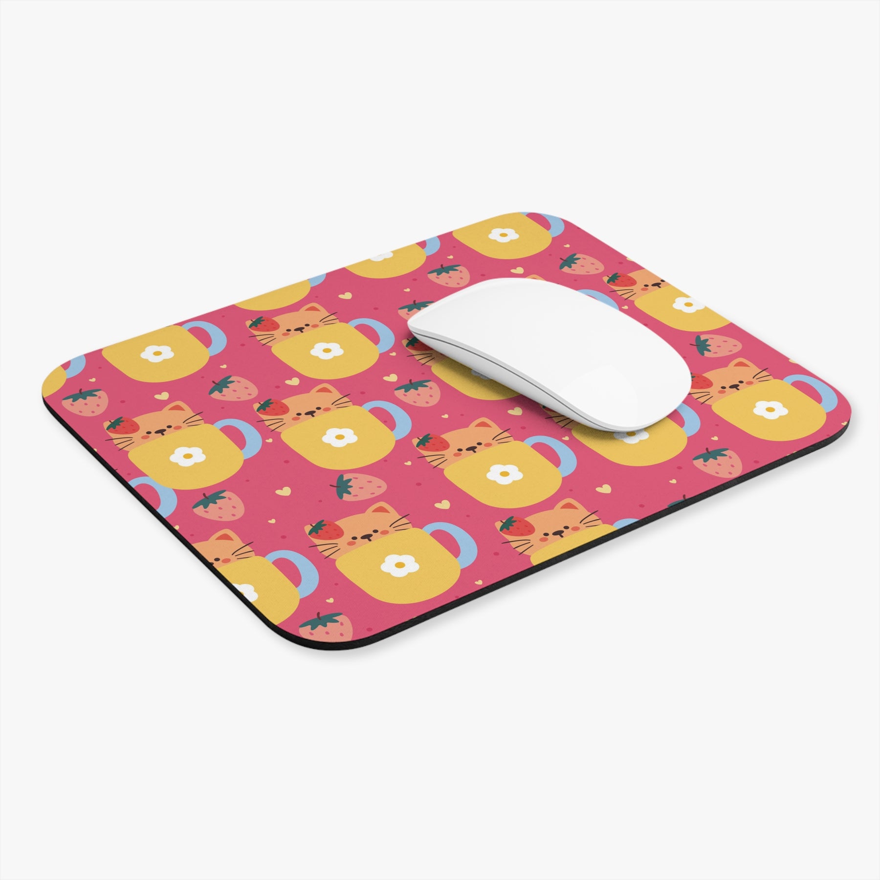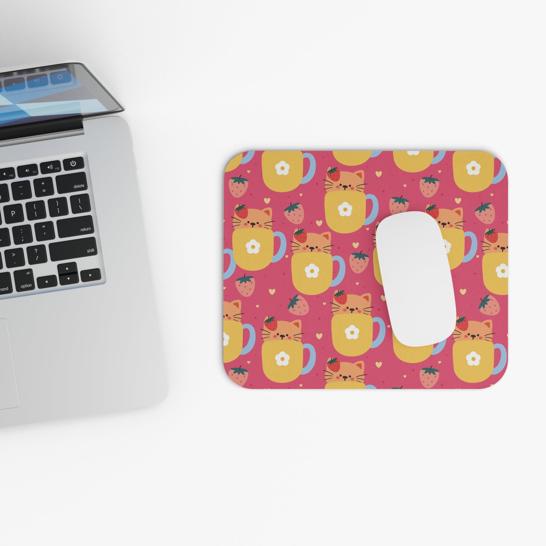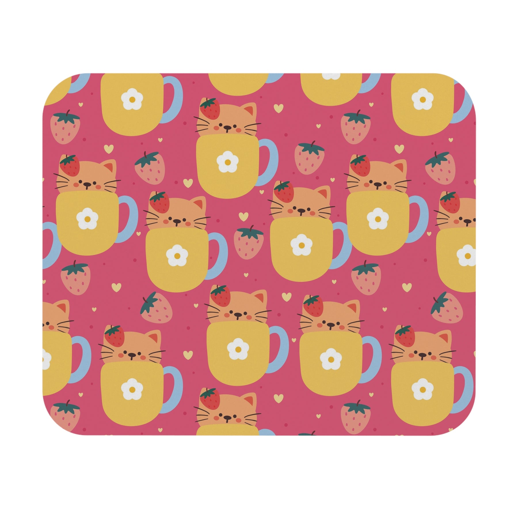 Ensure your desk space reflects your unique style with the 'Pawsitively Purrr-fect Mouse Pad.' Designed to cater to both function and fashion, this delightful accessory is framed by a bright pink background that's guaranteed to brighten up your workspace. At its heart, playfully peach cartoon cats peek out from cheerful yellow coffee cups —a pattern that's as whimsical as it is charming, interspersed with sweet strawberries that add a vibrant touch.