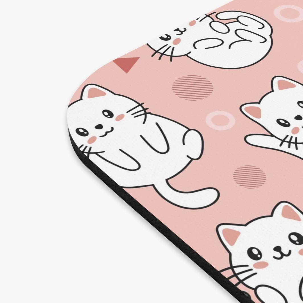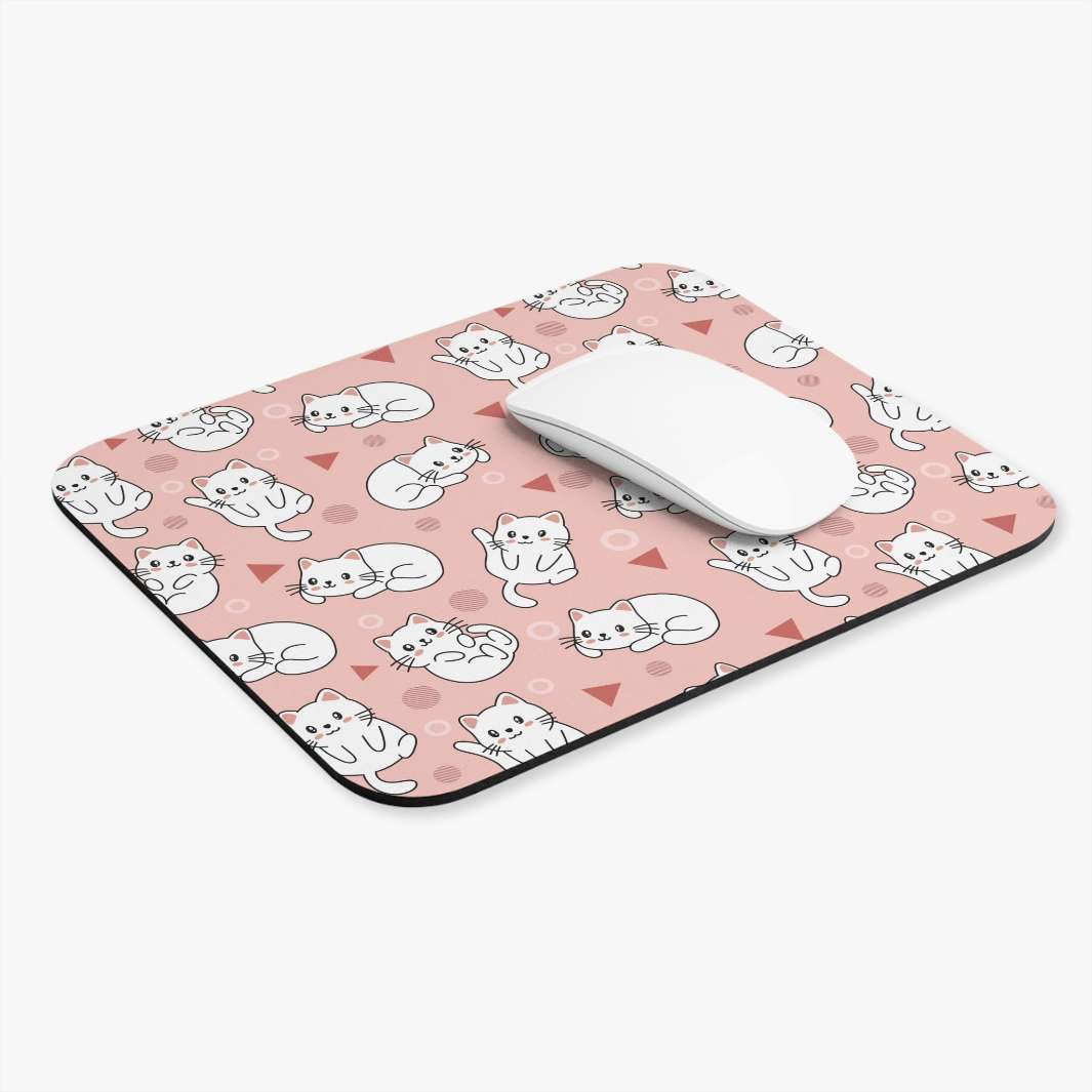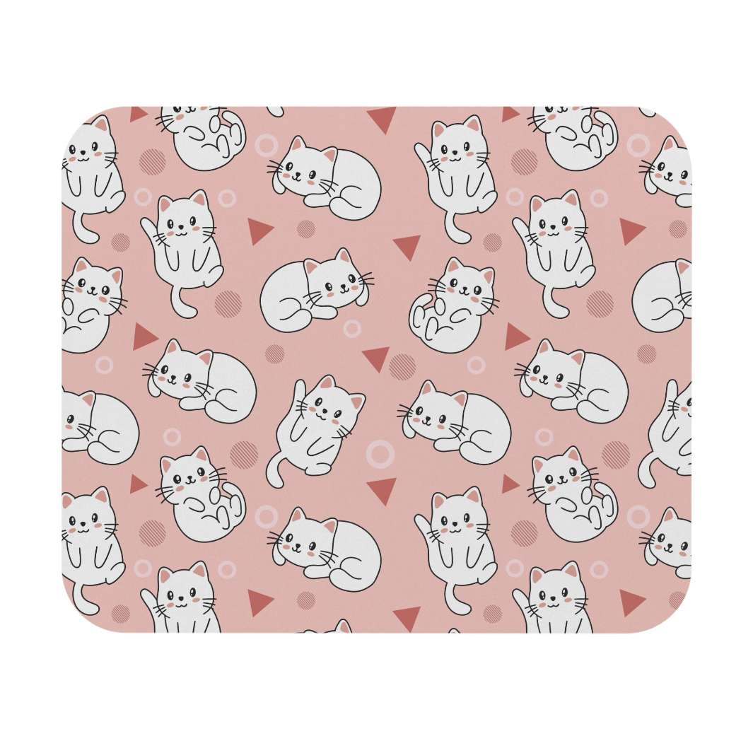 Measuring at a convenient size of 9″ × 8″ with rounded edges, our mouse pad provides ample space for smooth navigation while ensuring a comfortable fit on any desk or workstation. Its sleek design features a delightful light pink background adorned with charming white cartoon cats in a variety of playful positions. Accentuating the whimsical theme are small dark pink triangles and circles scattered between the cats, adding a touch of flair to your workspace.
