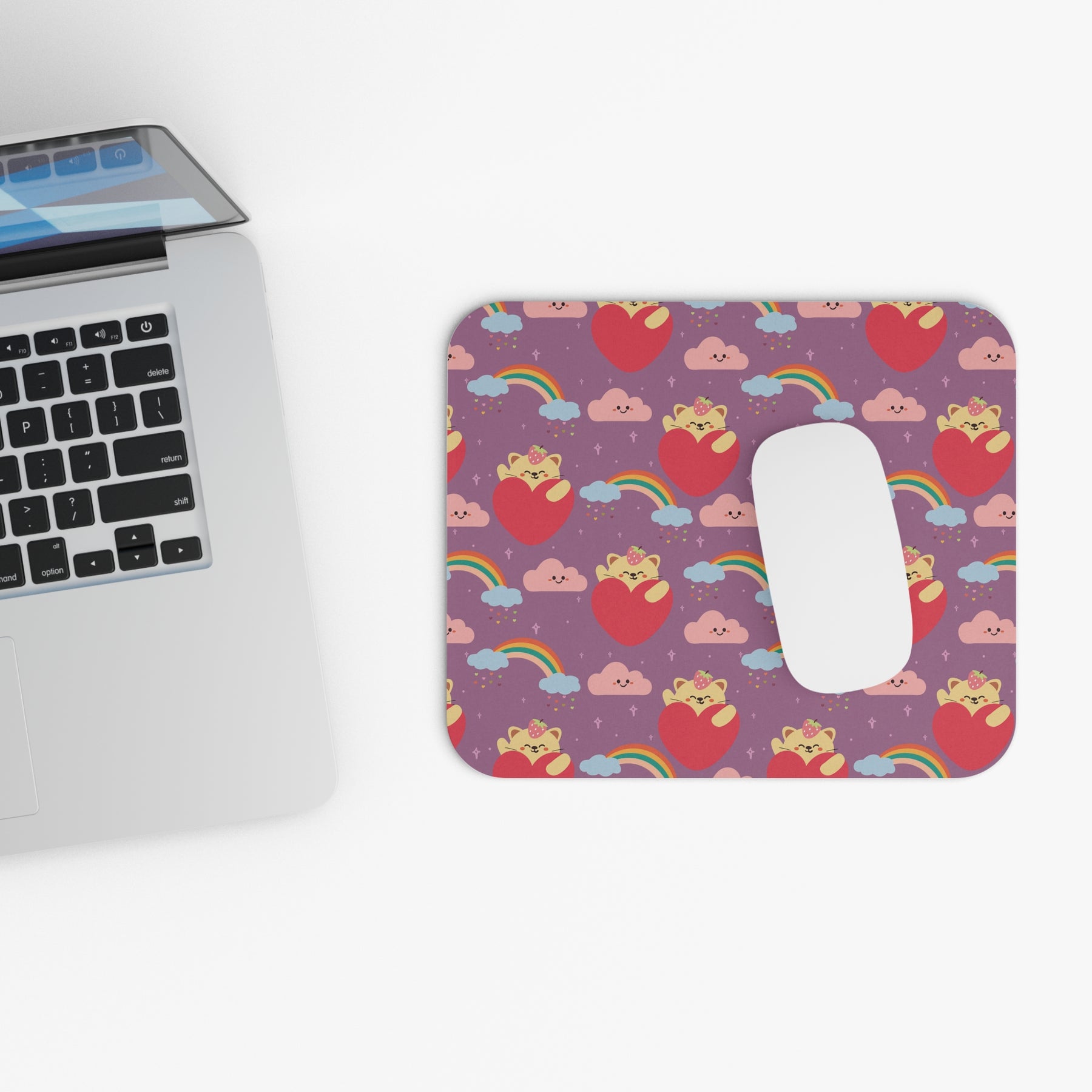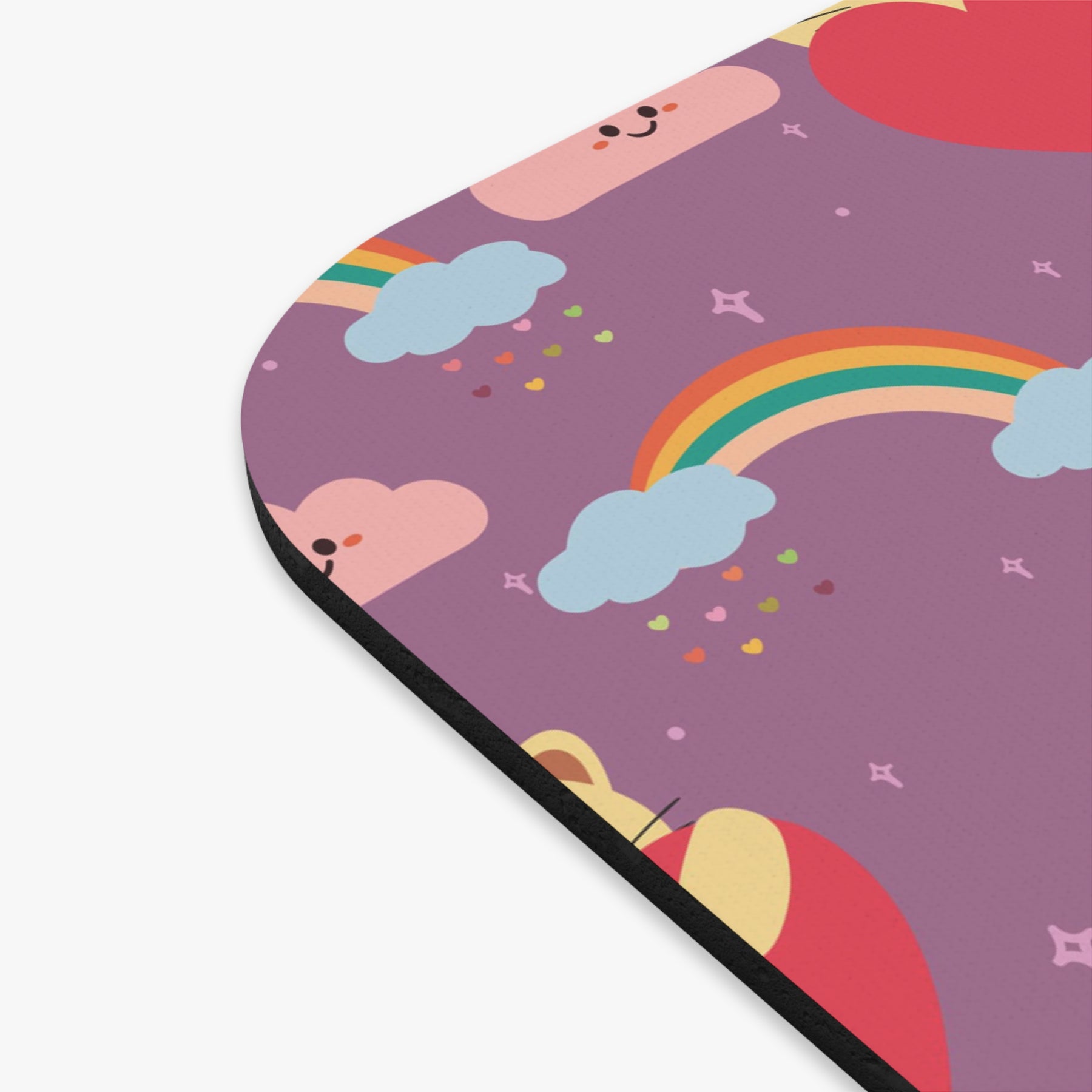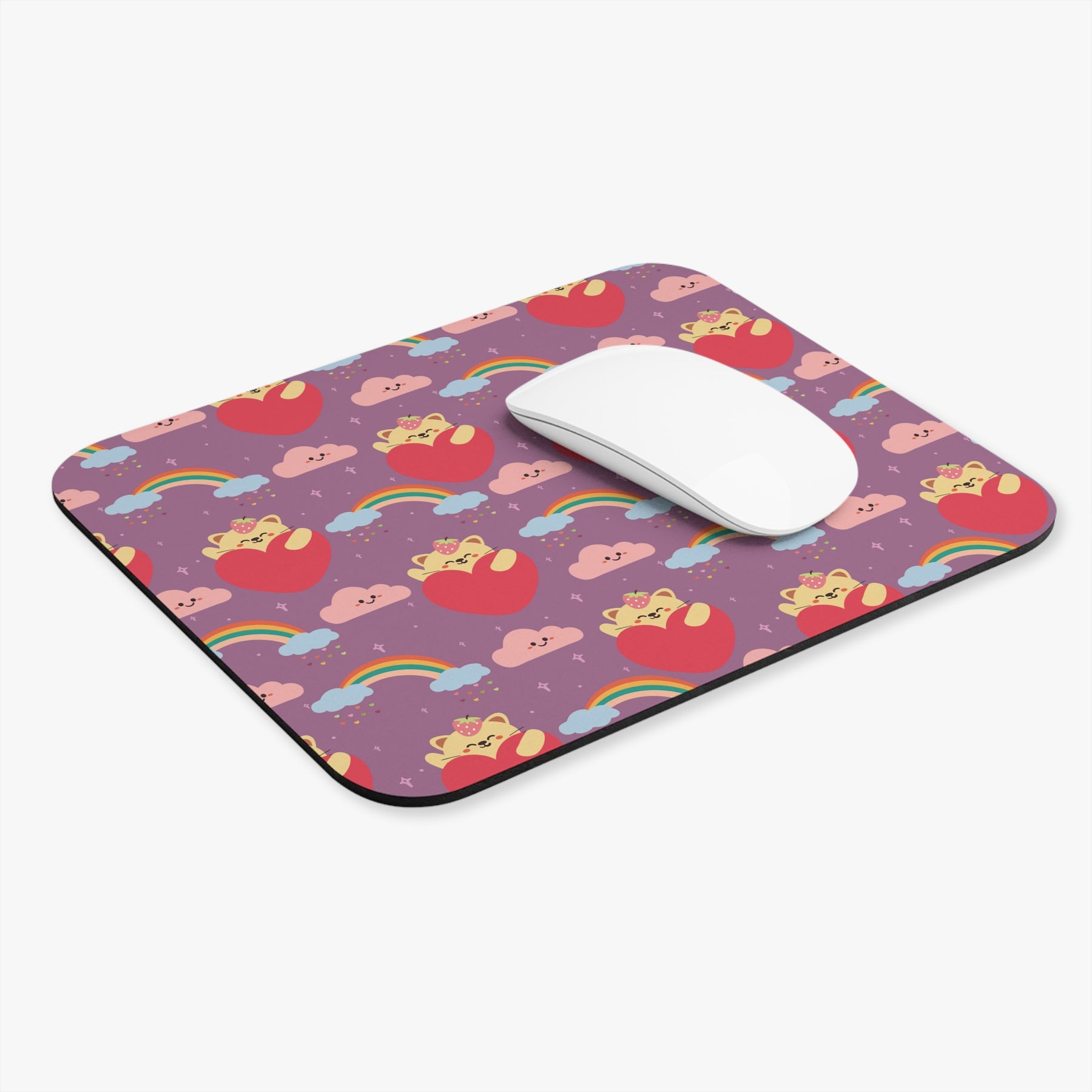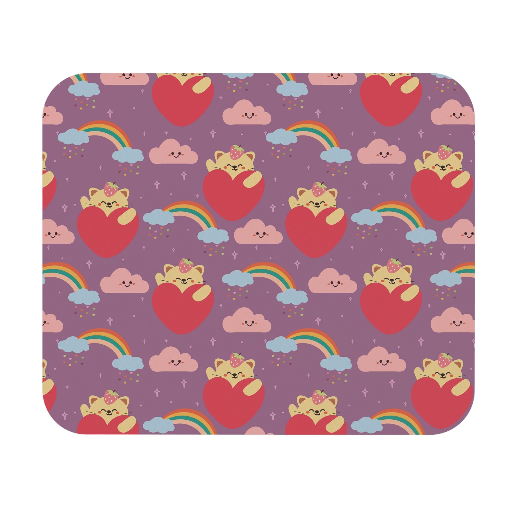 Introducing the Rainbow Paw Prints Mouse Pad – an irresistible addition to your workspace that will make you smile every time you use it! This mouse pad features a vibrant purple background adorned with playful rainbows, with adorable yellow cartoon cats peeking out from behind large red hearts. As if that weren't enough cuteness, fluffy pink clouds float above, completing the whimsical and delightful design.
