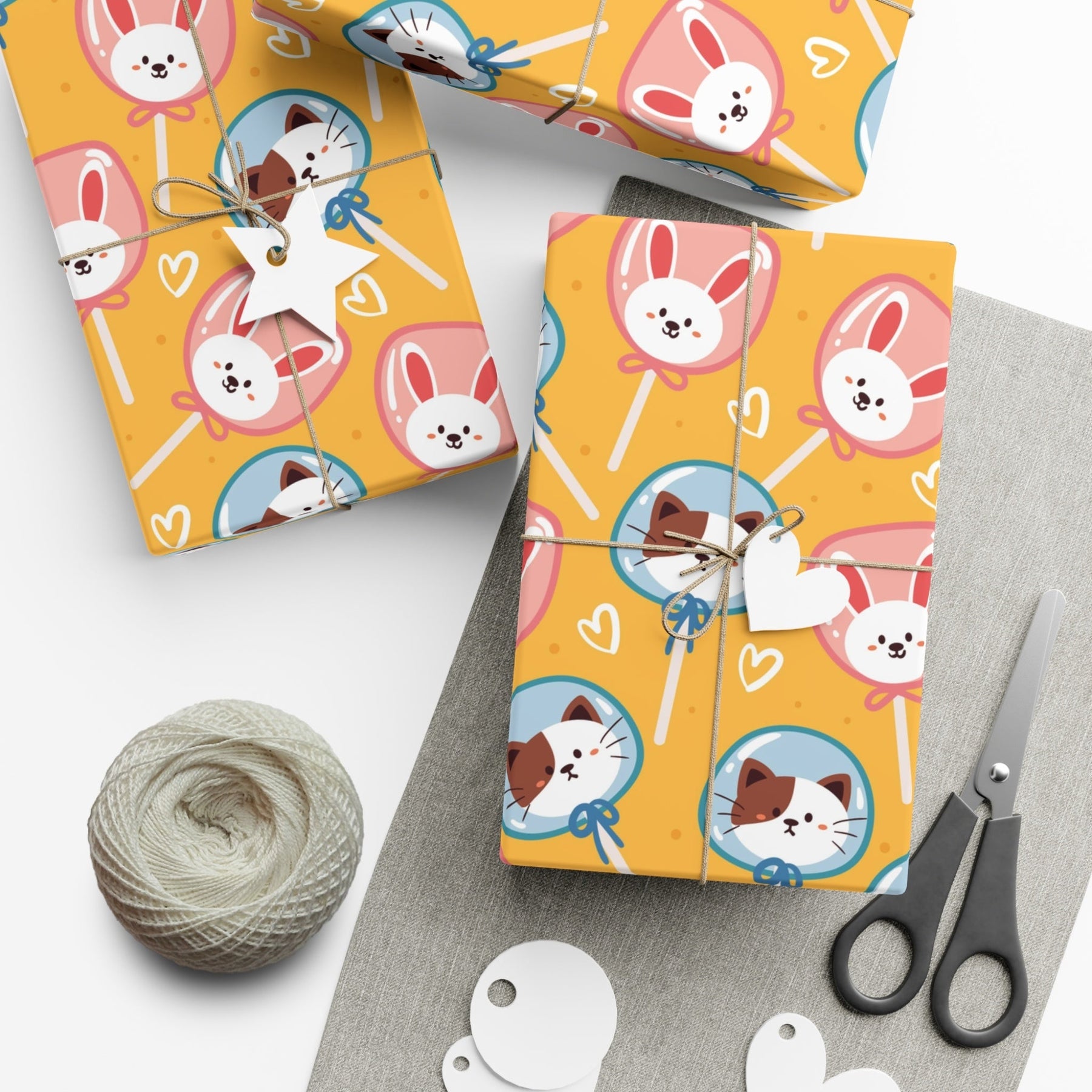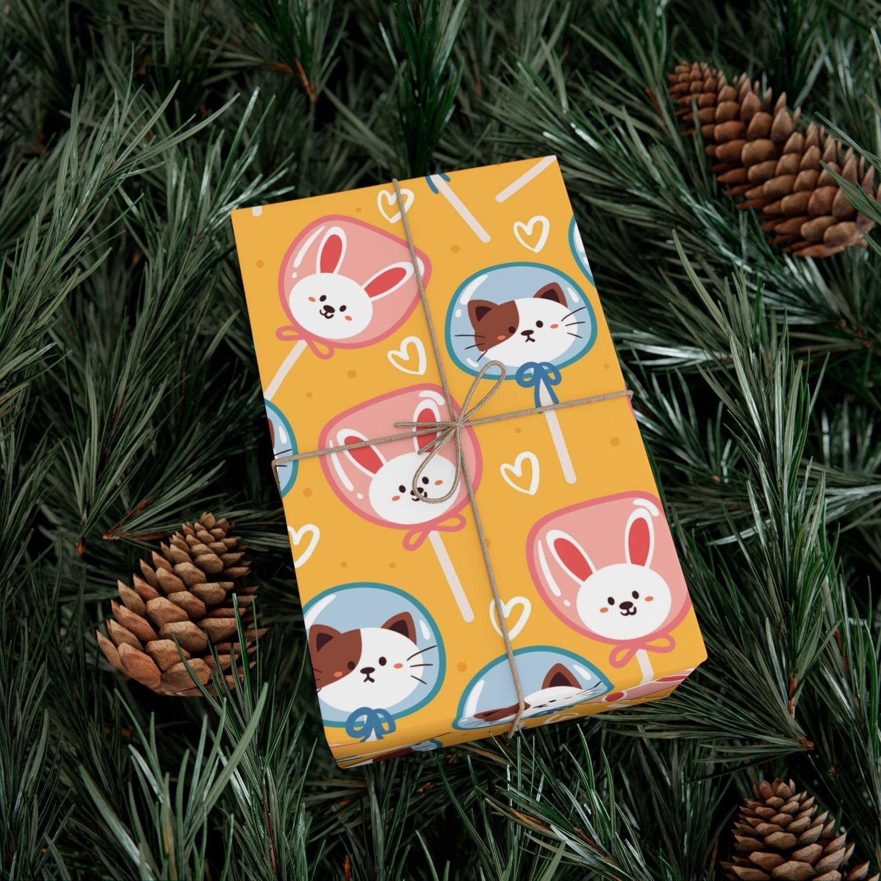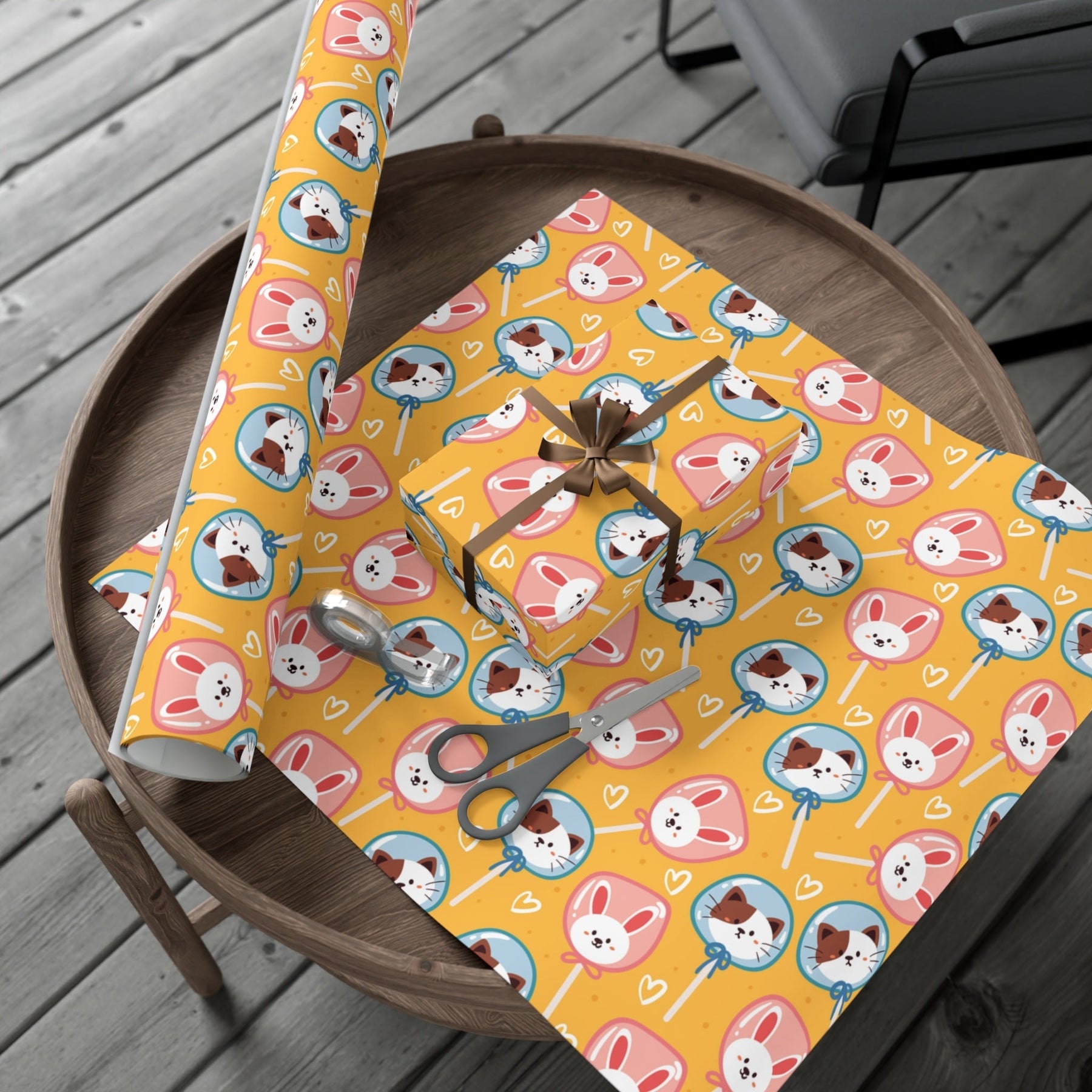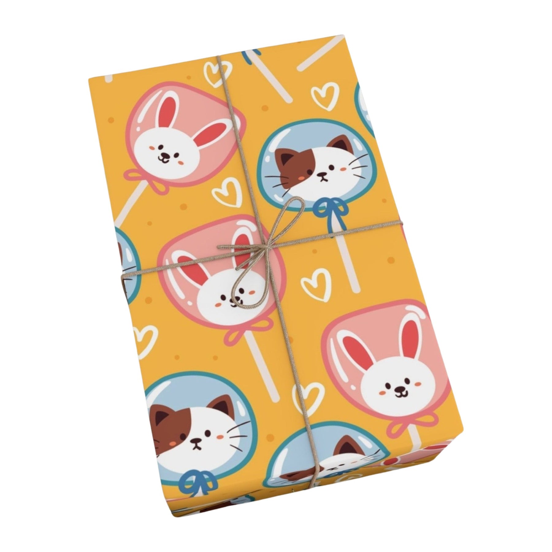 Introducing Candy Cat Gift Wrap - the purrfect way to add a touch of feline charm to your gift-giving adventures! With its delightful design featuring a brown and white calico cat head nestled inside a blue lollipop and a white rabbit head peeking out of a pink lollipop, this gift wrap will have anyone's heart melting with adoration.