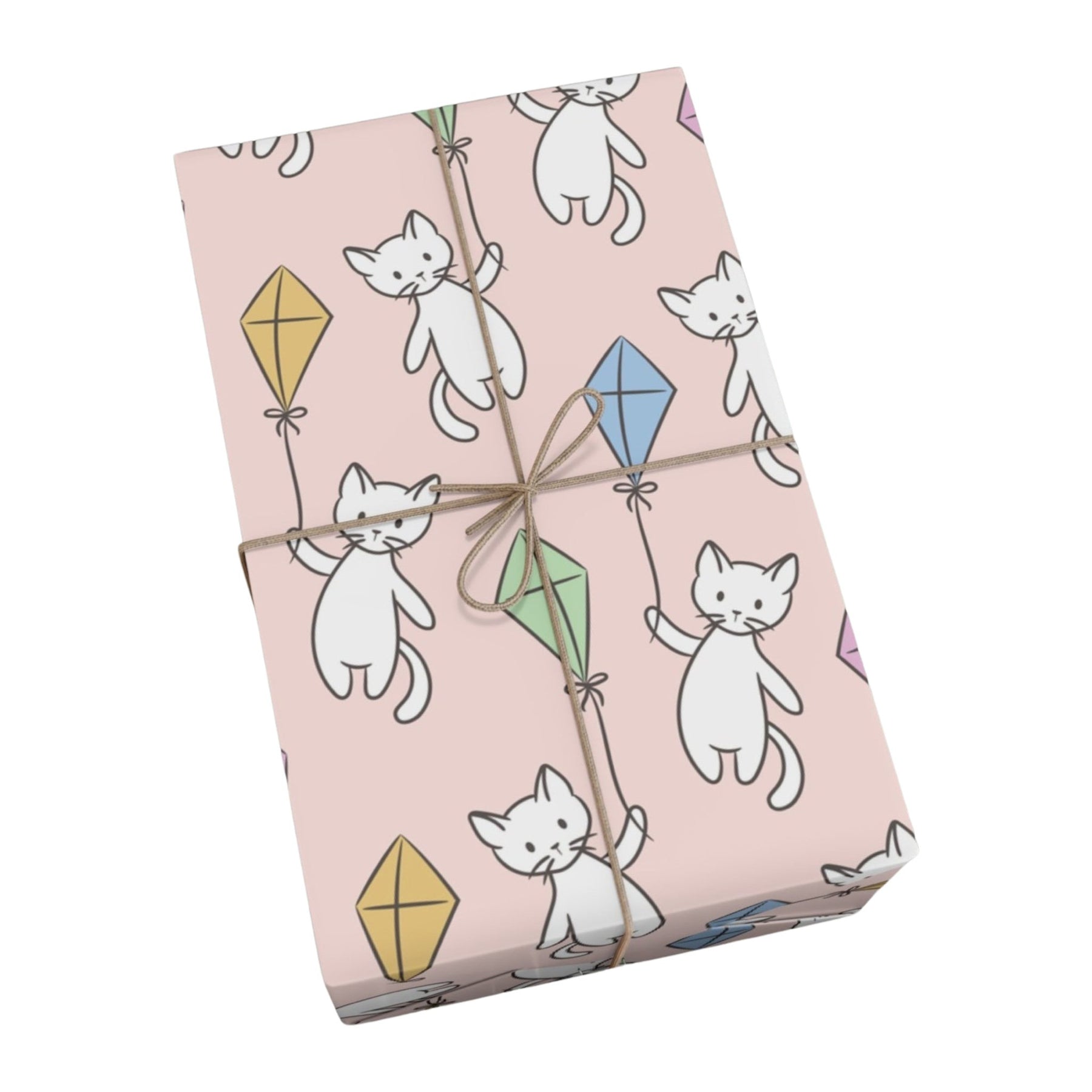 As you delve into the exquisite design, you'll discover a flock of white cartoon cats, each proudly clutching their own vibrant kites. The kites, in hues of pink, yellow, blue, and green, dance gracefully in the breeze, bringing an uplifting and joyous energy to the scene. Join these delightful feline companions on their kite-flying extravaganza and let your gift wrap reflect the same sense of enchantment and play that our furry friends bring into our lives.