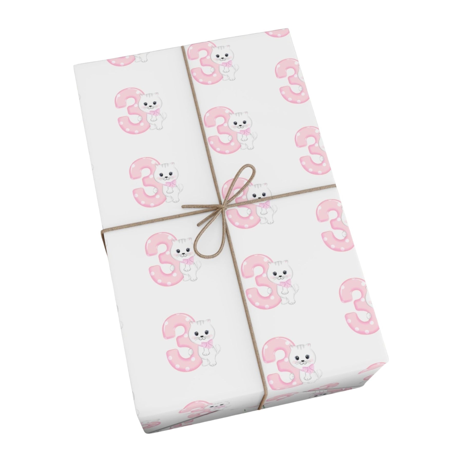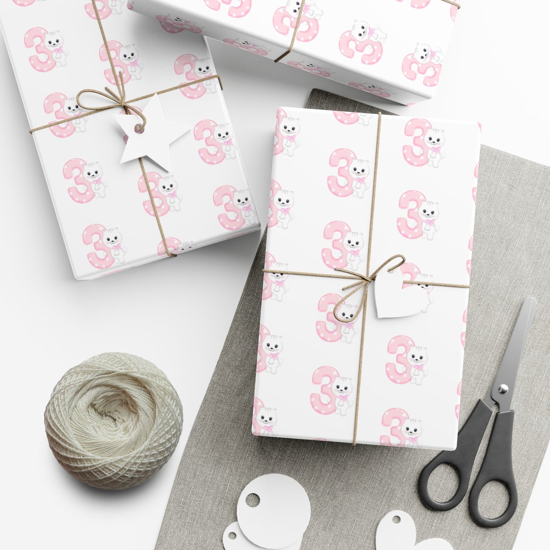 Do you have a special little human in your life who's celebrating their 3rd birthday? Make this big day extra special with our beautiful Happy 3rd Birthday Cat Gift Wrap! With its adorable cartoon cat adorned with a pink bowtie and a bright pink 3 with white polka dots, this gift wrap is the perfect way to add extra love and joy to the occasion!