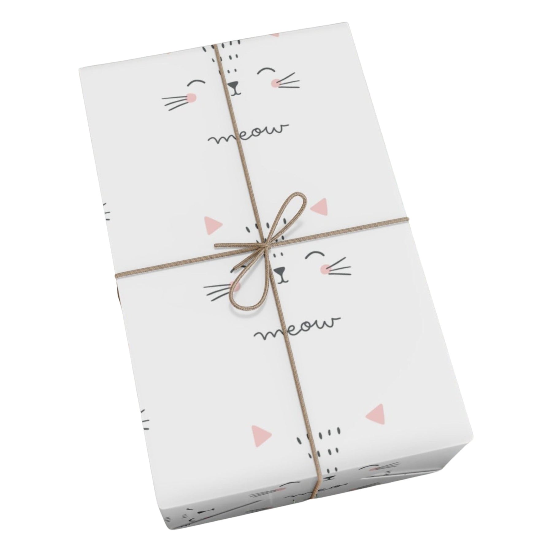 Meow Gift Wrap has a playful, white background with the word "meow" written in playful cursive. But what truly sets this wrap apart are the added little details: a sketch of some friendly cat eyes and whiskers, plus adorable pink cat ears and cheeks. It's paw-sitively delightful!
