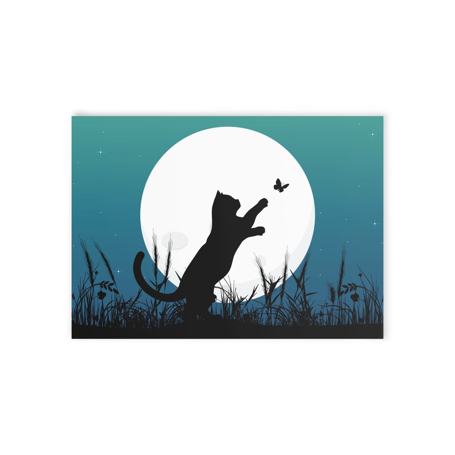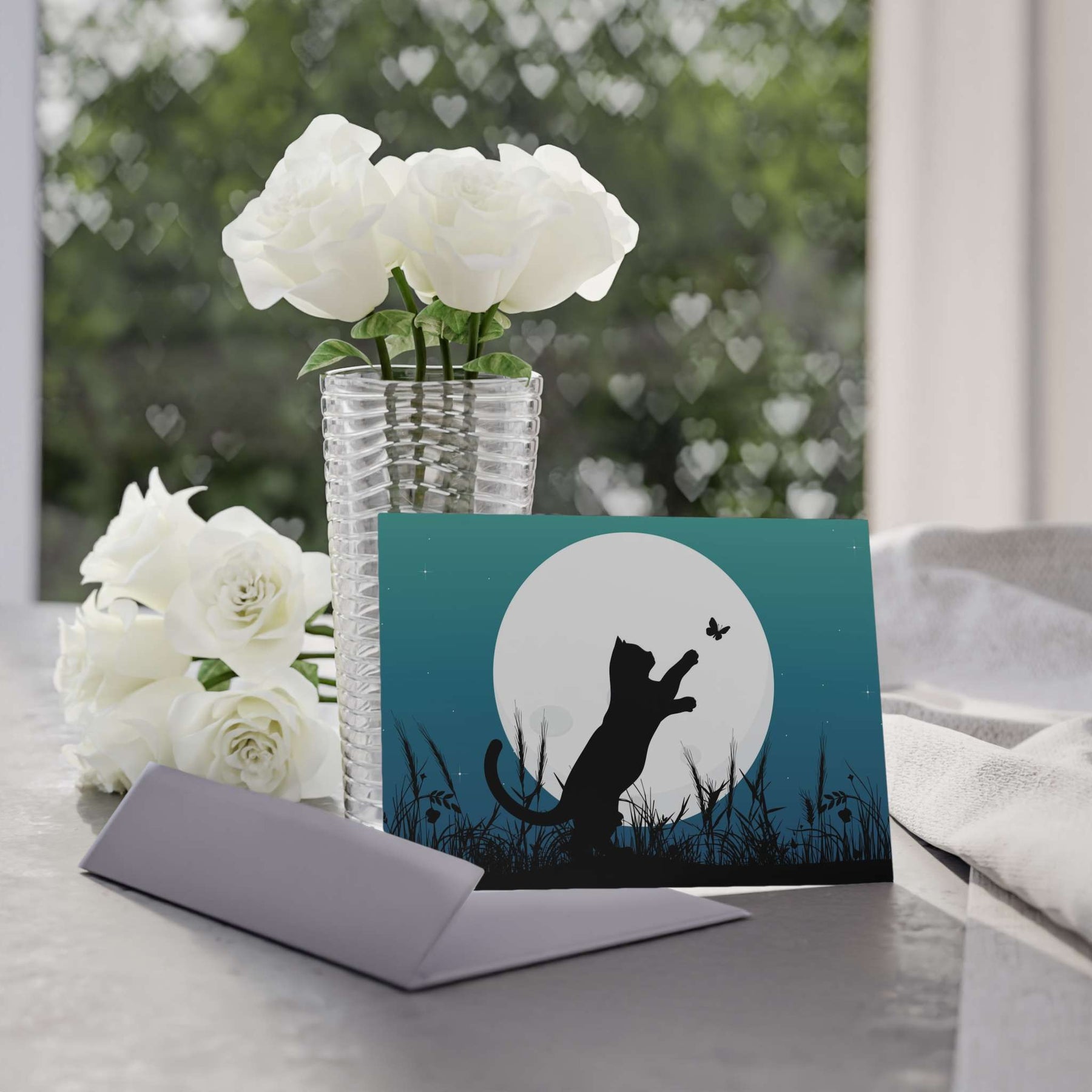 Have you been looking for the purr-fect way to let your friends or loved ones know you're thinking of them? Well, the Moonlight Kitty Card is your meow-velous solution! Featuring a mysterious inky black kitty reaching for a fluttering butterfly in the glow of a full moon on a rich teal background, this card is paw-sitively perfect for conveying casual and cute greetings without a whiff of stuffiness.