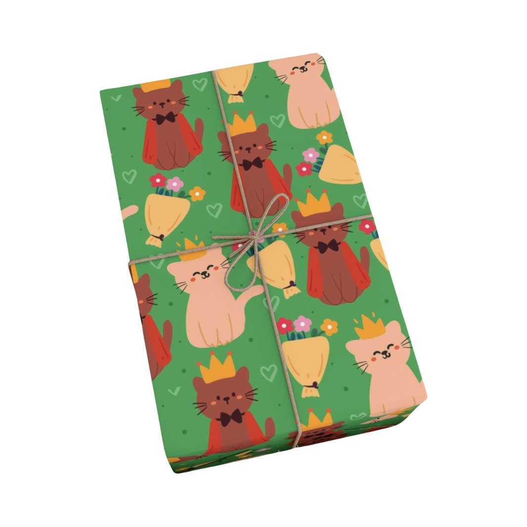 But what truly sets Royal Cat Gift Wrap apart is the delightful design. Gazing at it, you'll be immediately captivated by a charming brown cartoon cat proudly wearing a crown, a black bow tie, and a majestic royal robe. This elegant feline exudes an air of sophistication that is simply irresistible. And not to be outdone, a light tan cartoon girl cat, also sporting a crown, shares the stage, adding a touch of playfulness and whimsy.