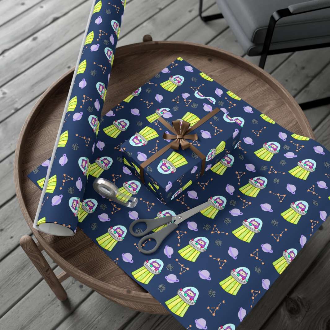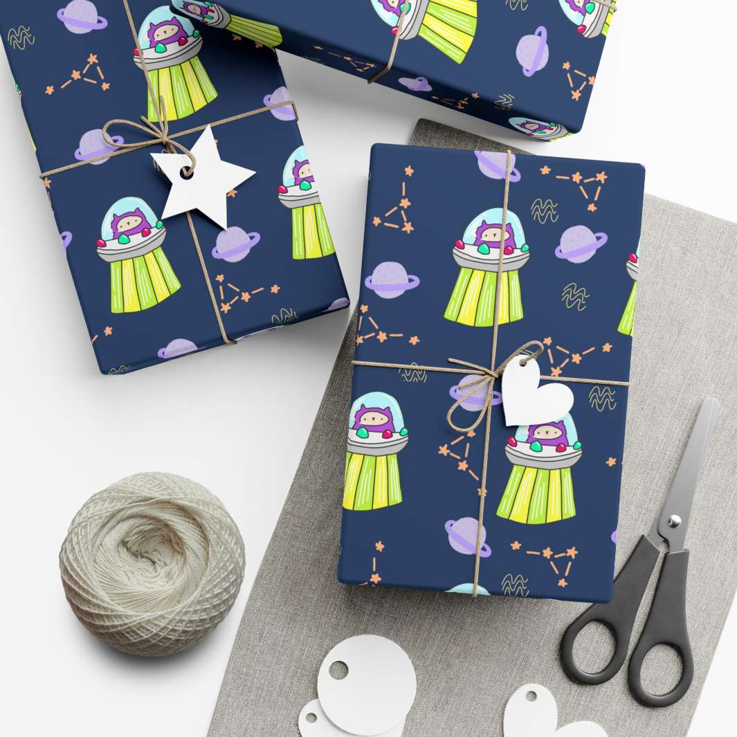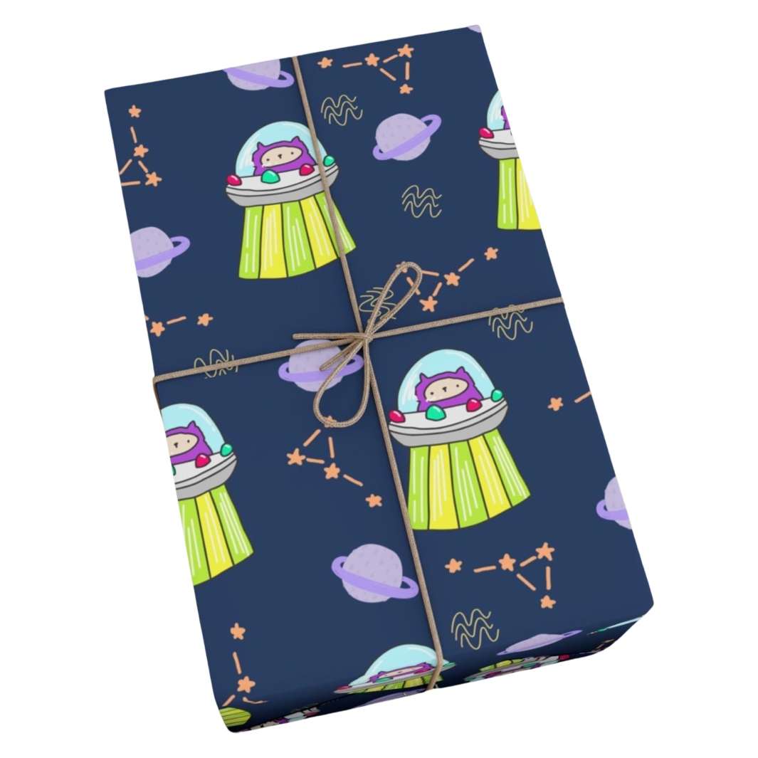 Make every gift a wild ride with UFO Cat Gift Wrap! This vibrant wrap is the perfect way to make any present stand out from the crowd. Featuring an awesome blue background filled with fun cartoon cats flying around in UFOs, plus a colorful splash of green and blue rays of light shooting off towards a shower of bright purple planets and constellations - what’s not to love?