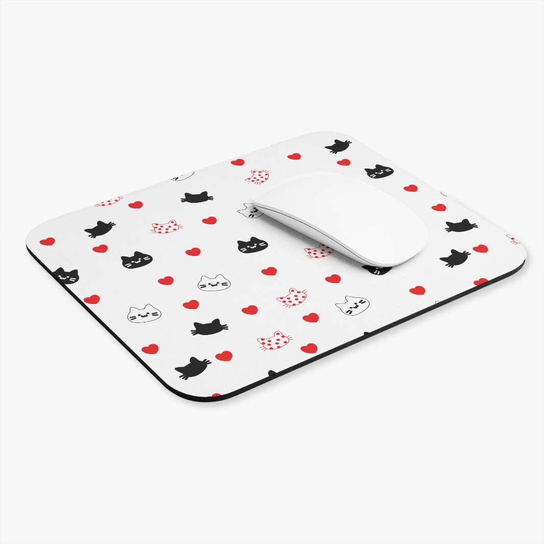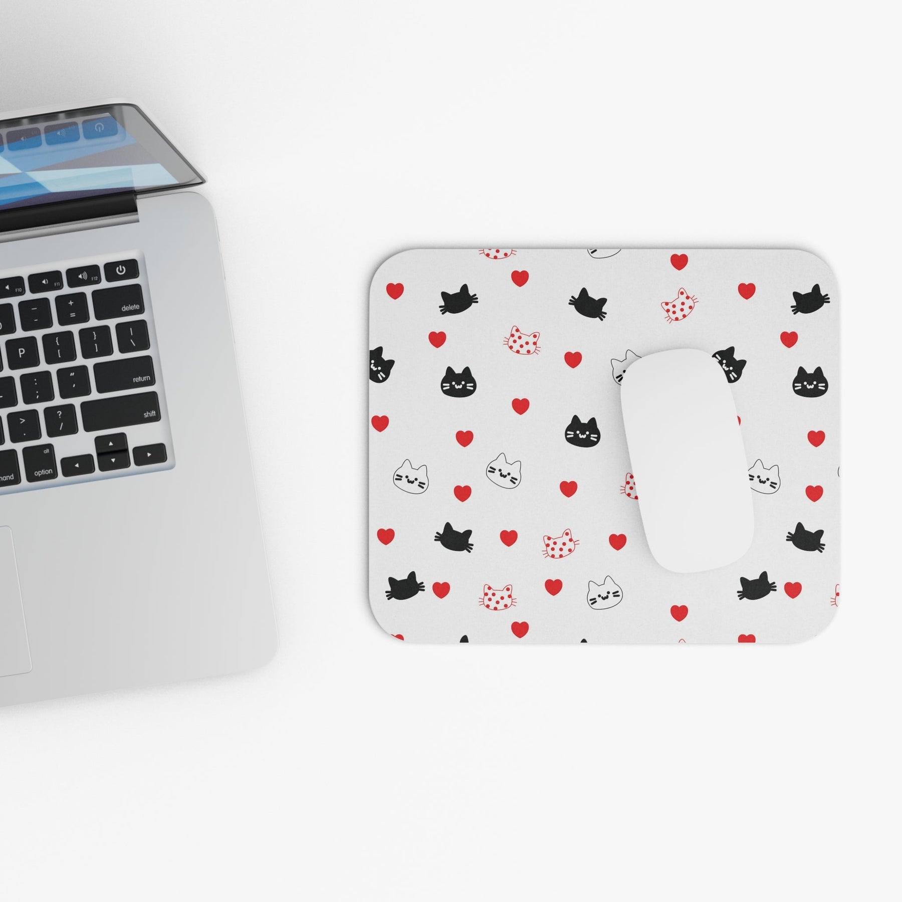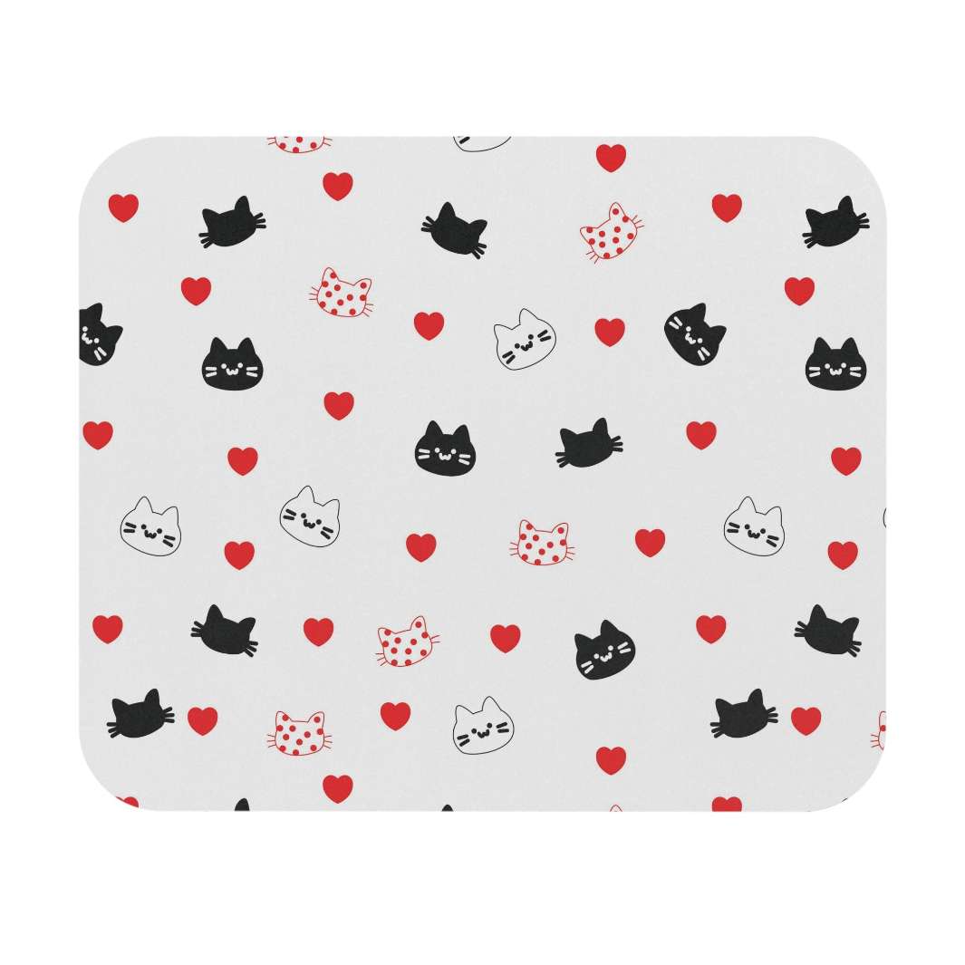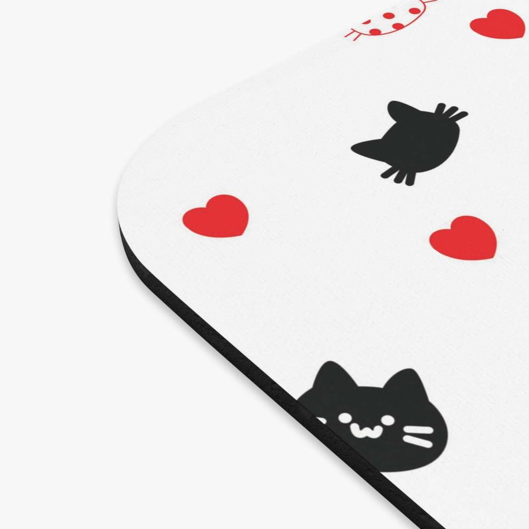 Designed with love and crafted with care, our Cat Love Mouse Pad boasts a stunning white background adorned with charming red hearts, along with black and red patterned kitty cartoon faces that are sure to make your heart melt. This delightful combination of colors and patterns is enough to make any cat lover's heart skip a beat!