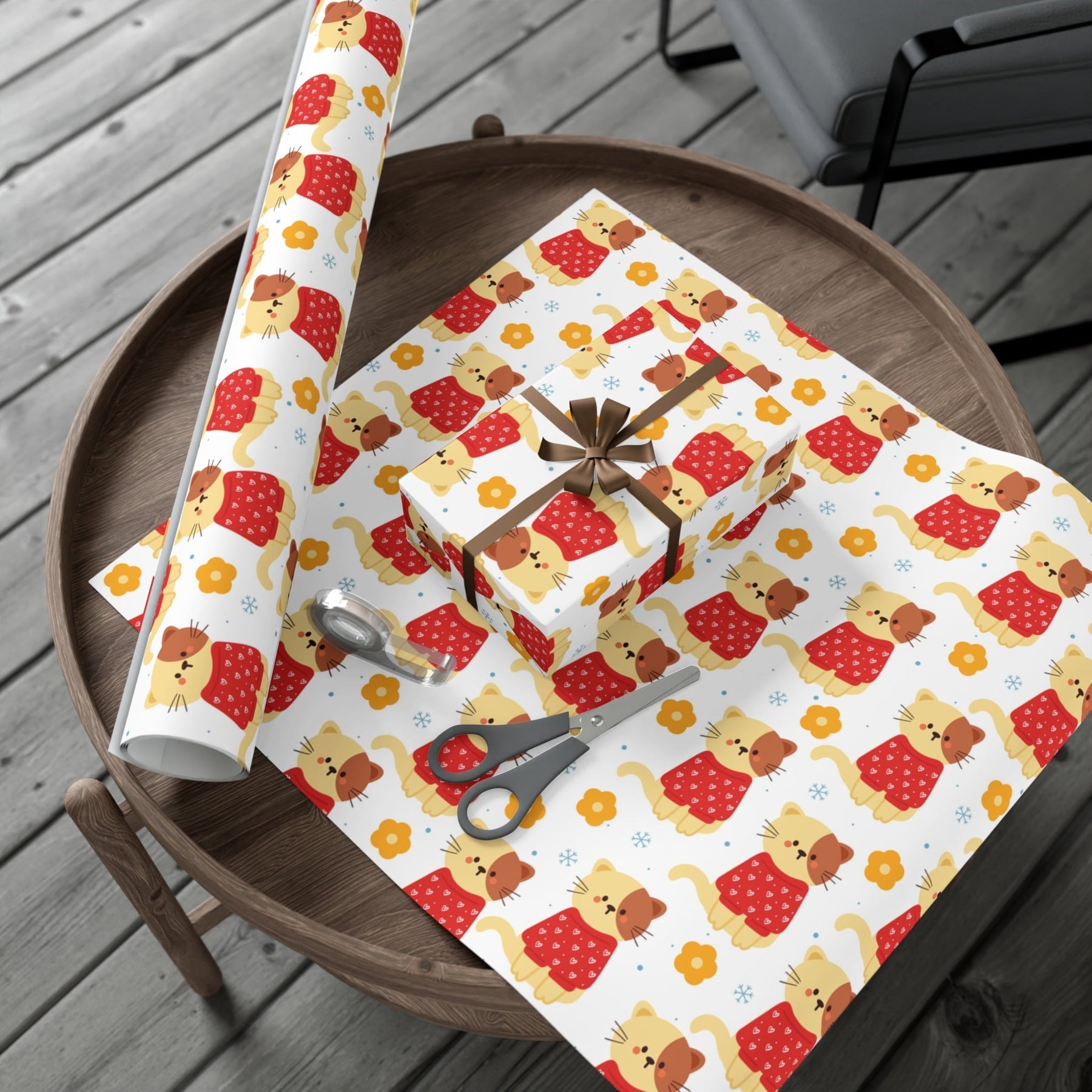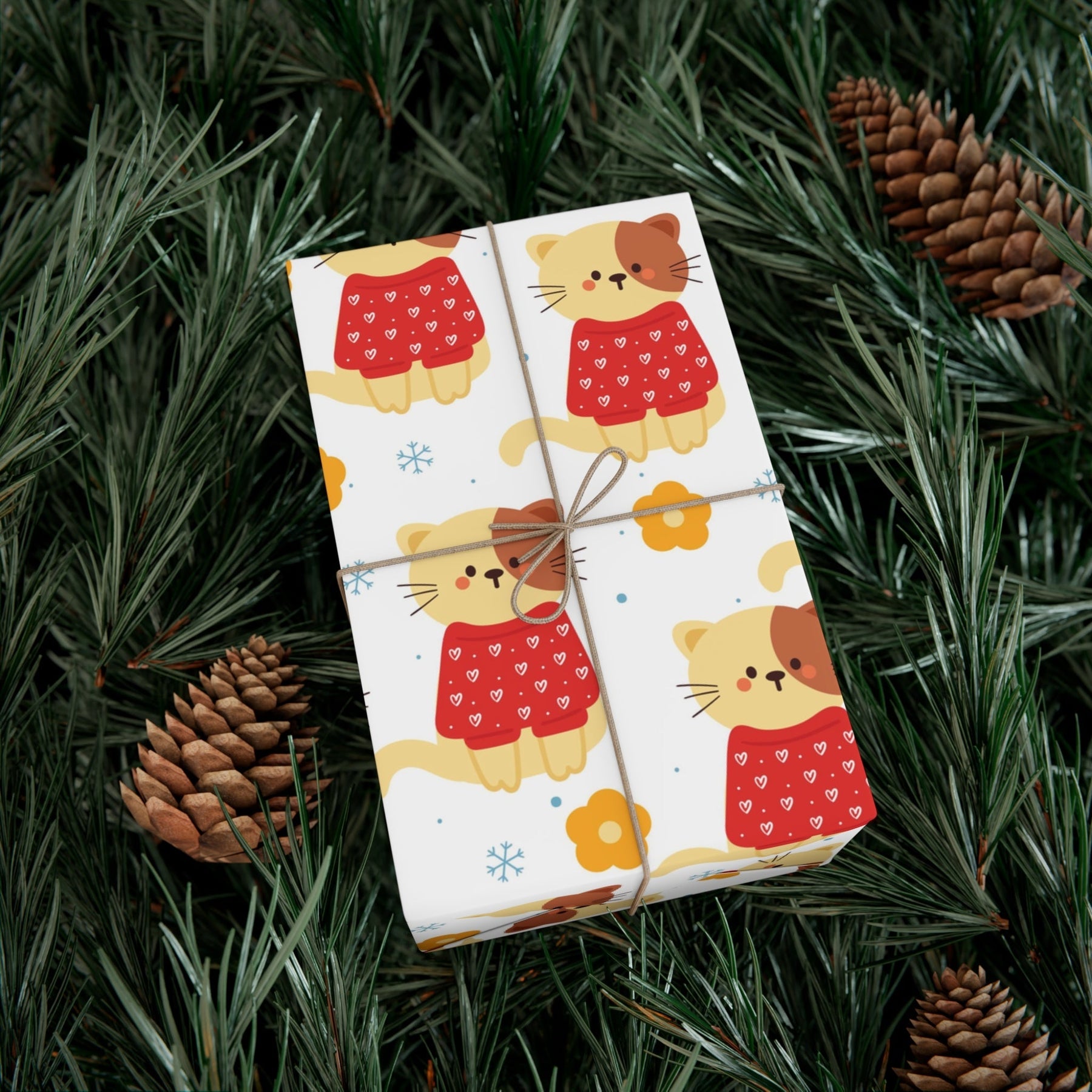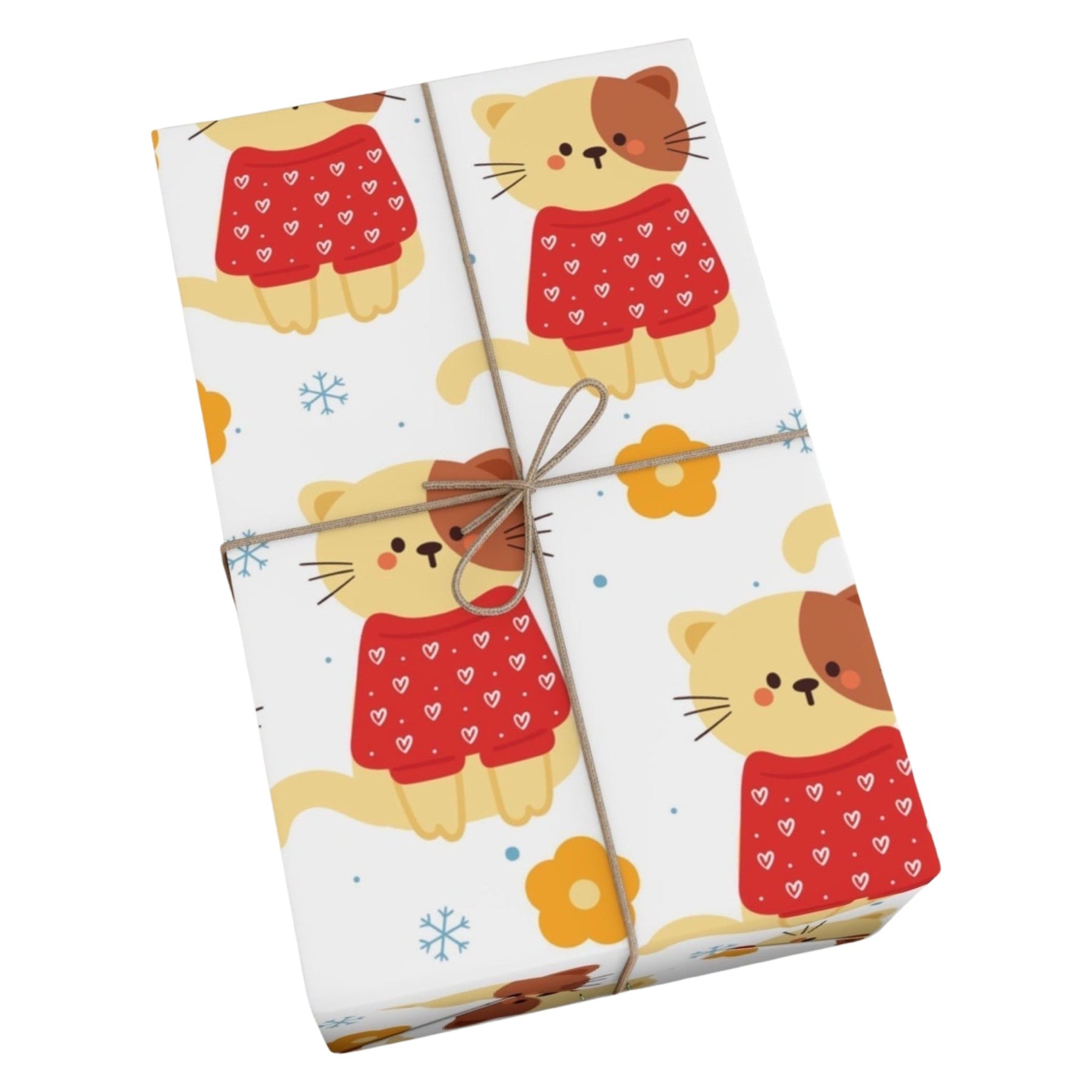 Introducing the purrfect way to make your gifts be the cat's meow - the Heart Sweater Cat Gift Wrap! This delightful and charming wrapping paper will instantly bring a touch of feline cheer to any present that lucky someone is about to receive. With its playful design featuring adorable tan and brown cartoon cats in a cozy red sweater adorned with white hearts, small blue snowflakes, and yellow flowers, this gift wrap will undoubtedly steal the hearts of cat lovers everywhere.