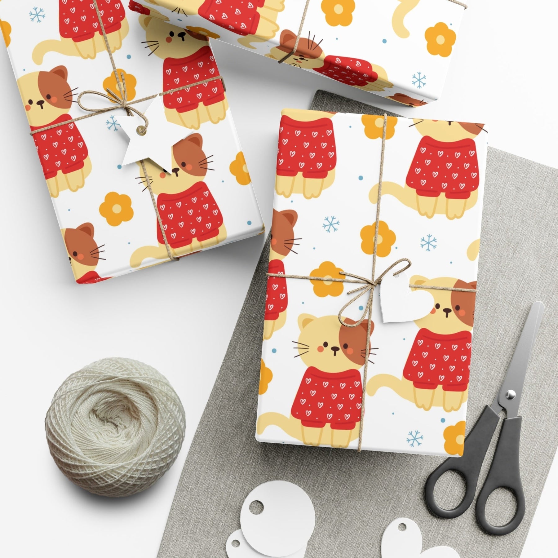 To cater to all your gifting needs, we offer three different sizes of our Heart Sweater Cat Gift Wrap. Whether you have a delightful little trinket to wrap or a grand surprise that needs impeccable presentation, we have you covered. From the small size, perfect for jewelry or small accessories, to the larger size, ideal for clothing or larger boxed gifts, we have a size that suits any occasion.