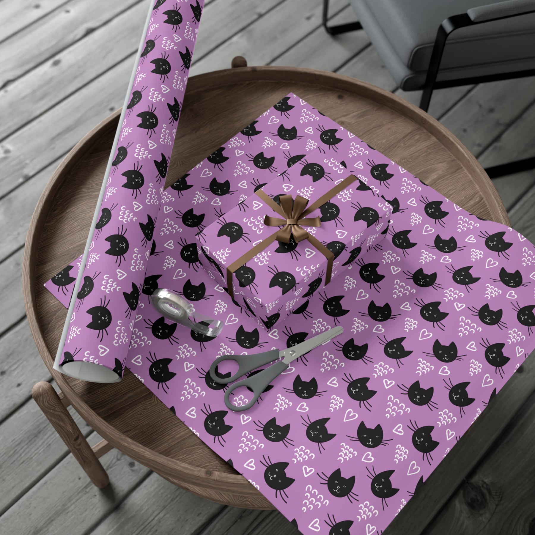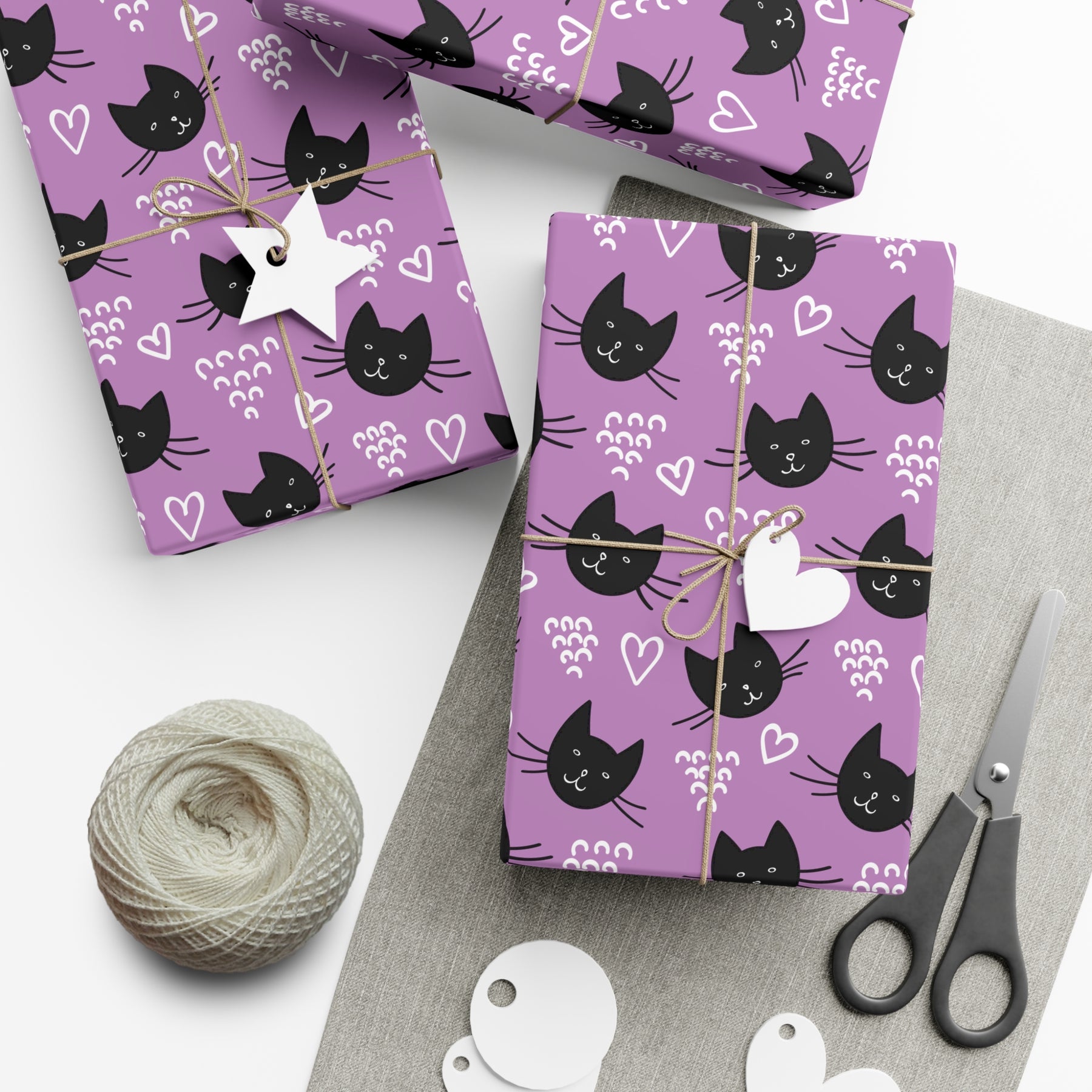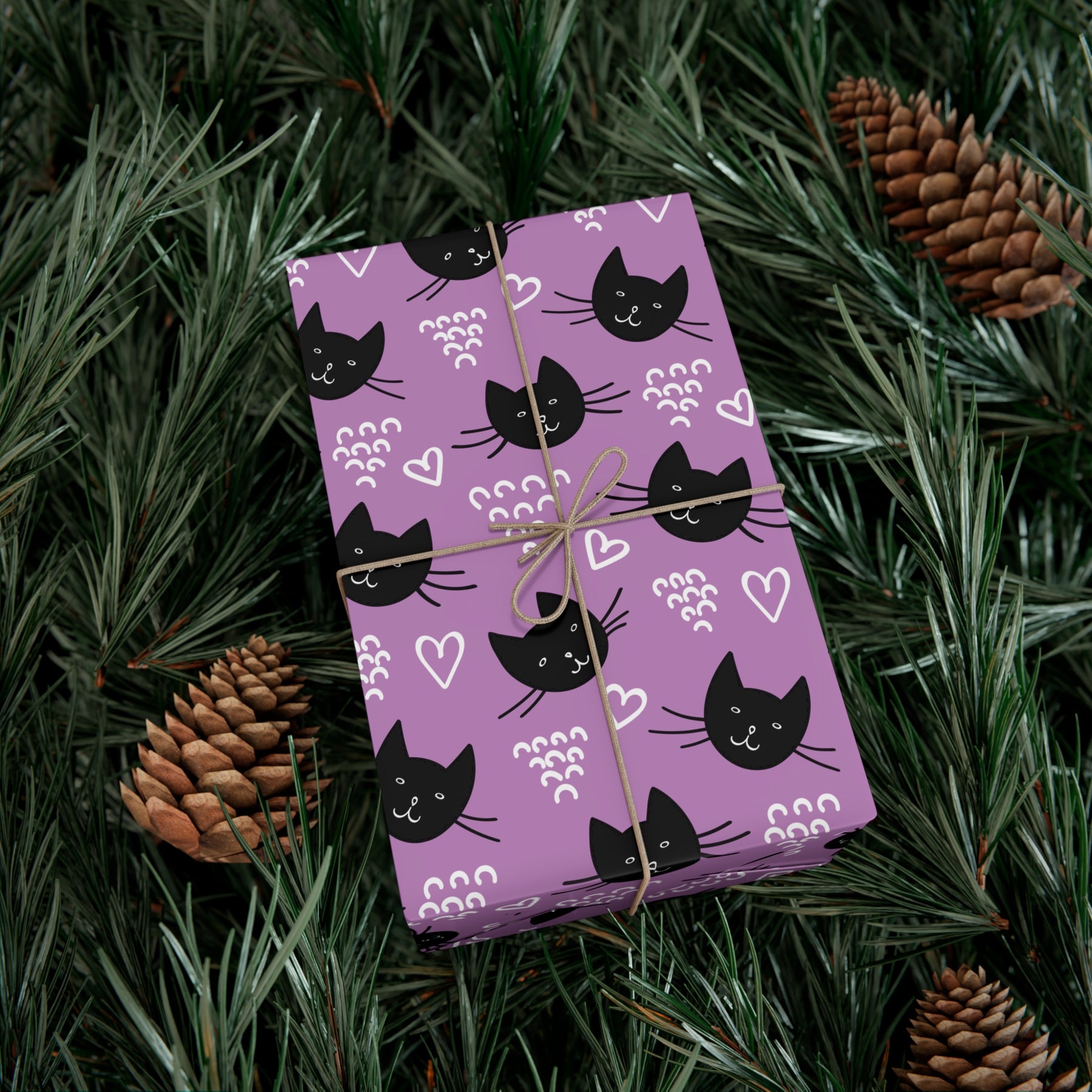 The vibrant purple background sets the stage for a whimsical scene that will put a smile on anyone's face. With the cheerful black cartoon cat heads beaming from corner to corner, surrounded by a sea of little white hearts and charming doodles, this gift wrap is a delightful sight that is sure to spread happiness and love. It's the perfect representation of the unconditional love and joy that our furry friends bring into our lives.