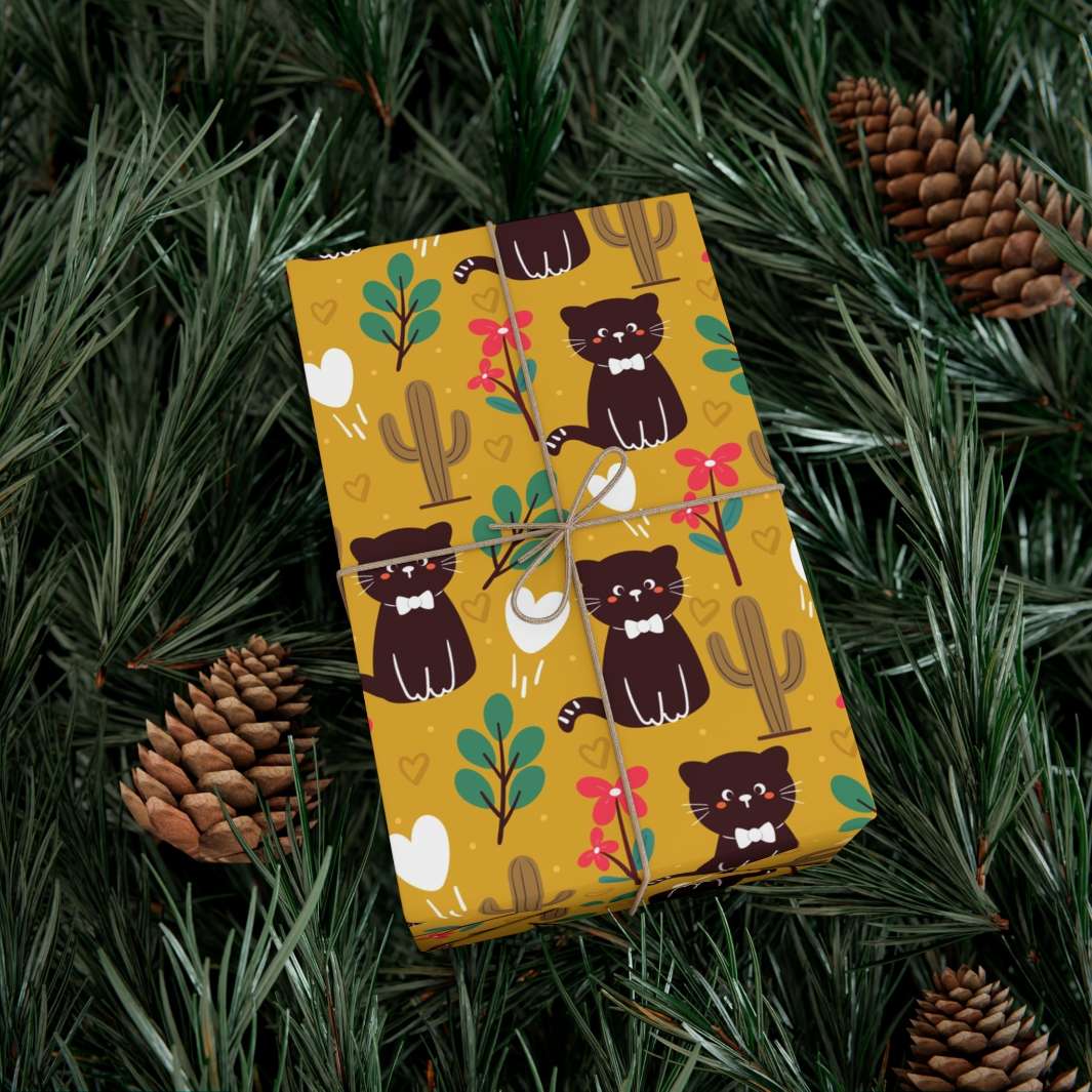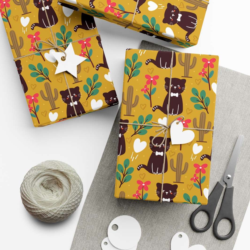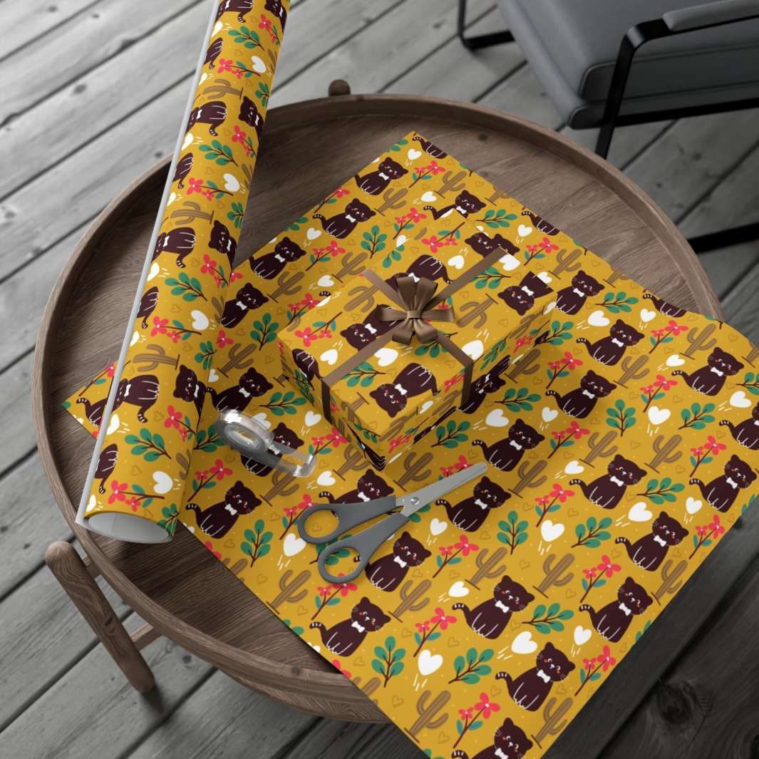 Introducing the vibrant and irresistibly quirky Cactus Cat Gift Wrap! Prepare to whisk your loved ones away to a whimsical desert dreamscape as they unwrap their precious presents. This one-of-a-kind gift wrap combines the boldness of a mustard yellow background with the playful charm of a black cartoon cat donning a dashing white bow tie. But that's not all! We've added a delightful touch of nature with a cactus adorned with lush green leaves and vibrant red flowers, bringing the beauty of the desert right to your fingertips.