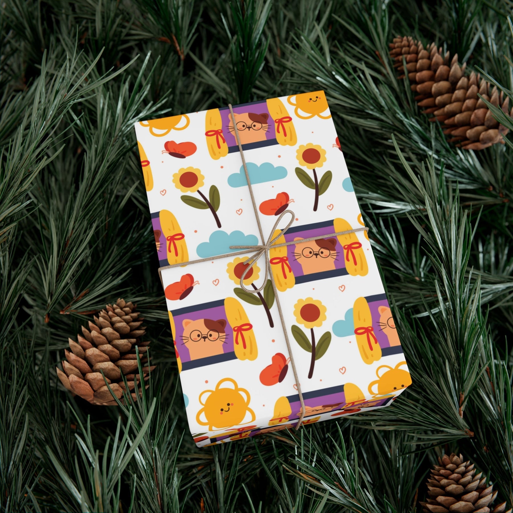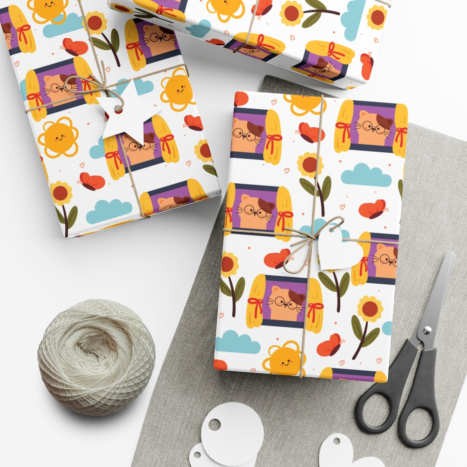 Wrap your gifts in a whimsical and charming way with our Cat in the Window Gift Wrap! Perfect for any occasion, this gift wrap features a white background adorned with a peach and brown cartoon cat wearing glasses. Behind the cat, a purple background and bright yellow curtains with bold red tie backs create a playful and inviting scene. But the fun doesn't stop there, as a smiling yellow sun, fluttering red butterflies, fluffy blue clouds, and vibrant sunflowers add even more character to this delightful design.