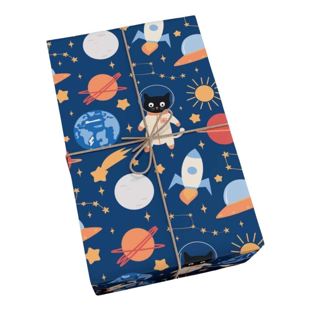 Our Cats and Planets Gift Wrap is the purr-fect way to add some stars to your life! Featuring a dark night blue background emblazoned with black cartoon cats in astronaut suits and helmets, surrounded by planets, constellations, stars, suns, UFO's, and rockets. This gift wrap packs an out of this world design full of fun and whimsy for any occasion.