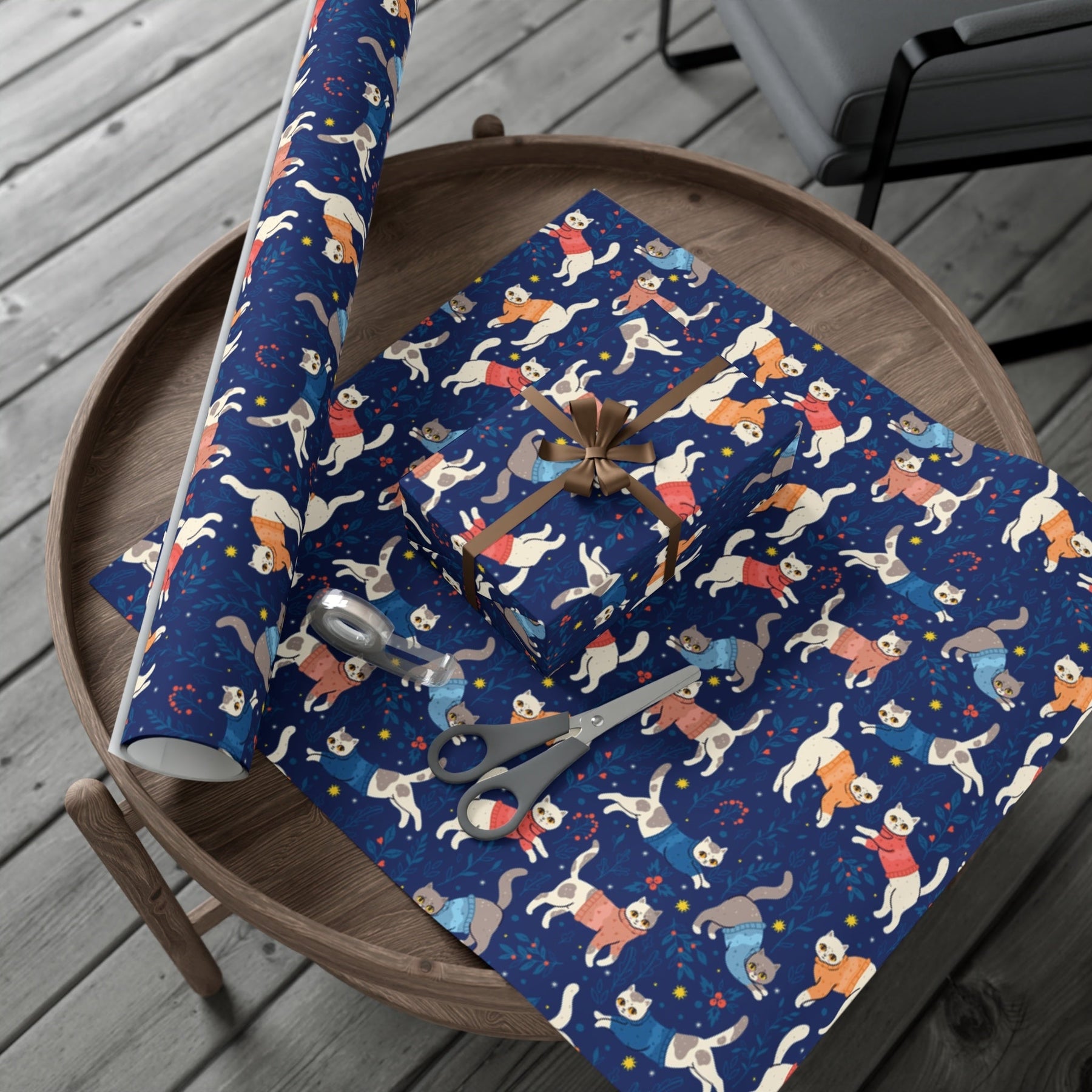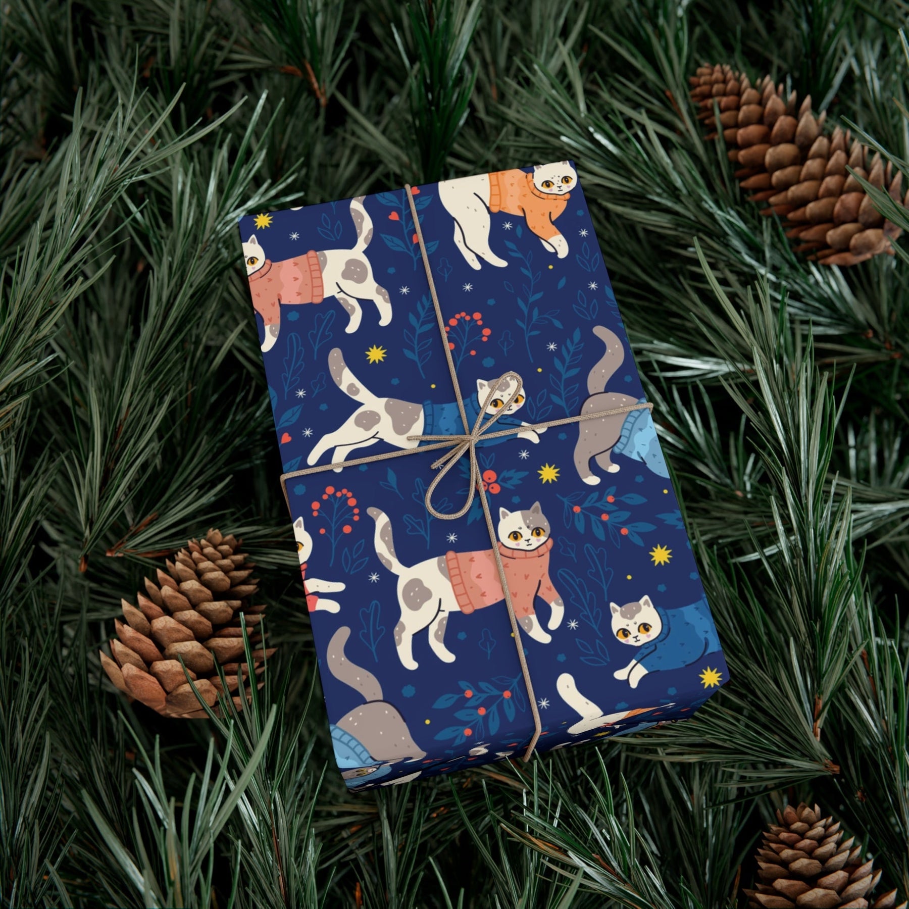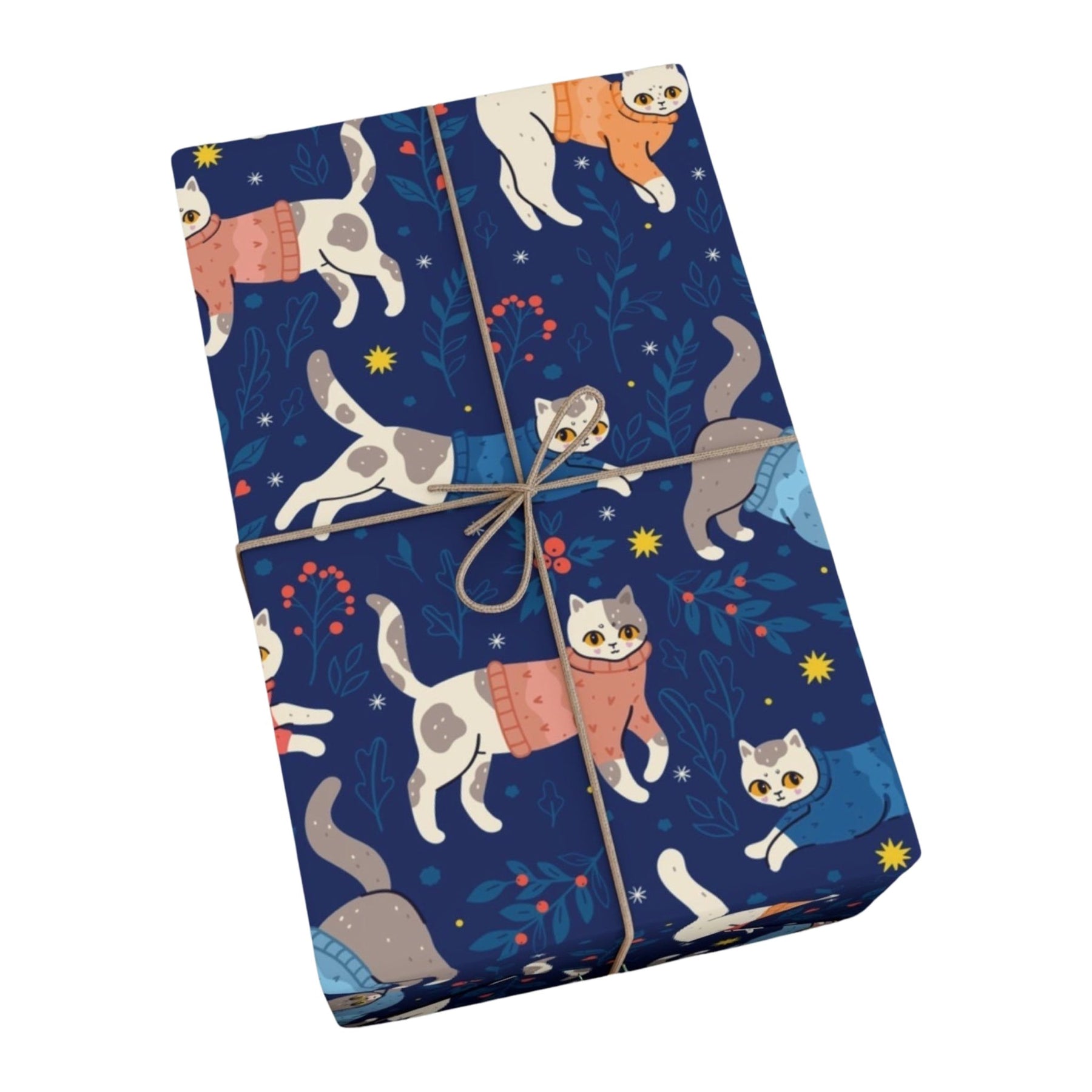 Are you ready to take your gift-giving game to the next level? Introducing Cats in Sweaters Gift Wrap, the purr-fect way to add an extra touch of feline flair to your presents. With its dark blue background adorned with adorable cartoon cats donning cozy sweaters, this gift wrap is guaranteed to make any cat lover's heart melt.