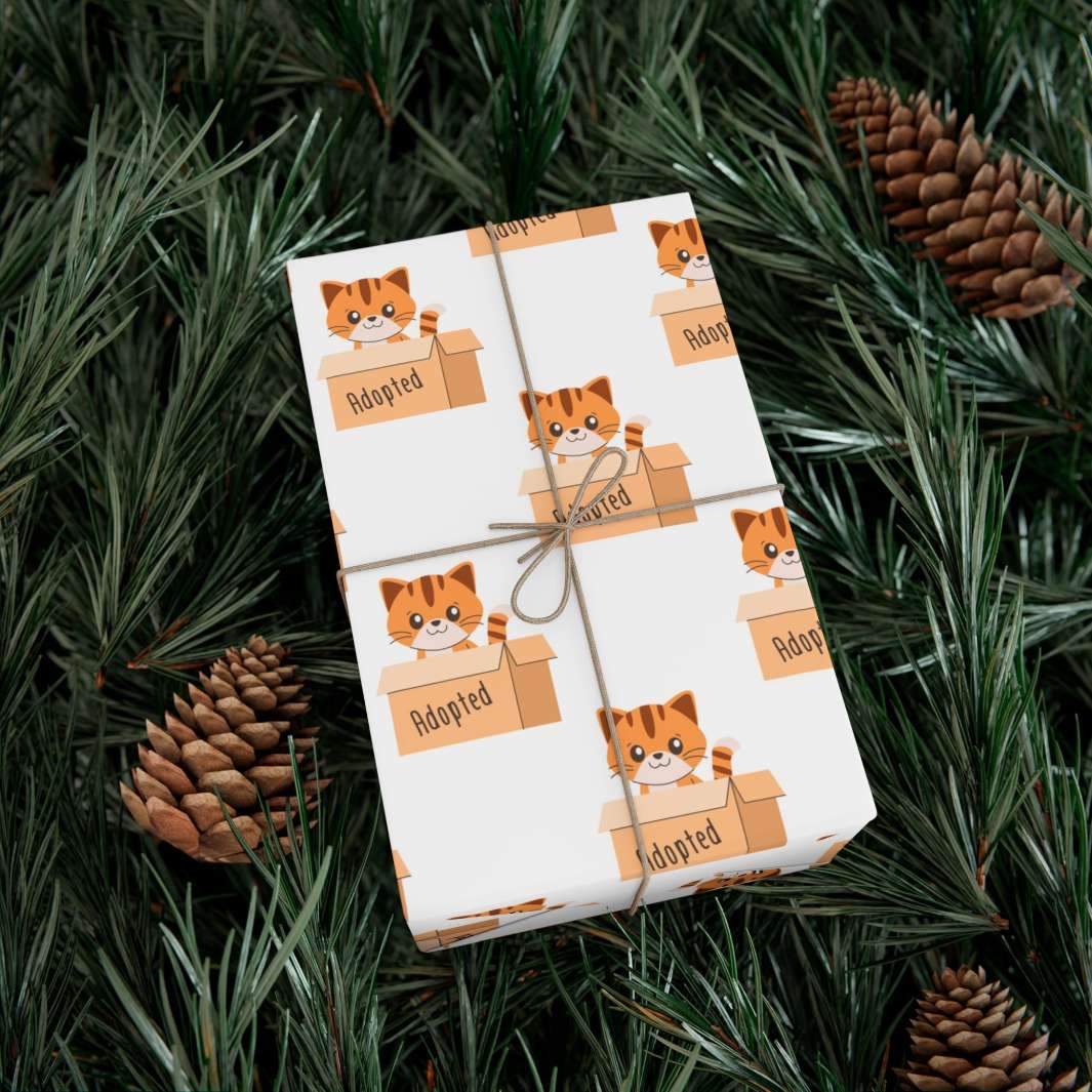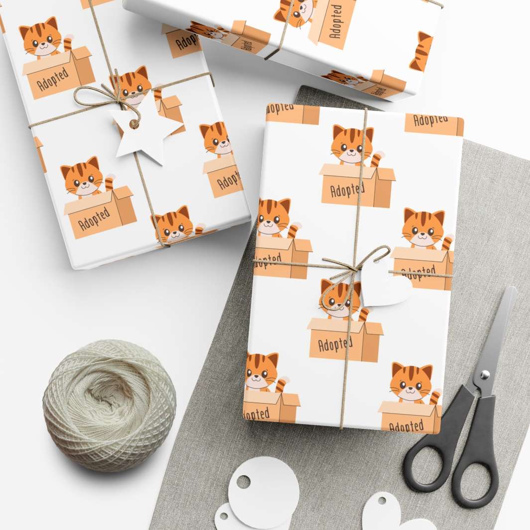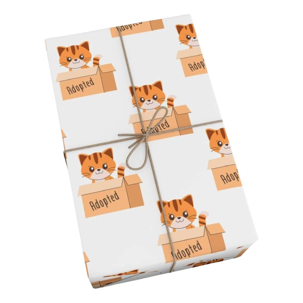 Picture this: a crisp white background, a vibrant orange tabby cat sitting inside a charming cardboard box that proudly displays the word "Adopted." This delightful design is sure to put a smile on anyone's face, making it an ideal choice for wrapping gifts that celebrate the joy of adding a new furry family member.