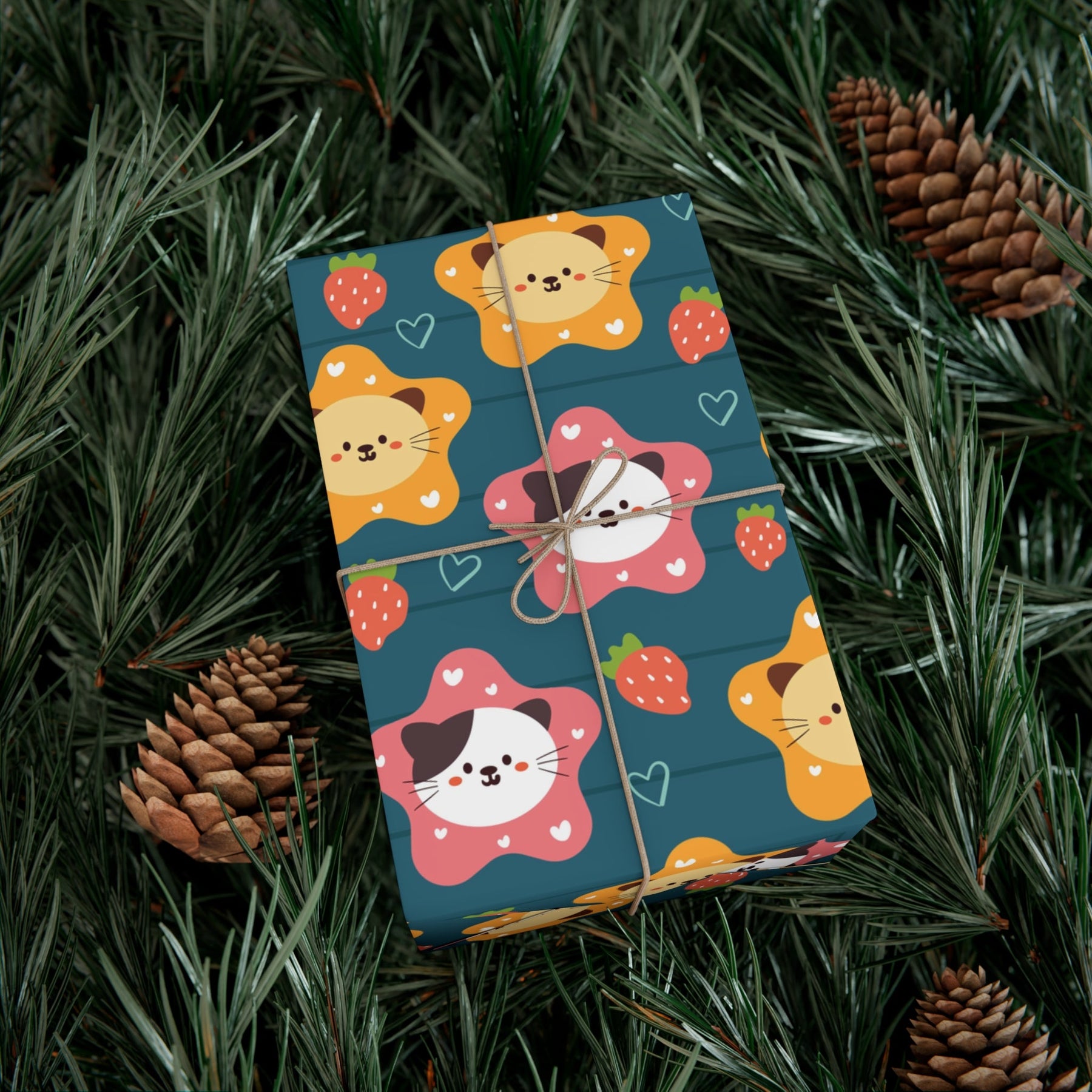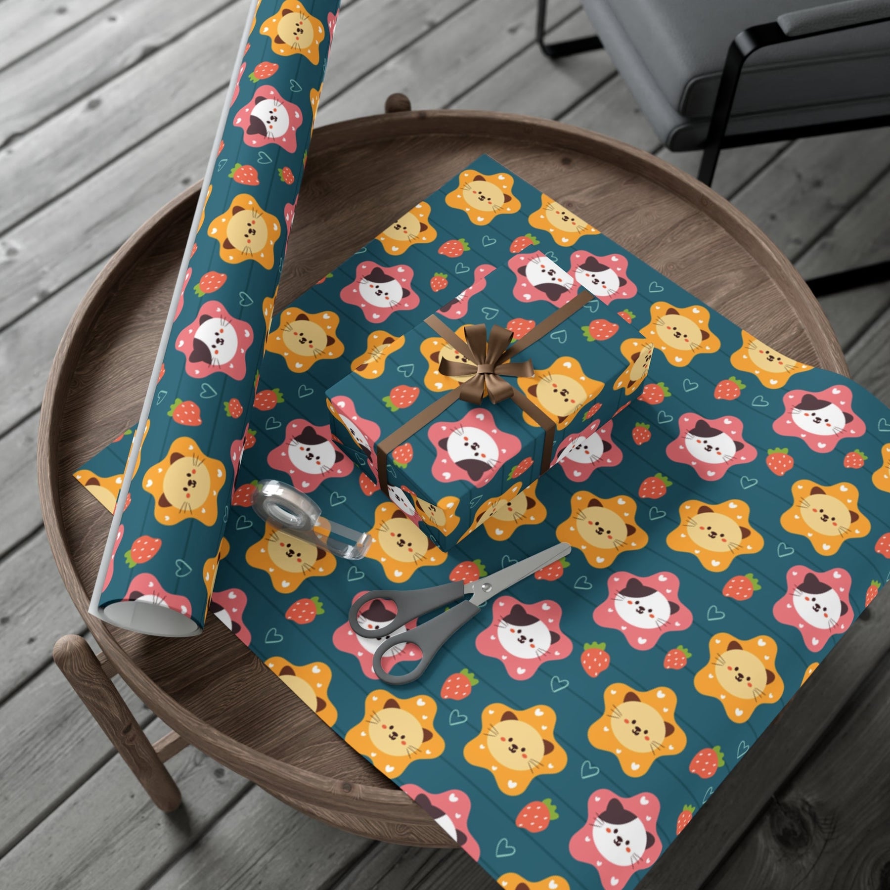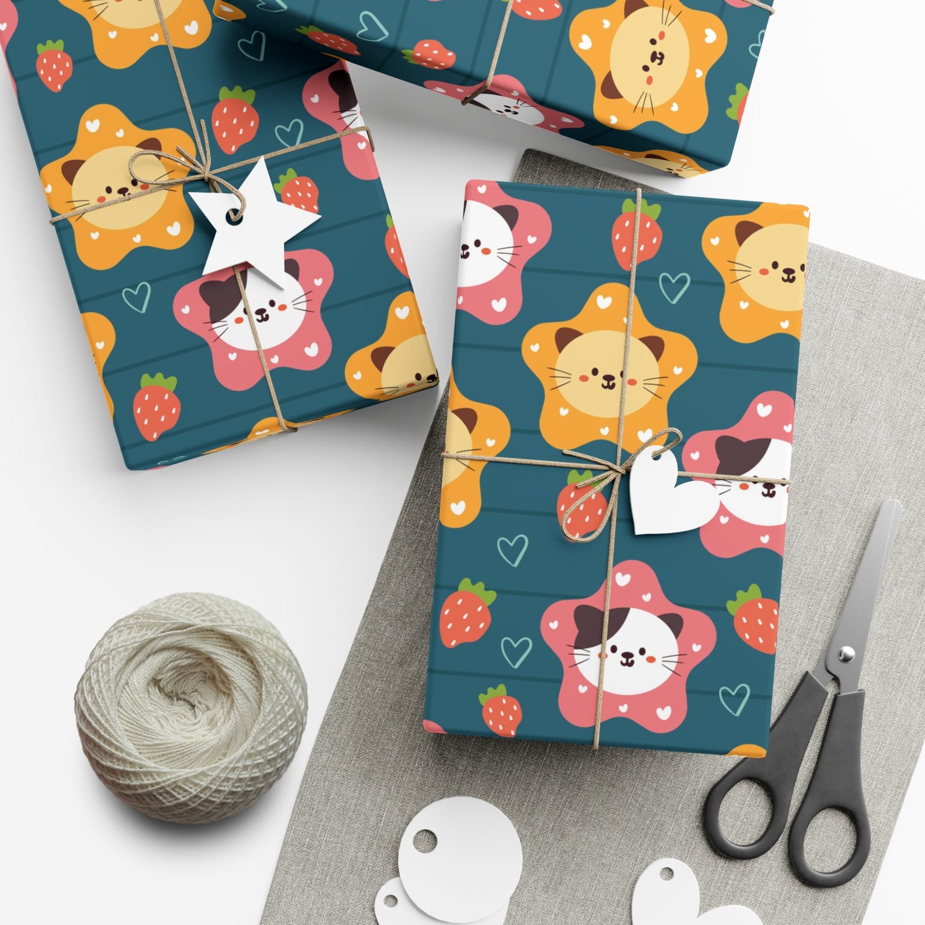 But what truly makes this gift wrap unique are the adorable cartoon kitty heads nestled inside star shapes, each one adorned with precious little hearts and surrounded by tiny strawberries. This delightful design is perfect for all occasions, whether you're wrapping a birthday present for your cat-loving friend or a "just because" gift for a special someone.