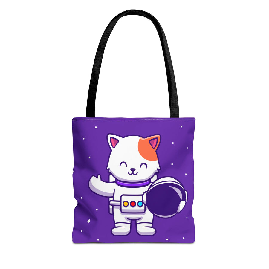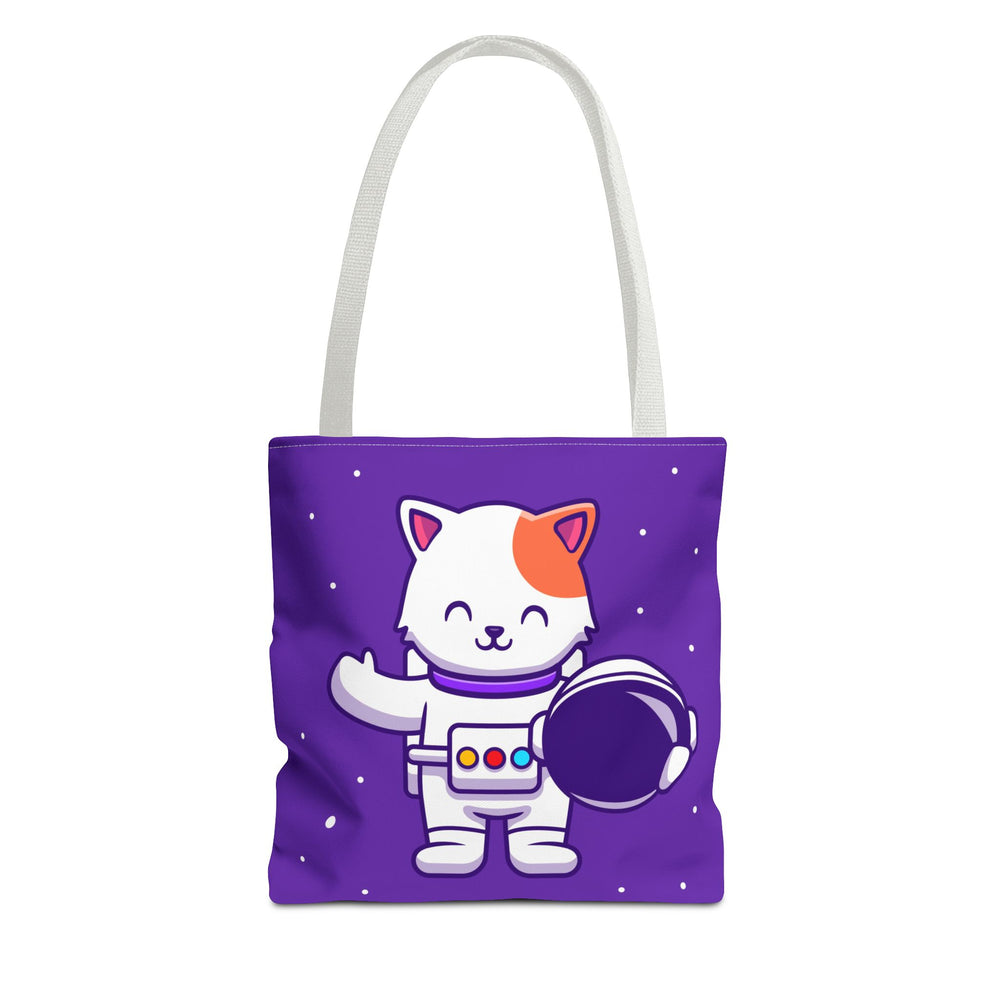 Calling all cat lovers and space enthusiasts! Introducing our incredibly adorable and out-of-this-world Astronaut Cat Tote Bag! Prepare to embark on a cosmic adventure with this charming purple tote bag featuring the most captivating combination of a smiling white cartoon cat in an astronaut suit, joyfully clutching an astronaut helmet. This captivating design is destined to turn heads and make a statement wherever you go!
